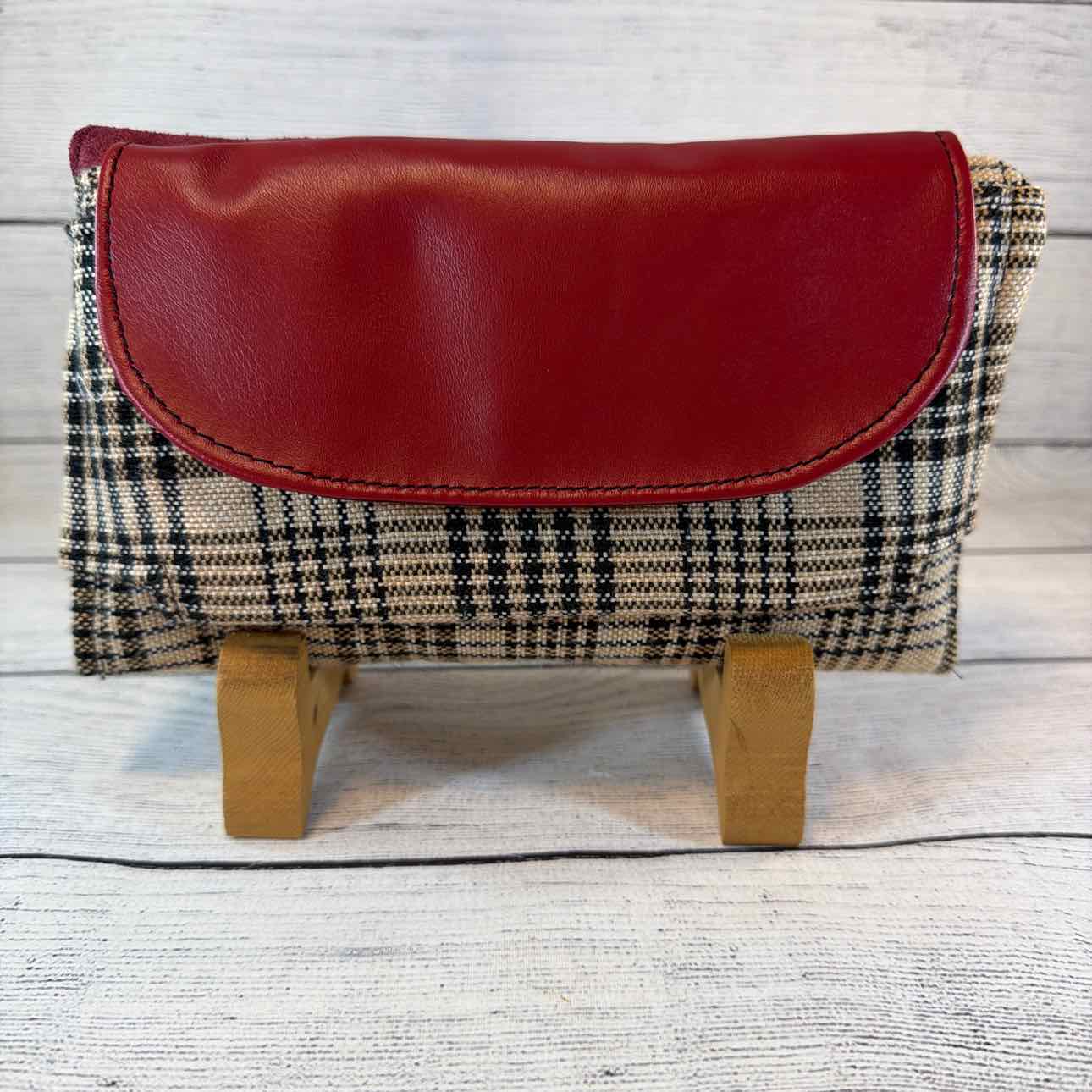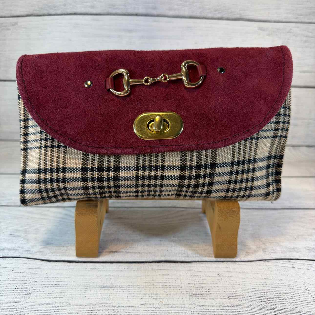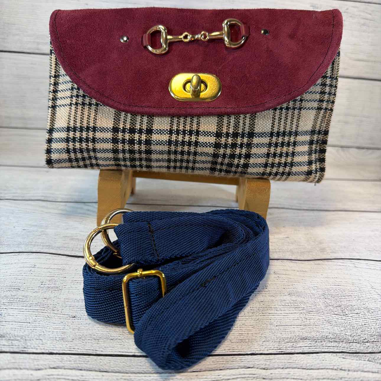 Custom Made Wallet/Shoulder Bag. Made from Baker Blanket, Suede and Faux Leather. Tan Baker Plaid with Burgundy Suede Flap with Snaffle Bit & Dots. Inside Pouches are Dark Pink with Antique Bronze Butterfly Zippers. Navy Nylon Shoulder Strap.