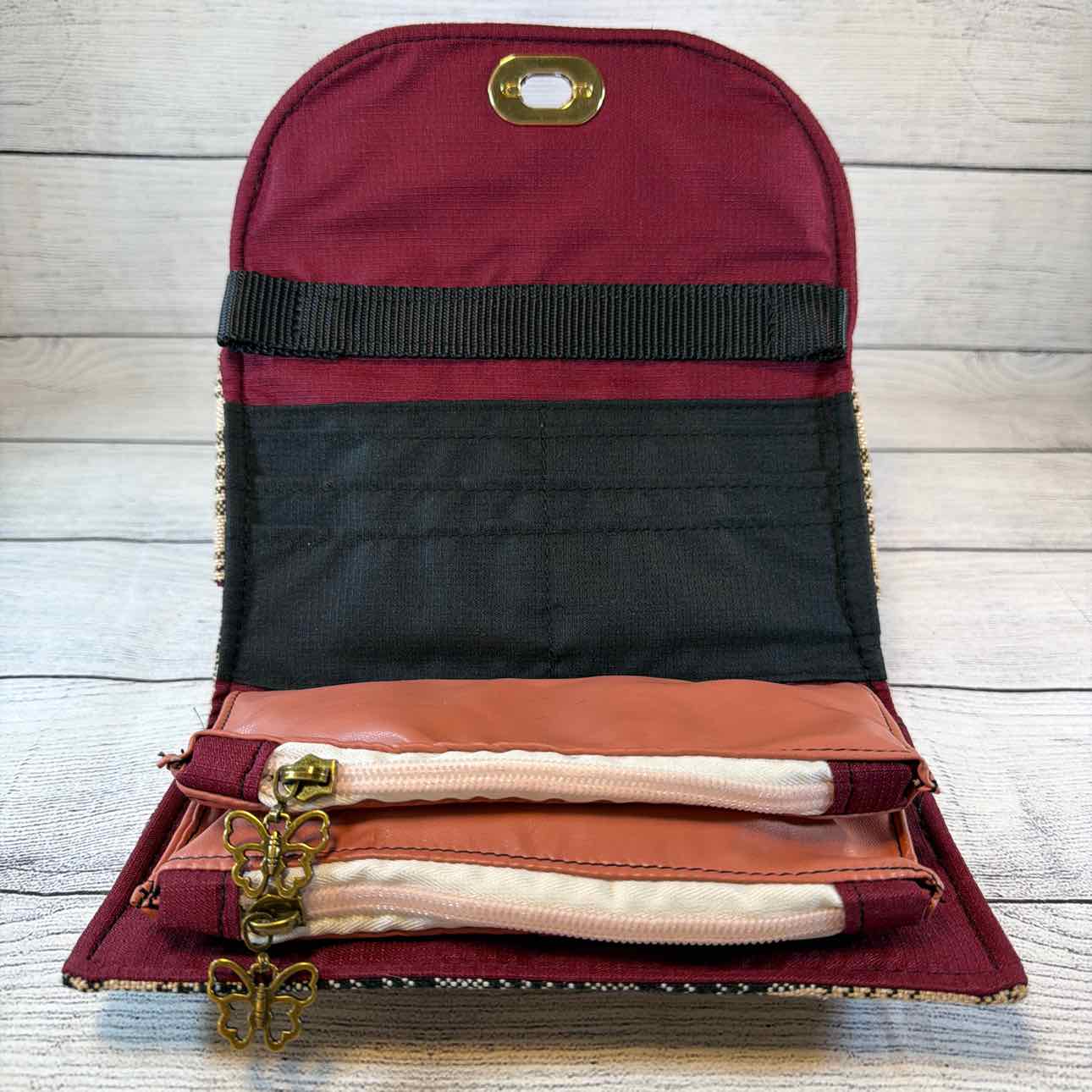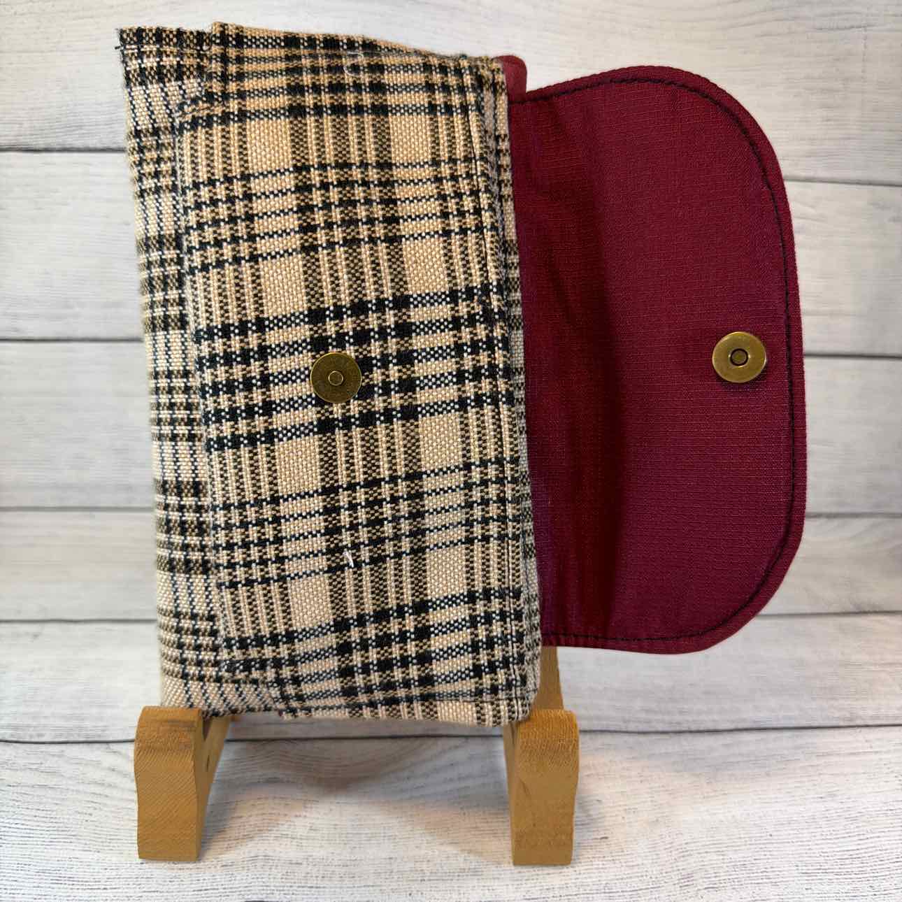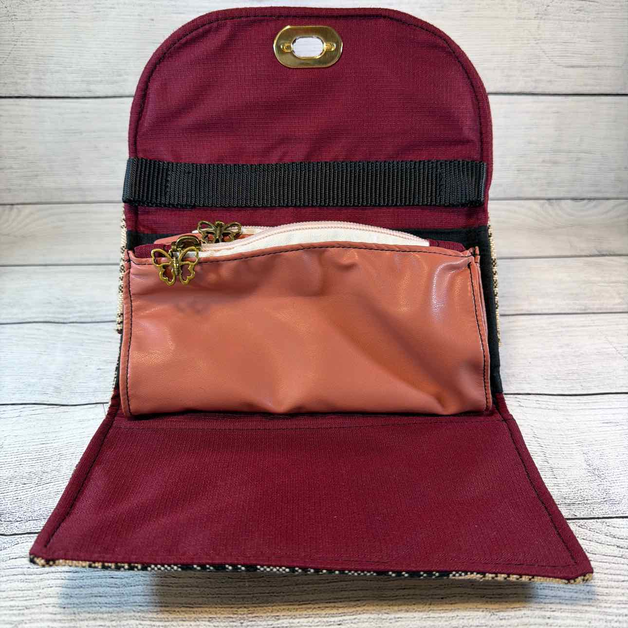 Custom Made Wallet/Shoulder Bag. Made from Baker Blanket, Suede and Faux Leather. Tan Baker Plaid with Burgundy Suede Flap with Snaffle Bit & Dots. Inside Pouches are Dark Pink with Antique Bronze Butterfly Zippers. Navy Nylon Shoulder Strap.