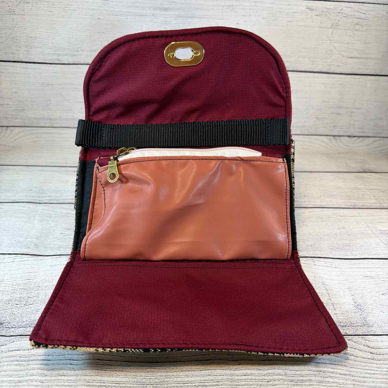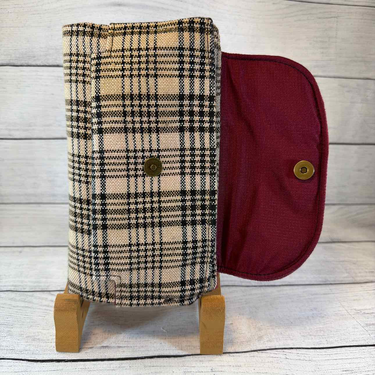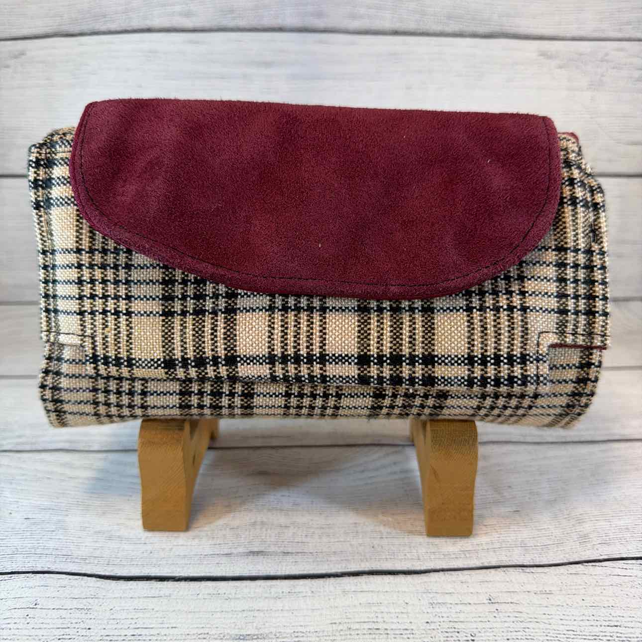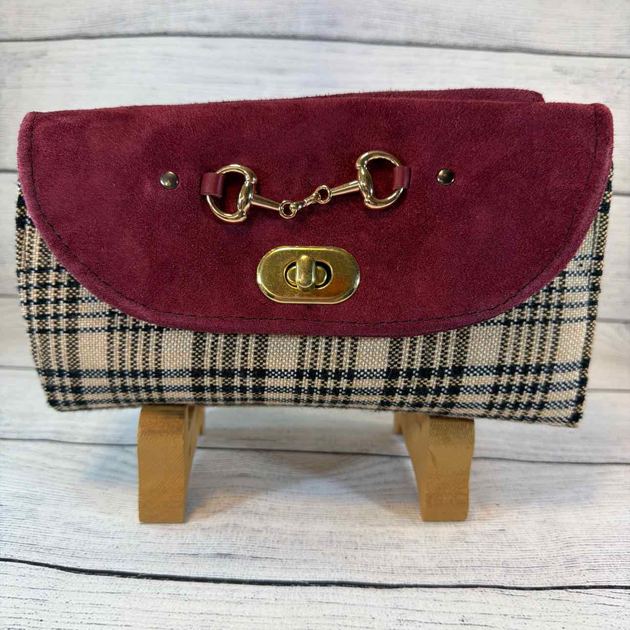 Custom Made Wallet/Shoulder Bag. Made from Baker Blanket, Suede and Faux Leather. Tan Baker Plaid with Burgundy Suede Flap with Snaffle Bit & Dots. Inside Pouches are Dark Pink with Antique Bronze Zippers. Black Nylon Shoulder Strap.