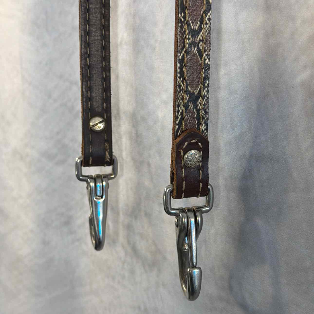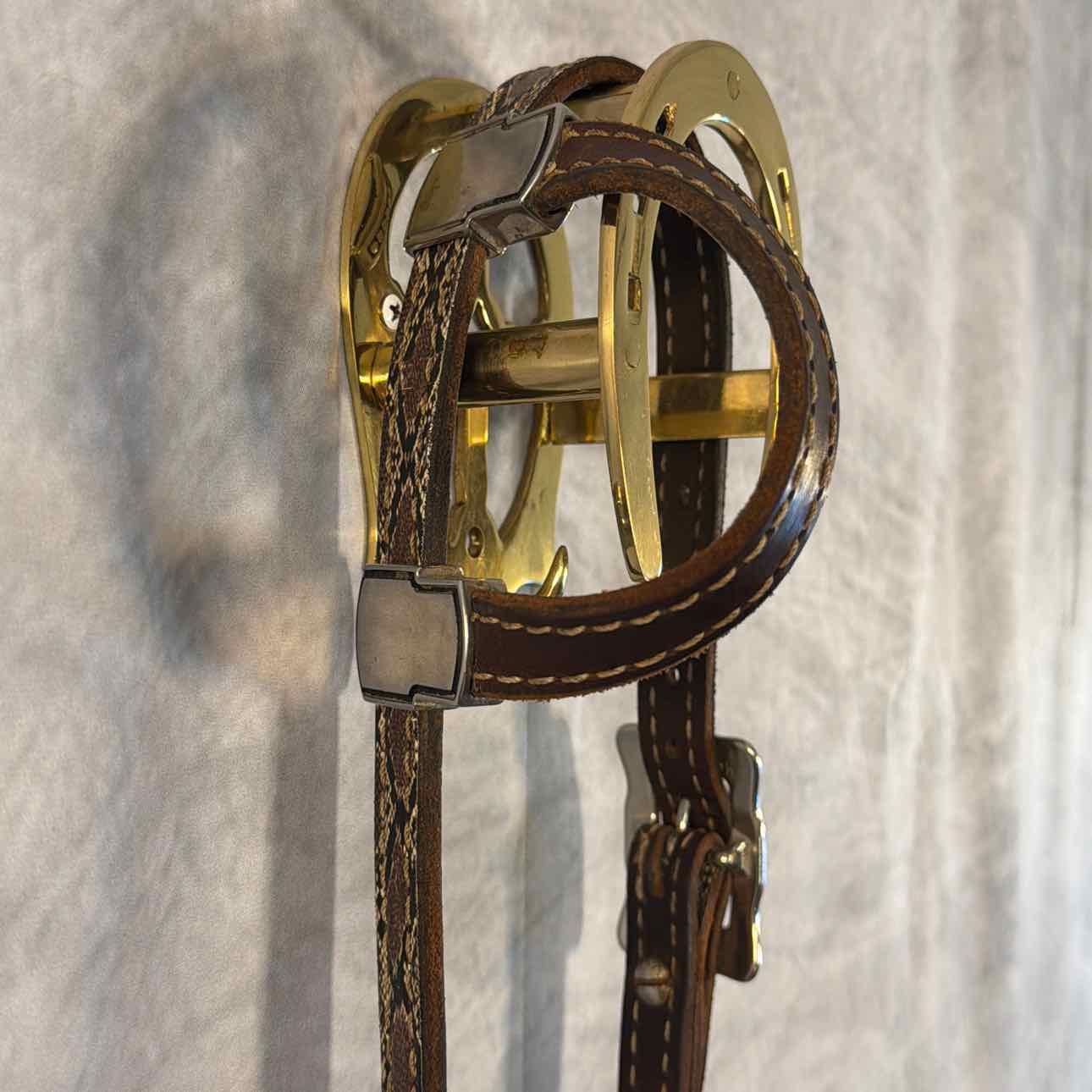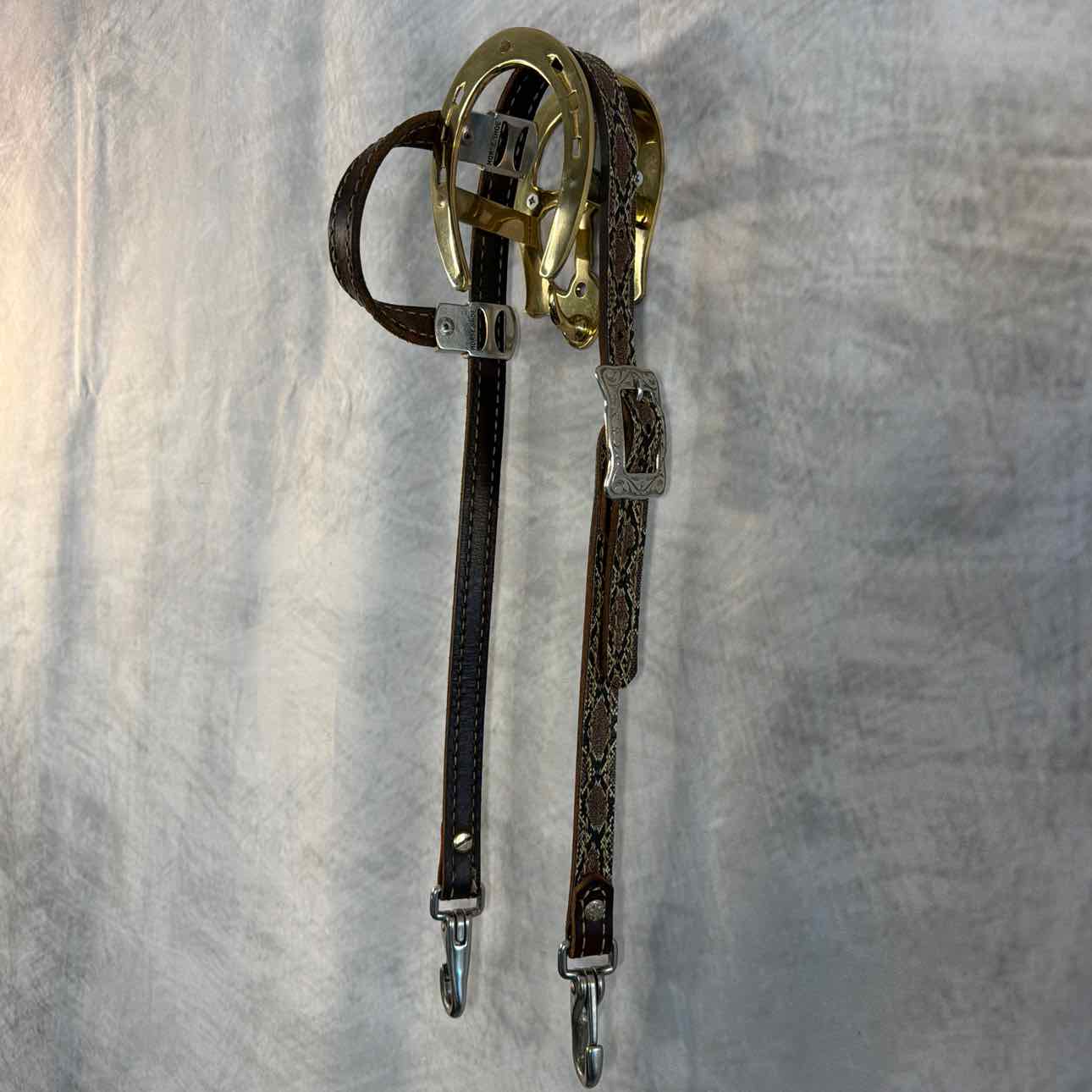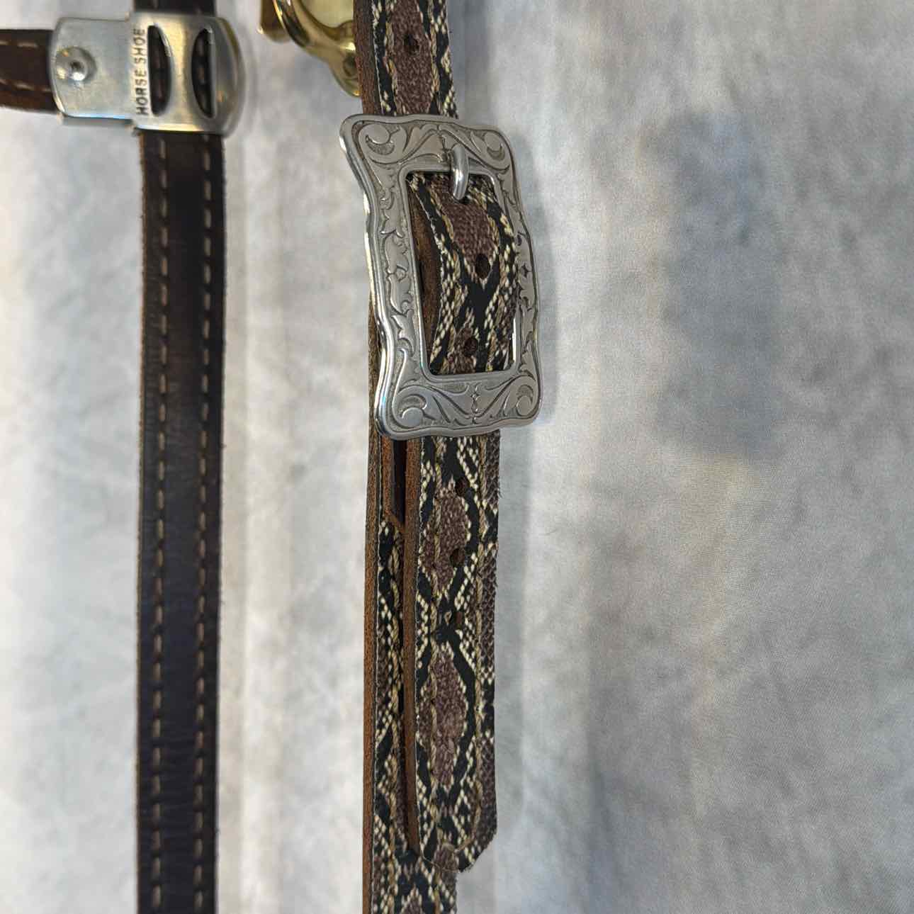Custom Made One Ear Headstall. Leather Snakeskin Print. Jeremiah Watts Hardware. Bit Hanger has Clips. Very Good Condition.
