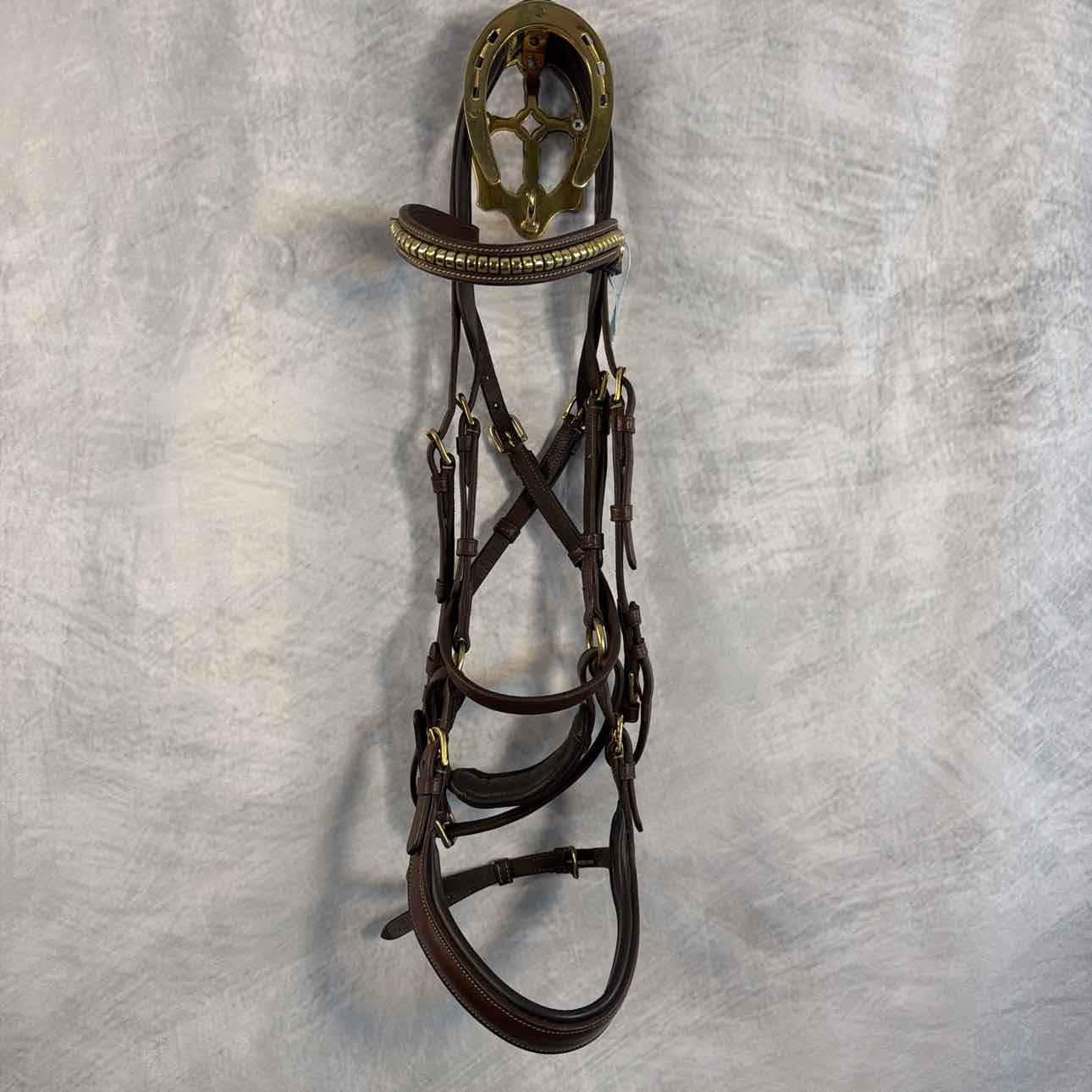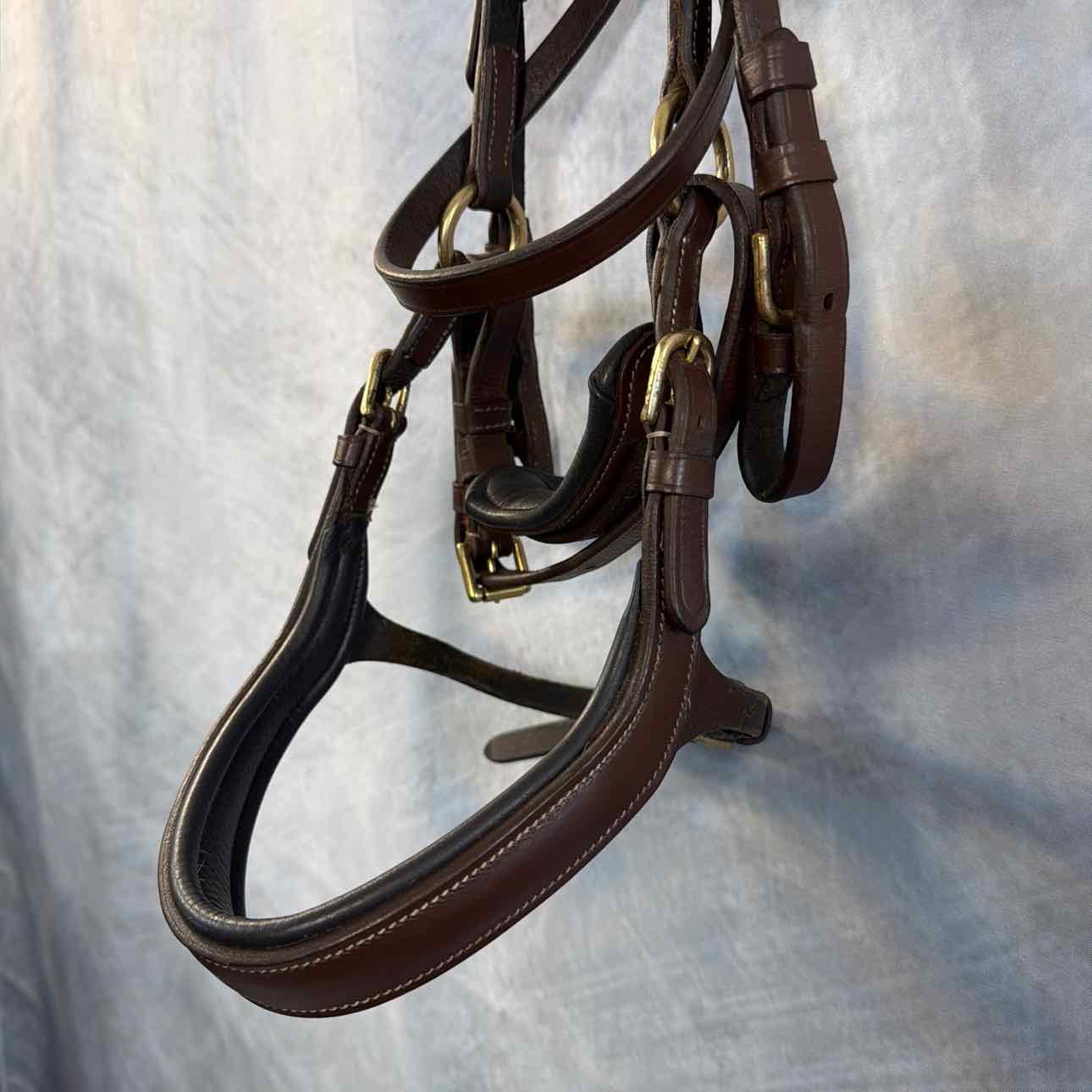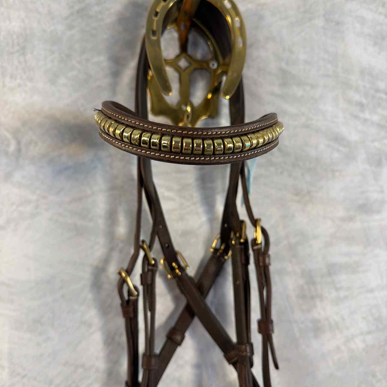 Dallas Bridle. Anatomic Jumping Bridle. Gel Padded Poll Relief. Like New Condition. Brass Hardware. Bit Hanger has Buckle Ends. Clencher Browband.