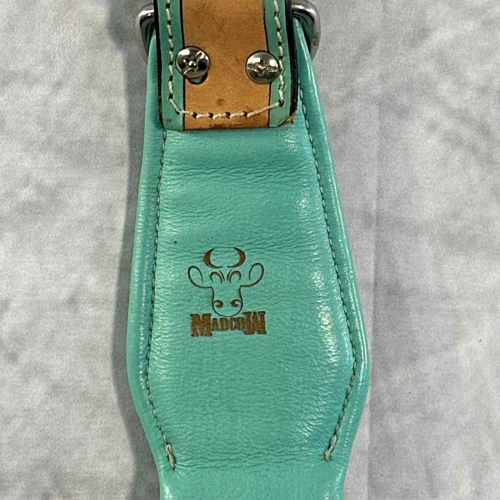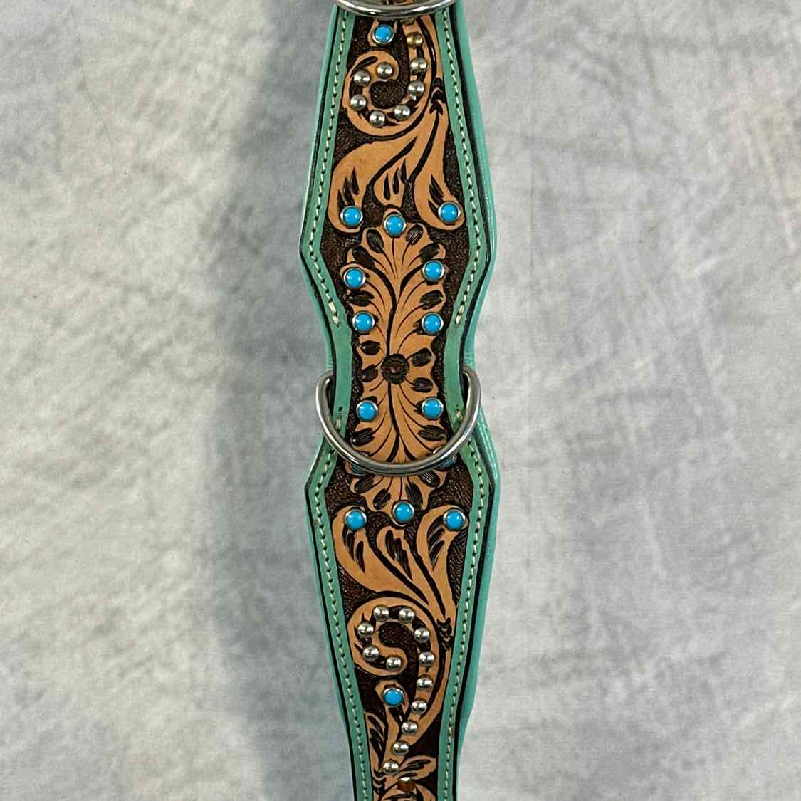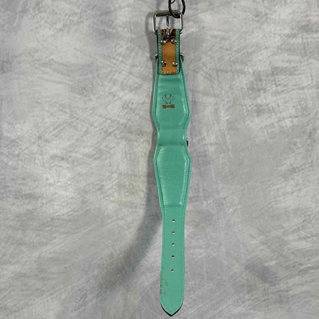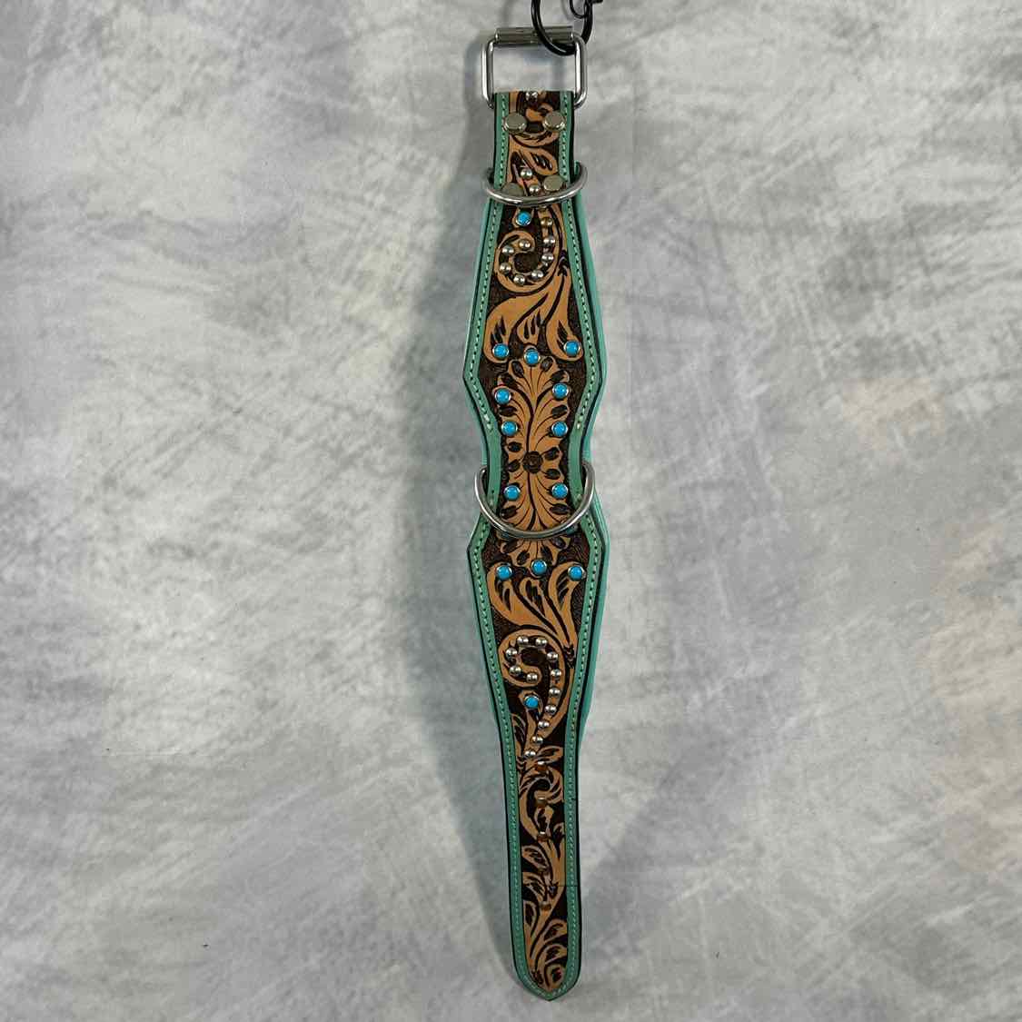 Padded Dog Collar. Turquoise Studs with Western Tooling. 2.25" Wide at the Widest Part. 14" - End of Leather to Middle Hole. Has Middle Ring for Leash. Excellent Condition.
