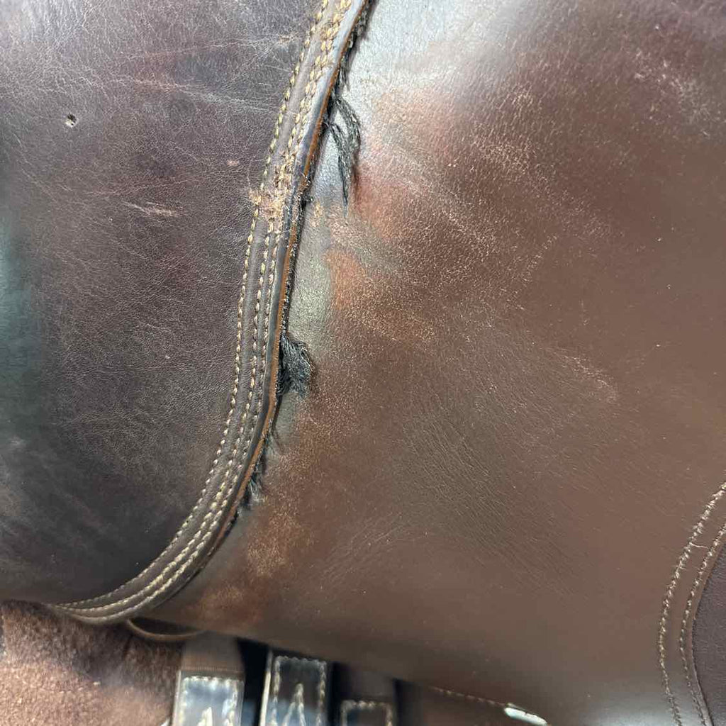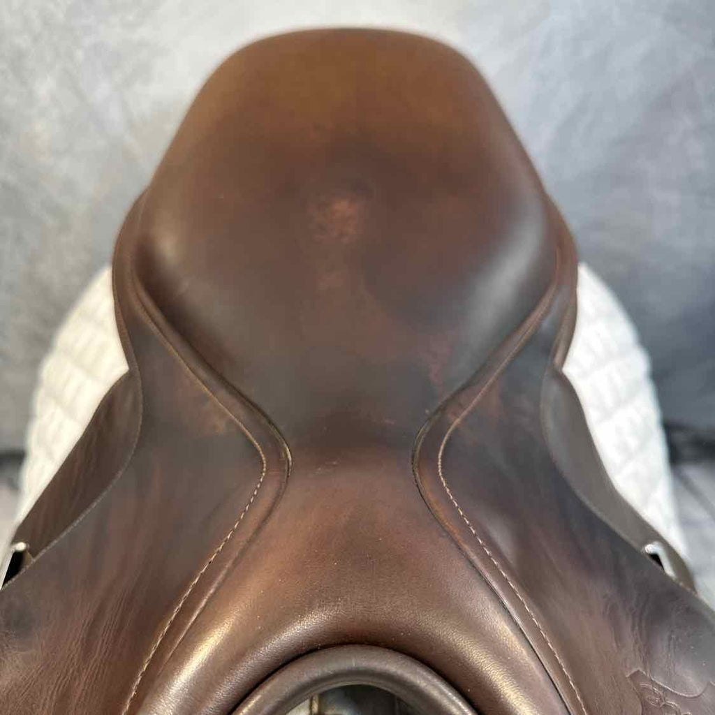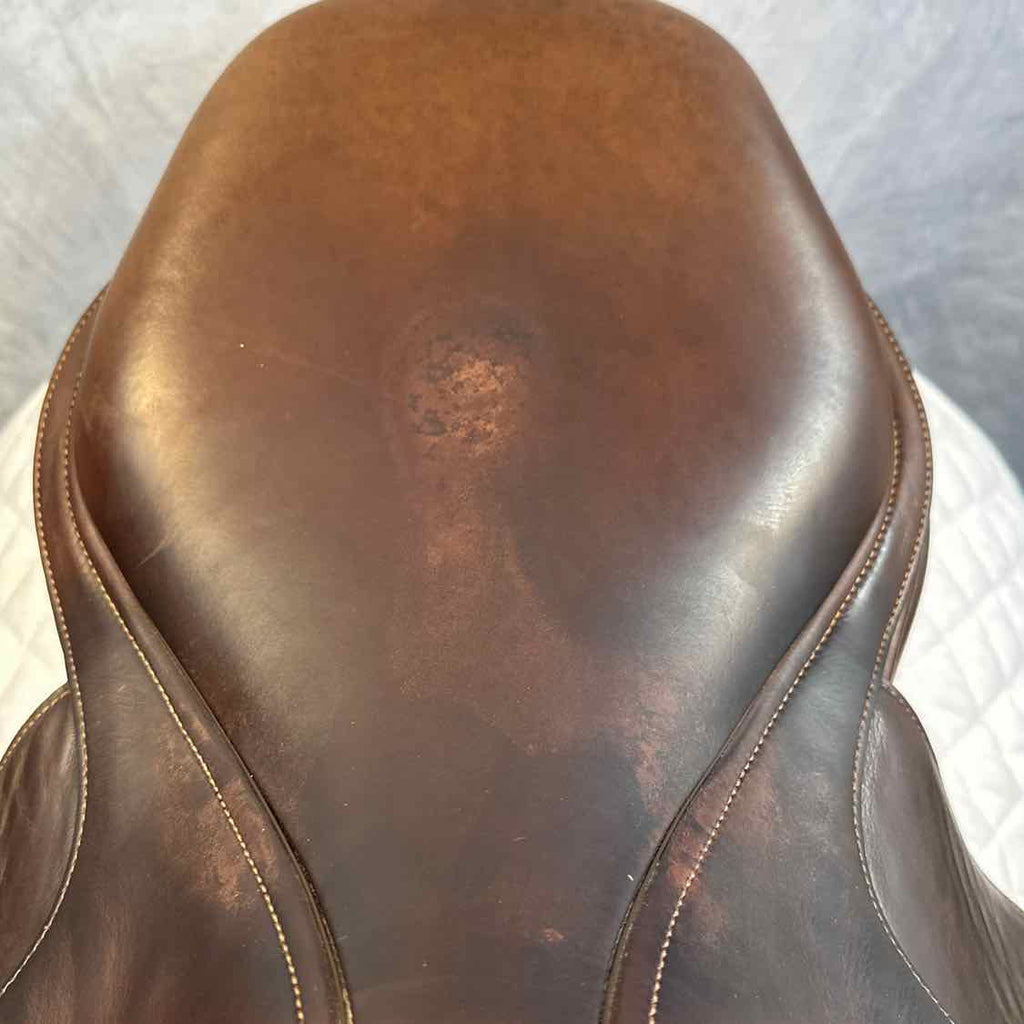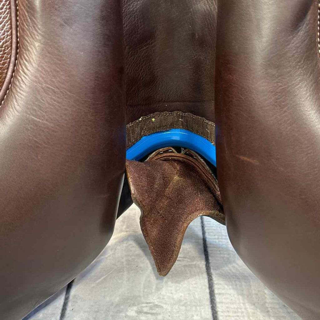 Caprilli Close Contact+ Luxe Leather Close Contact Saddle. Cair Panel. Adjustable with Gullets includes Blue Gullet (Medium Wide). Very Good Condition. Threads Showing on Flap and Minor Discoloration on Seat - See Detail Photos. Has Cover.