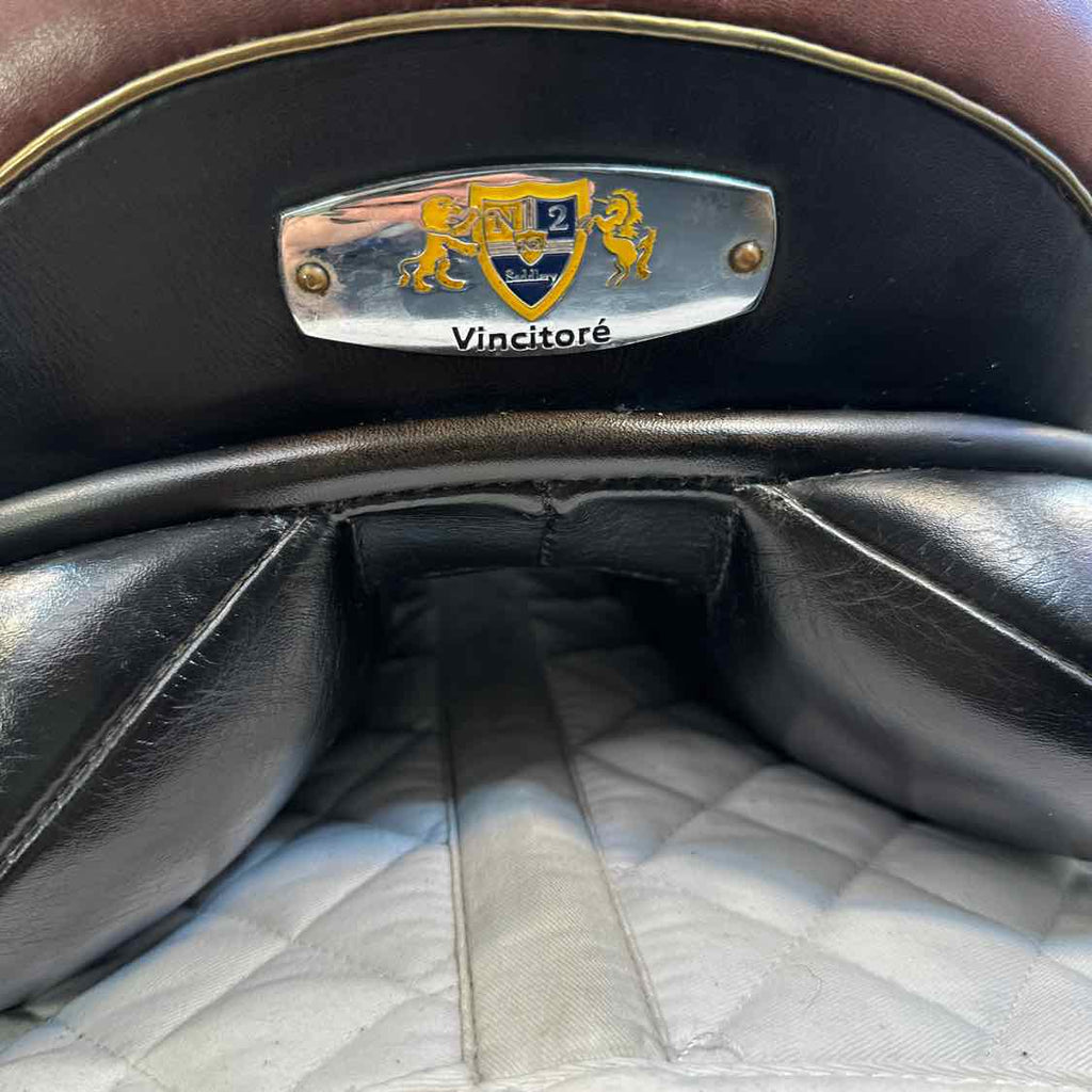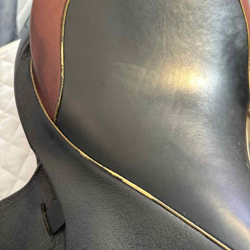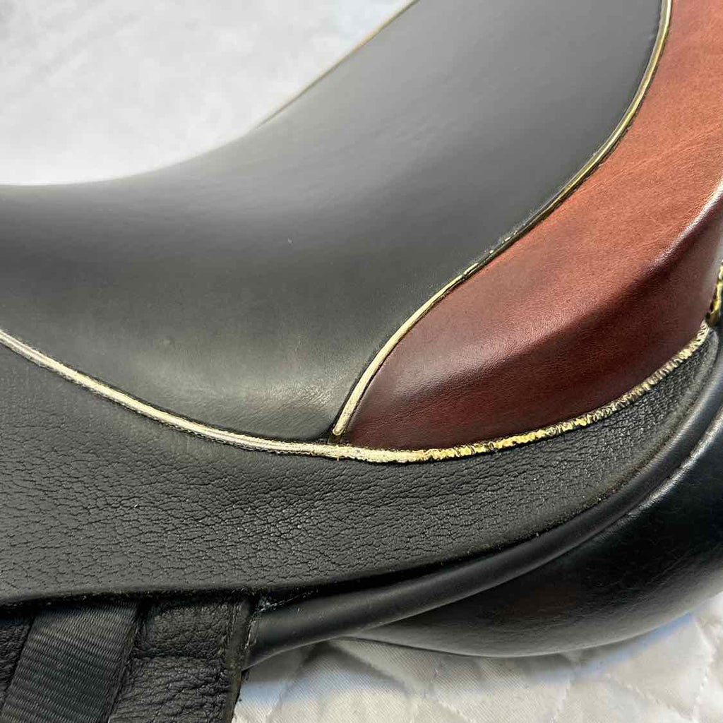Vincitore Monoflap Dressage Saddle. W (measures 5.5"). Flap 16". 2016. Black and Brown with Gold Piping. Has Cover. Gold Piping Worn Away - Cosmetic (see detail photos, a little sticky in some places).