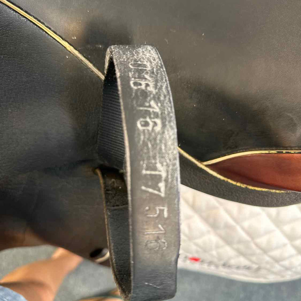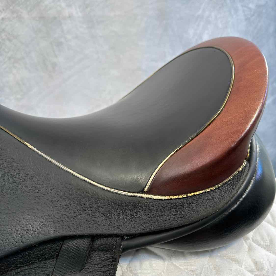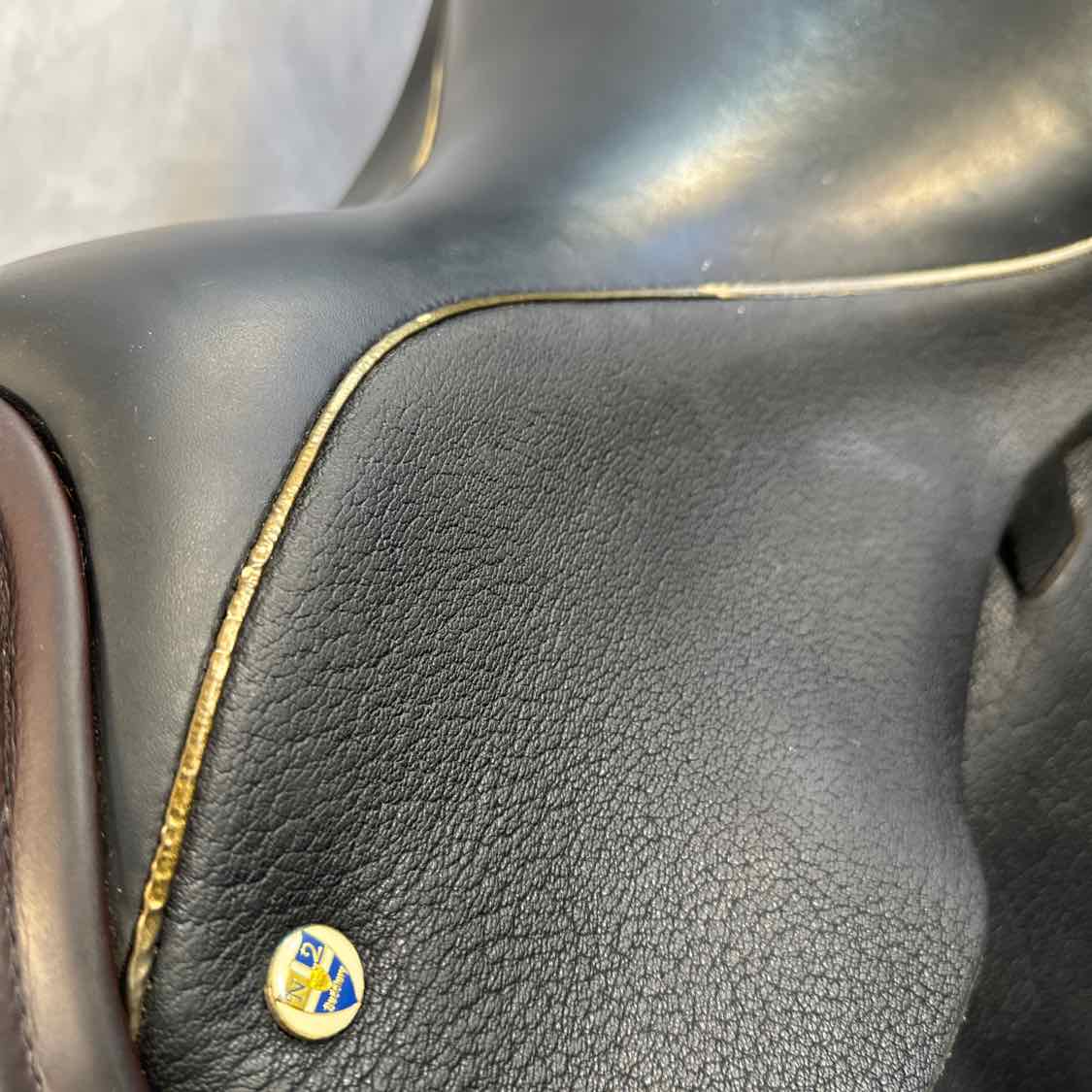 Vincitore Monoflap Dressage Saddle. W (measures 5.5"). Flap 16". 2016. Black and Brown with Gold Piping. Has Cover. Gold Piping Worn Away - Cosmetic (see detail photos, a little sticky in some places).