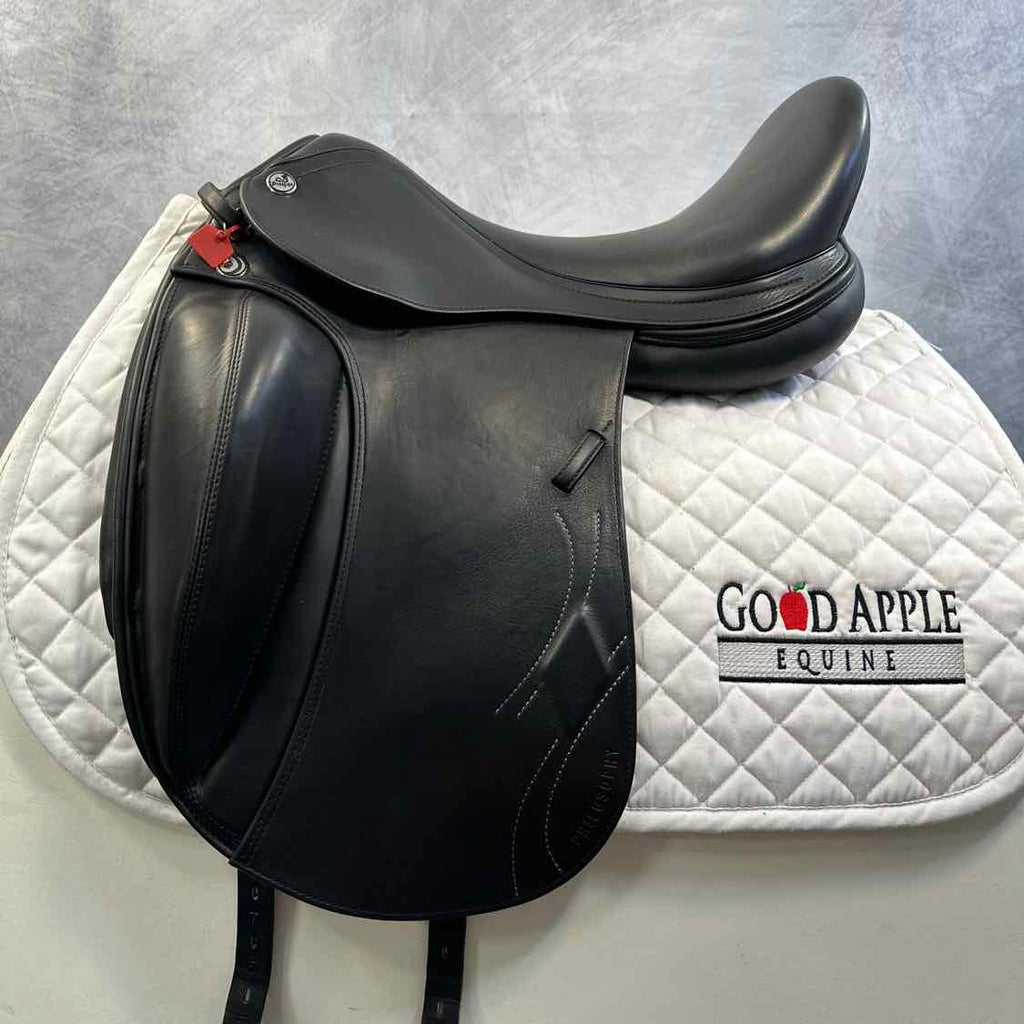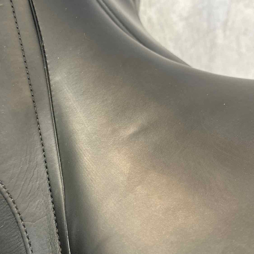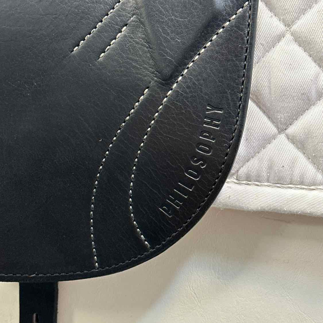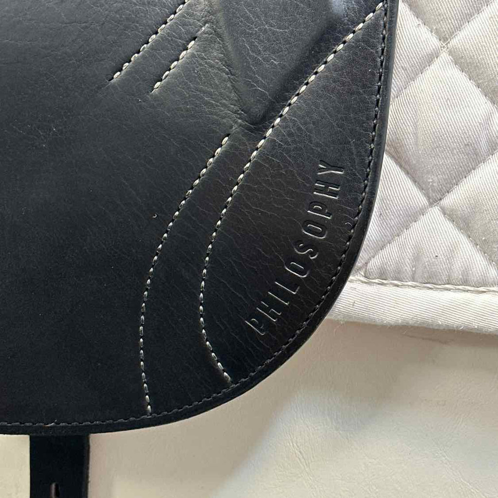 Philosophy Monoflap Dressage Saddle. M/MW (measures 5") 33cm. Flap 16". 2022. Excellent Condition. Has Cover. Logos Debossed in Left Side Flap and Seat. Minor Scratch on Left Front, Pucker in Seat and Scratches on Lower Right Flap. See Detail Photos.