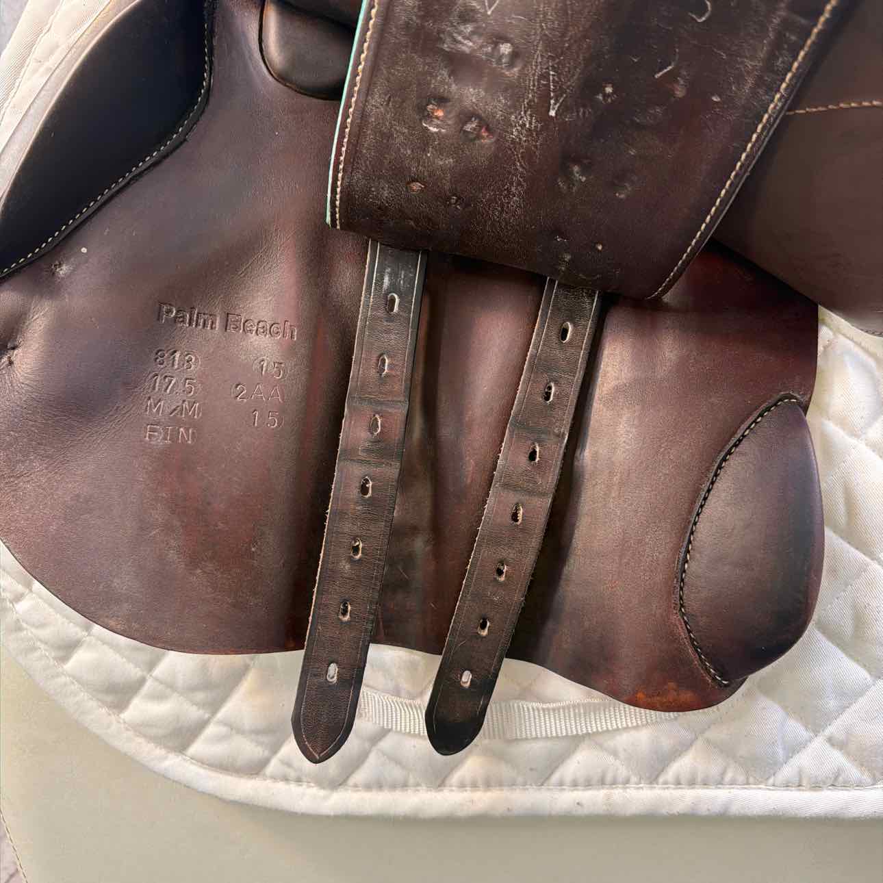 Palm Beach Close Contact Saddle. W (measures 5.5"). Flap 13". 2AA. 2015. Has Cover, Voltaire Leathers and Herm Sprenger Bendy Irons. Great Condition with Regular Wear.