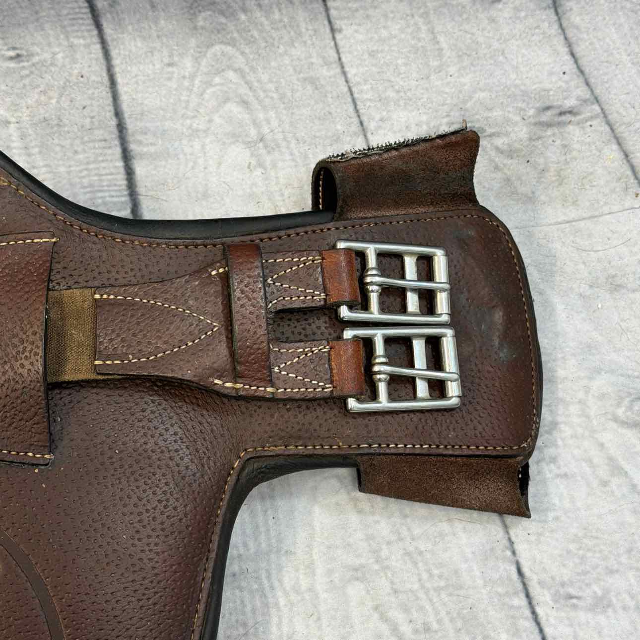 Short Bellyguard Stud Girth. Great Condition. Velcro Buckle Cover/Protectors. Small D Ring at Center with Leather Buckle Loop. Stainless Steel Hardware. Stamped SCB.