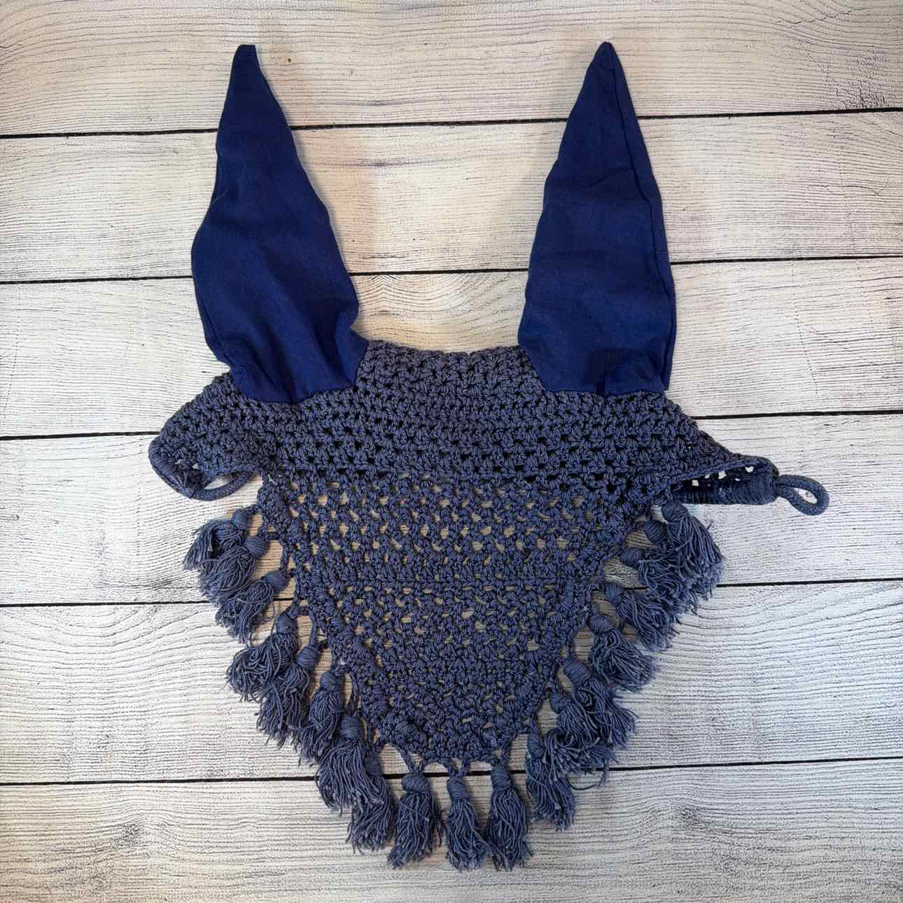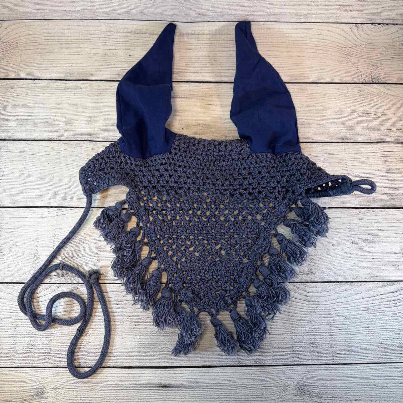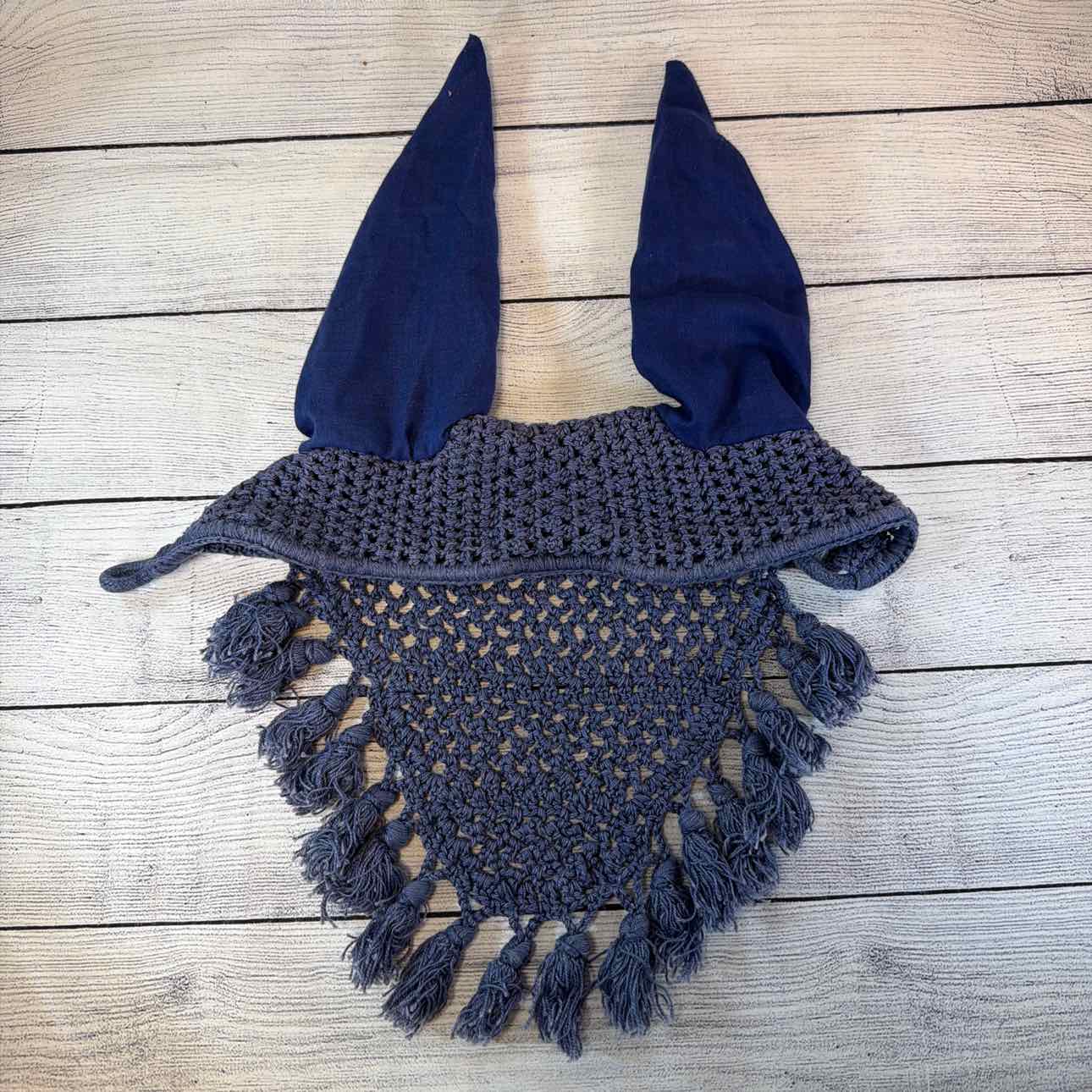 Crochet Ear Bonnet with Tassels. USED. Has Throat String and Loop.
