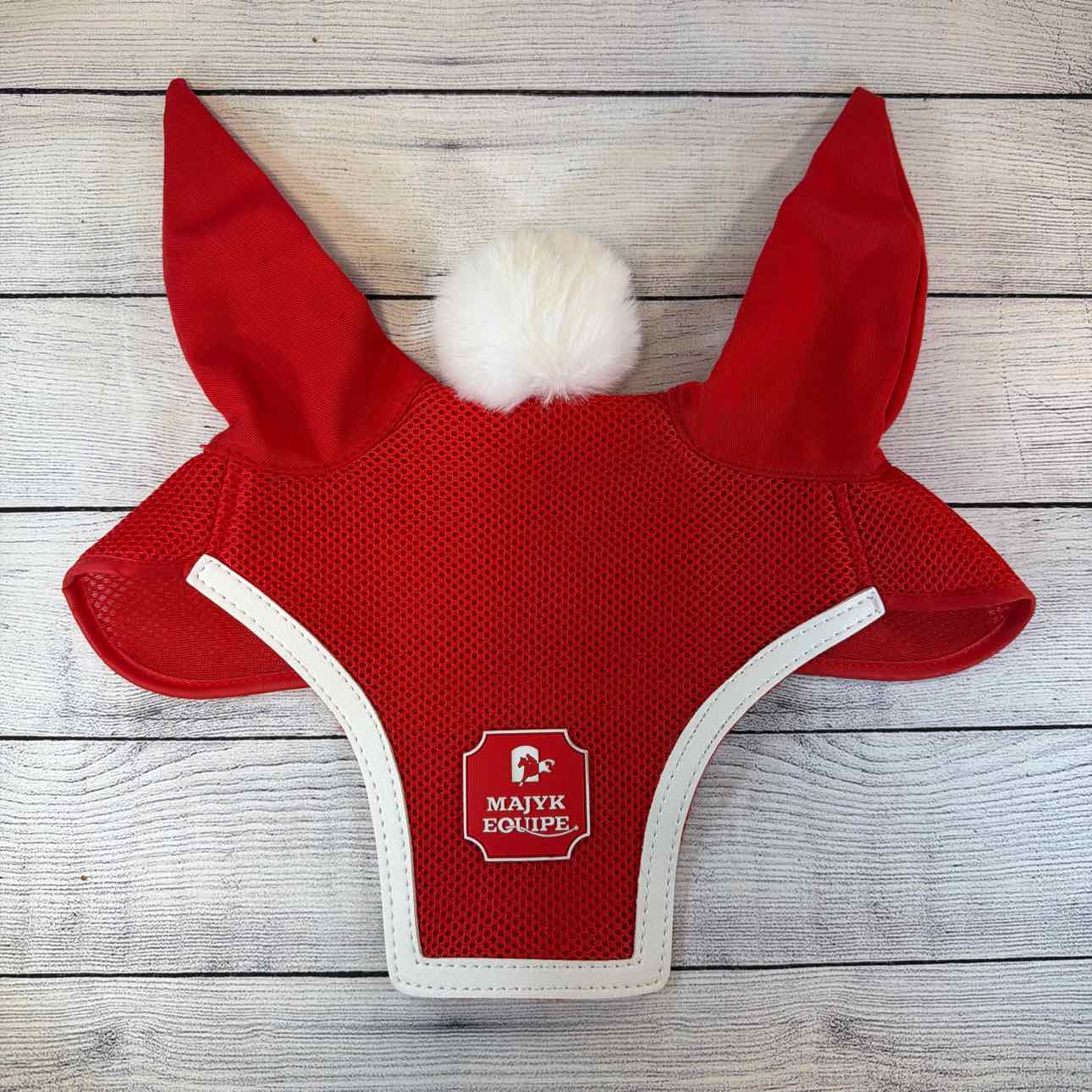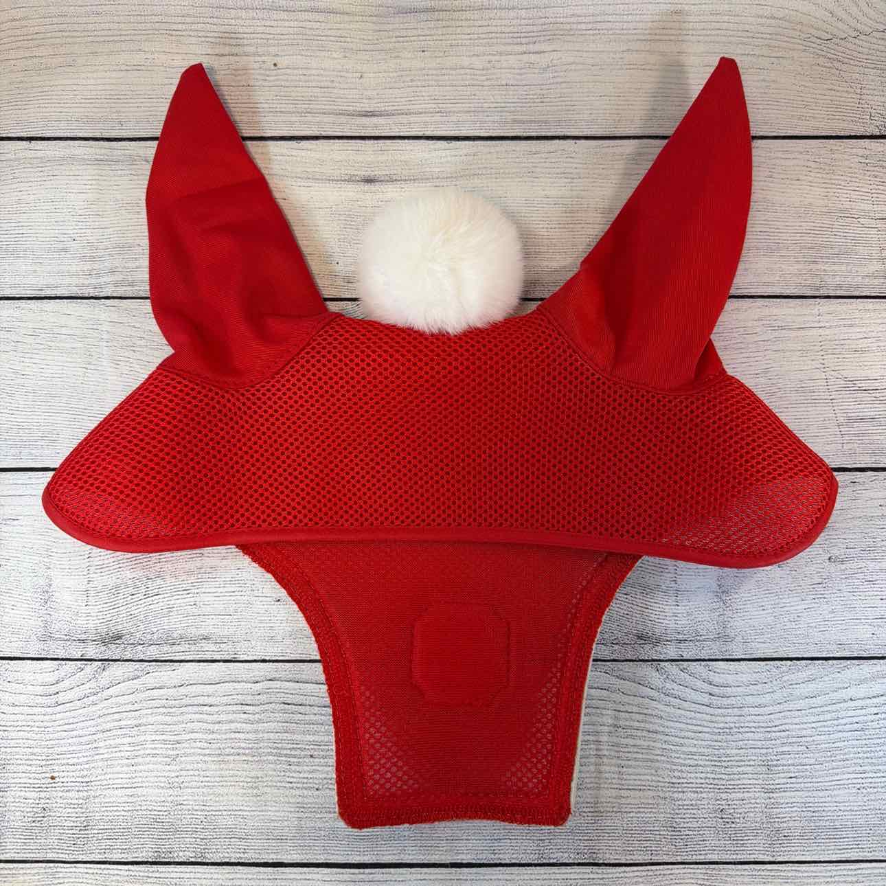Mesh Ear Bonnet. White Faux Leather Trim. Logo on Front Center. Pom Pom in Top Middle. Christmas Ear Bonnet.