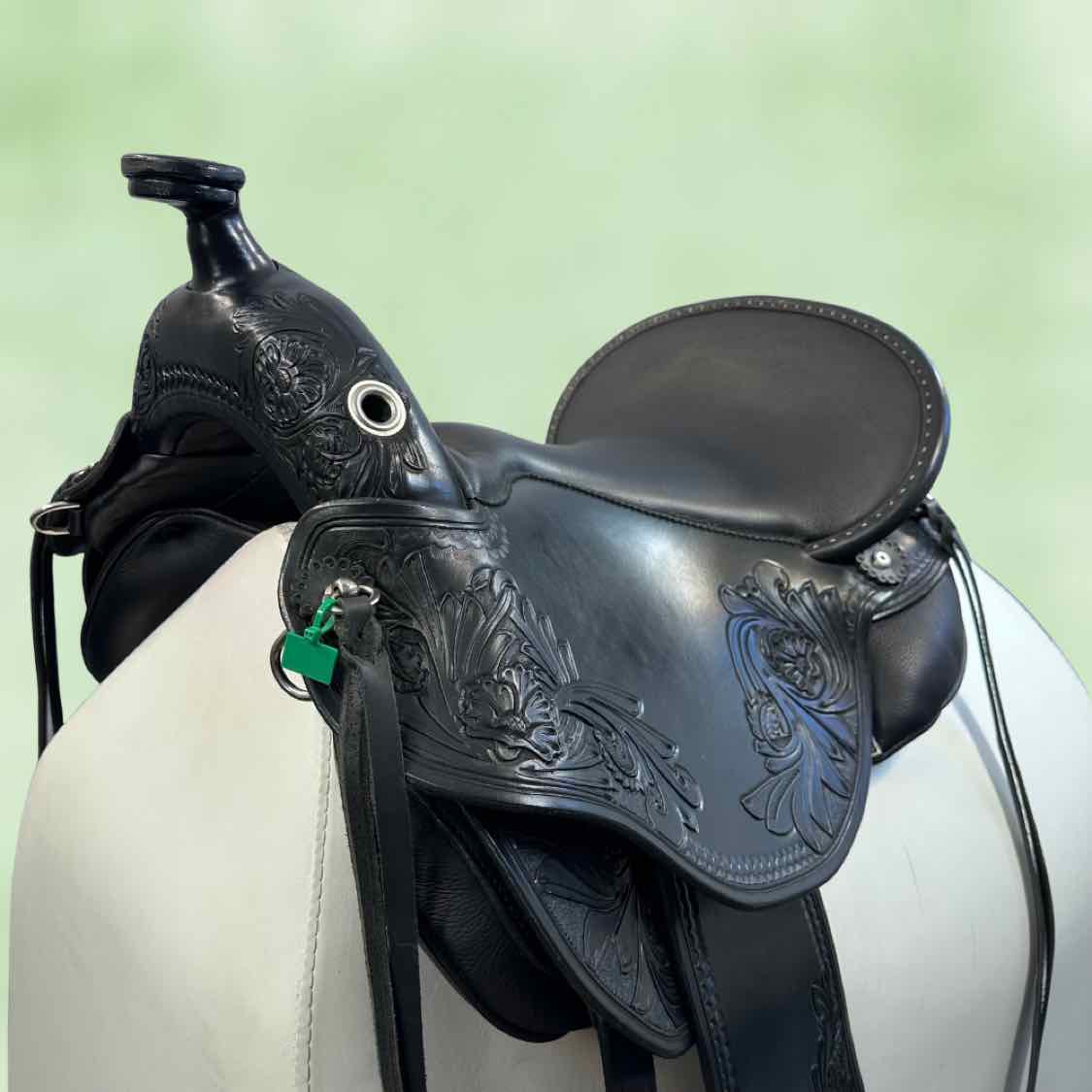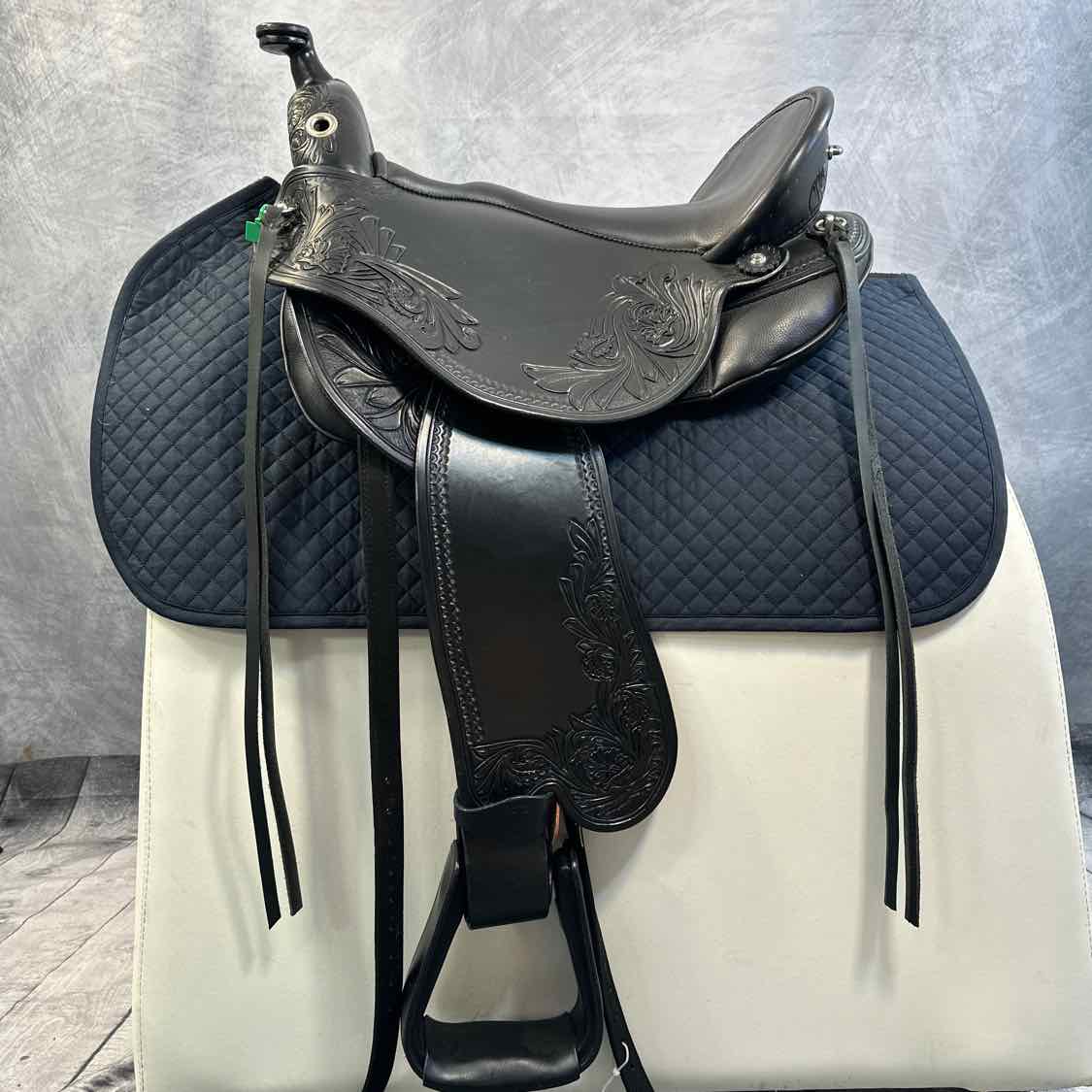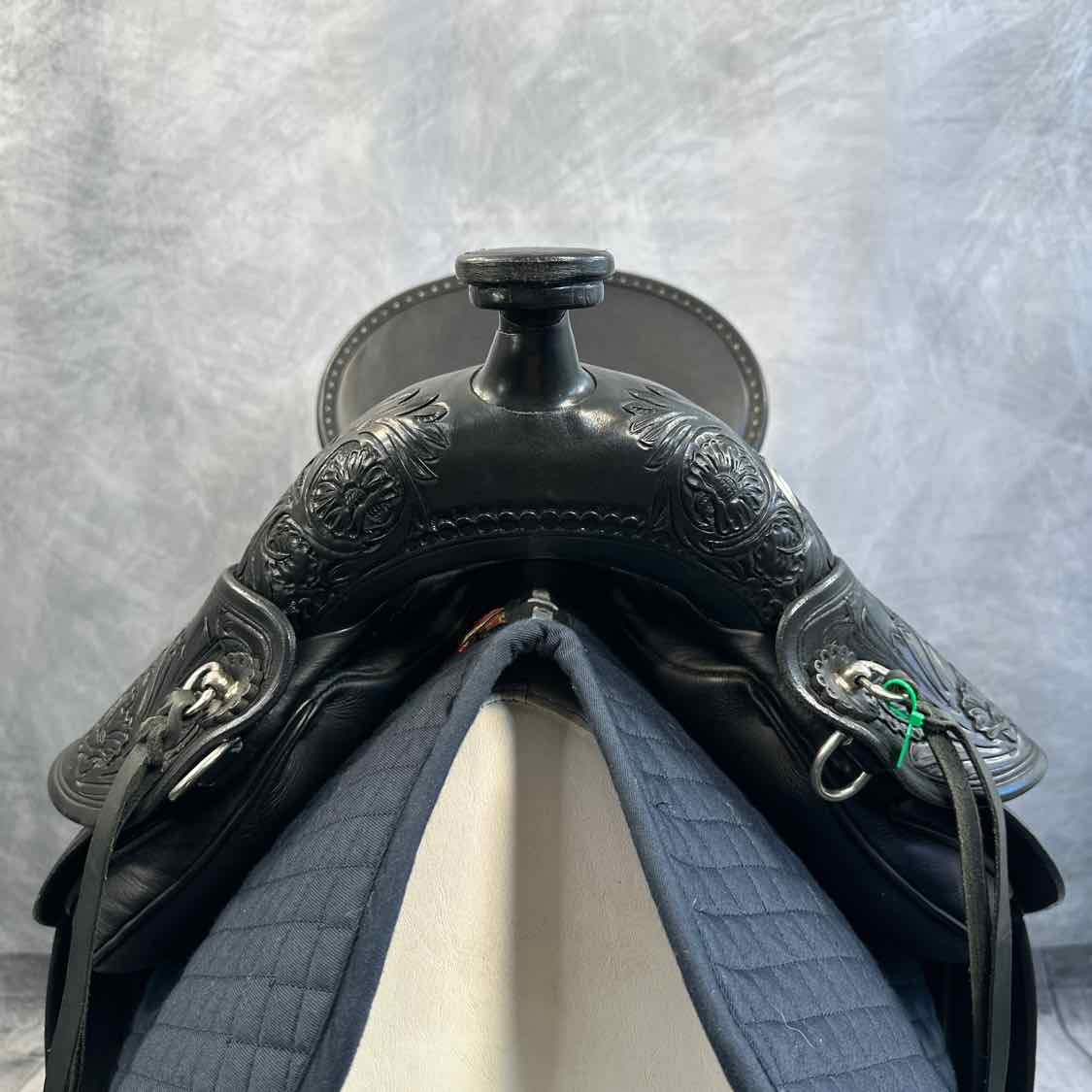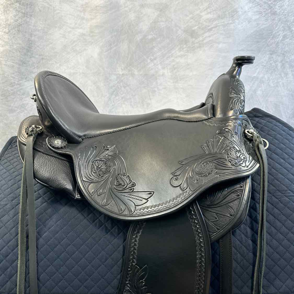 NEW 1216 Quantum Short and Light Western Dressage Seat Saddle. With Border Tooling 1105 and Flower Tooling PM50. Medium Fenders Set back 1cm. English Billet Rigging. Fully Adjustable with Key. Includes Cover and Key.