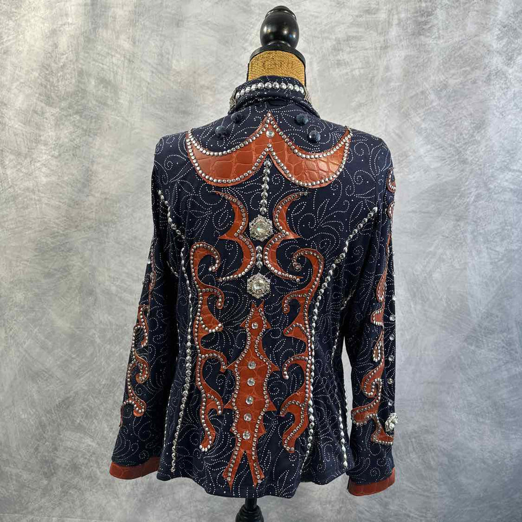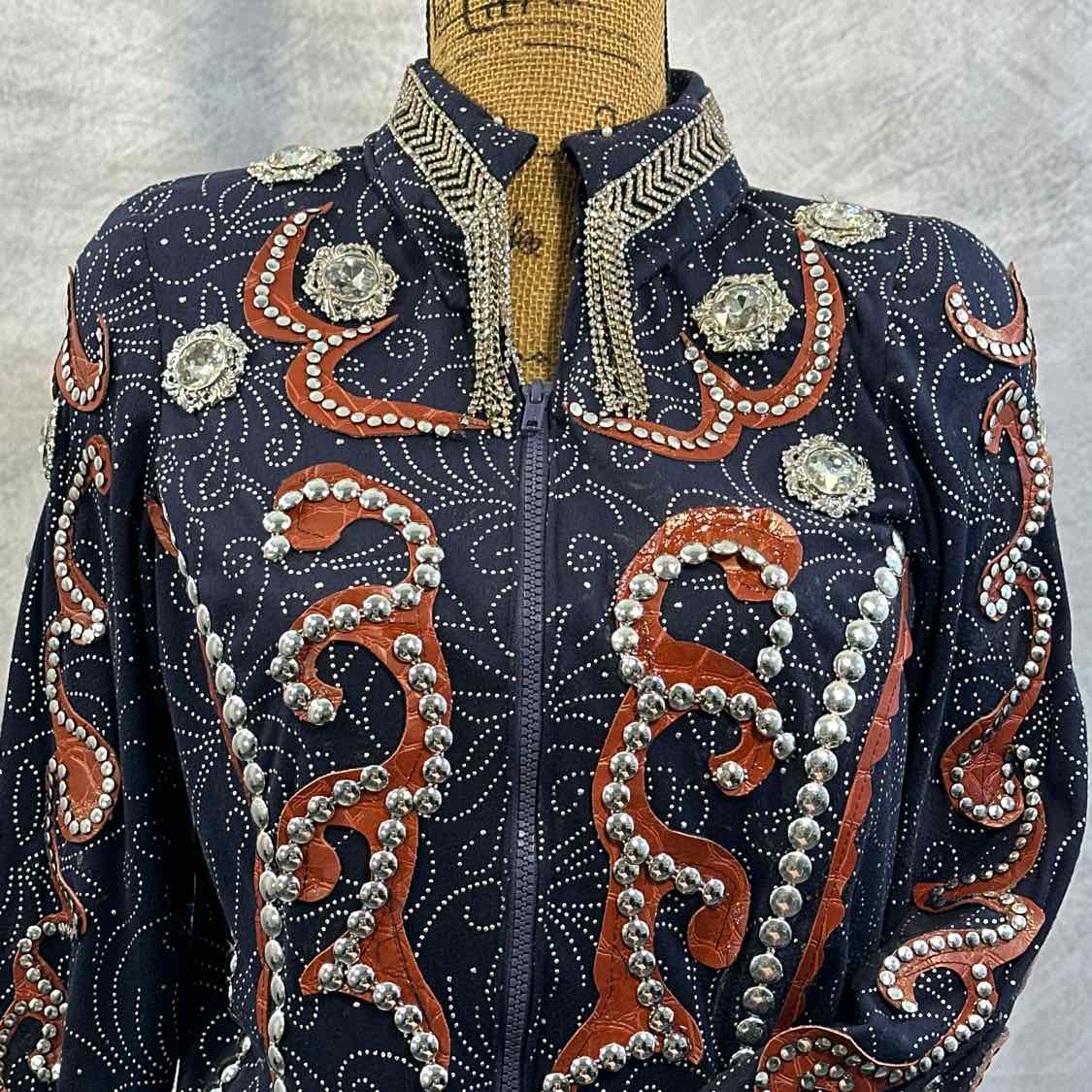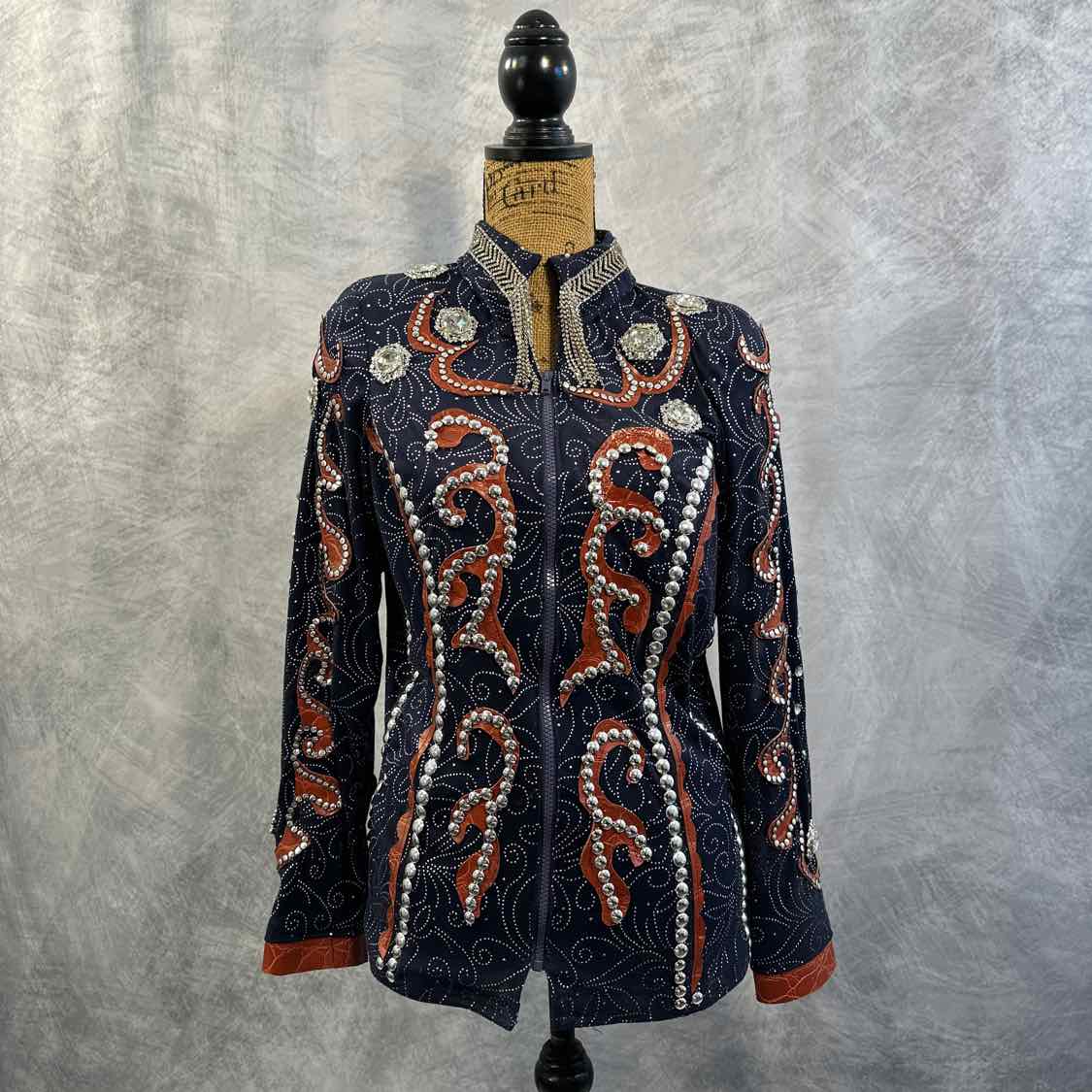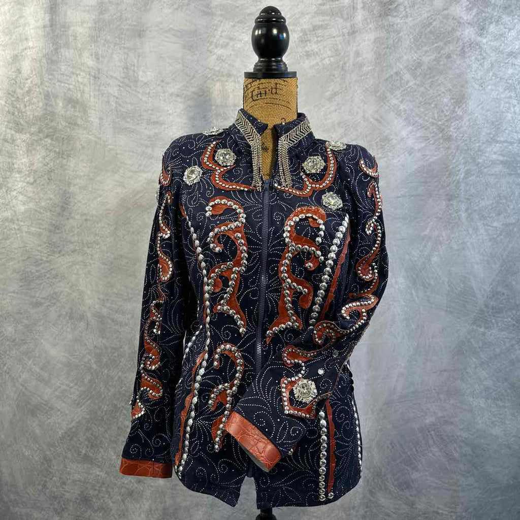 Handmade Navy Show Jacket with Brown Faux Leather and Silver Conchos/Crystals. Stretchy Material. Shoulder Pads. Some Silver Dots May Need to be Adjusted and/or Re-Glued.