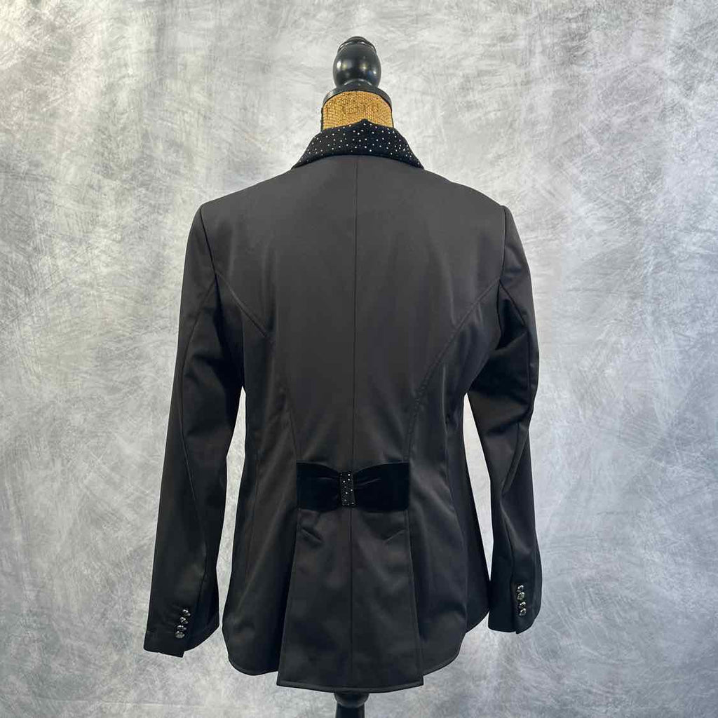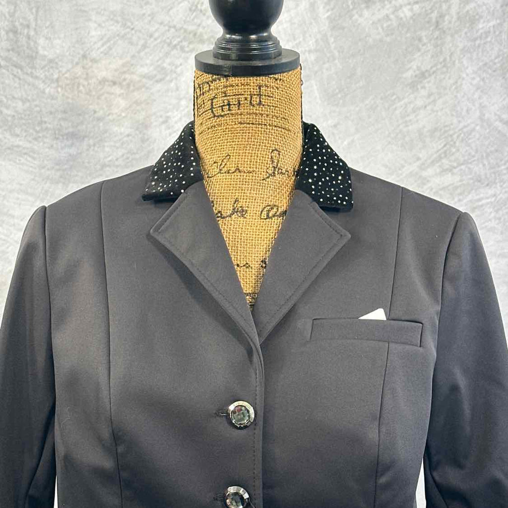 NEW Dressage Coat Short Tails. Labeled XX-Large, 44. Velvet Collar with Clear Crystals. Velvet Points with Crystals. White Pocket Square. Set of Plain Velvet Points and Extra Buttons Included. Still Has Tags.