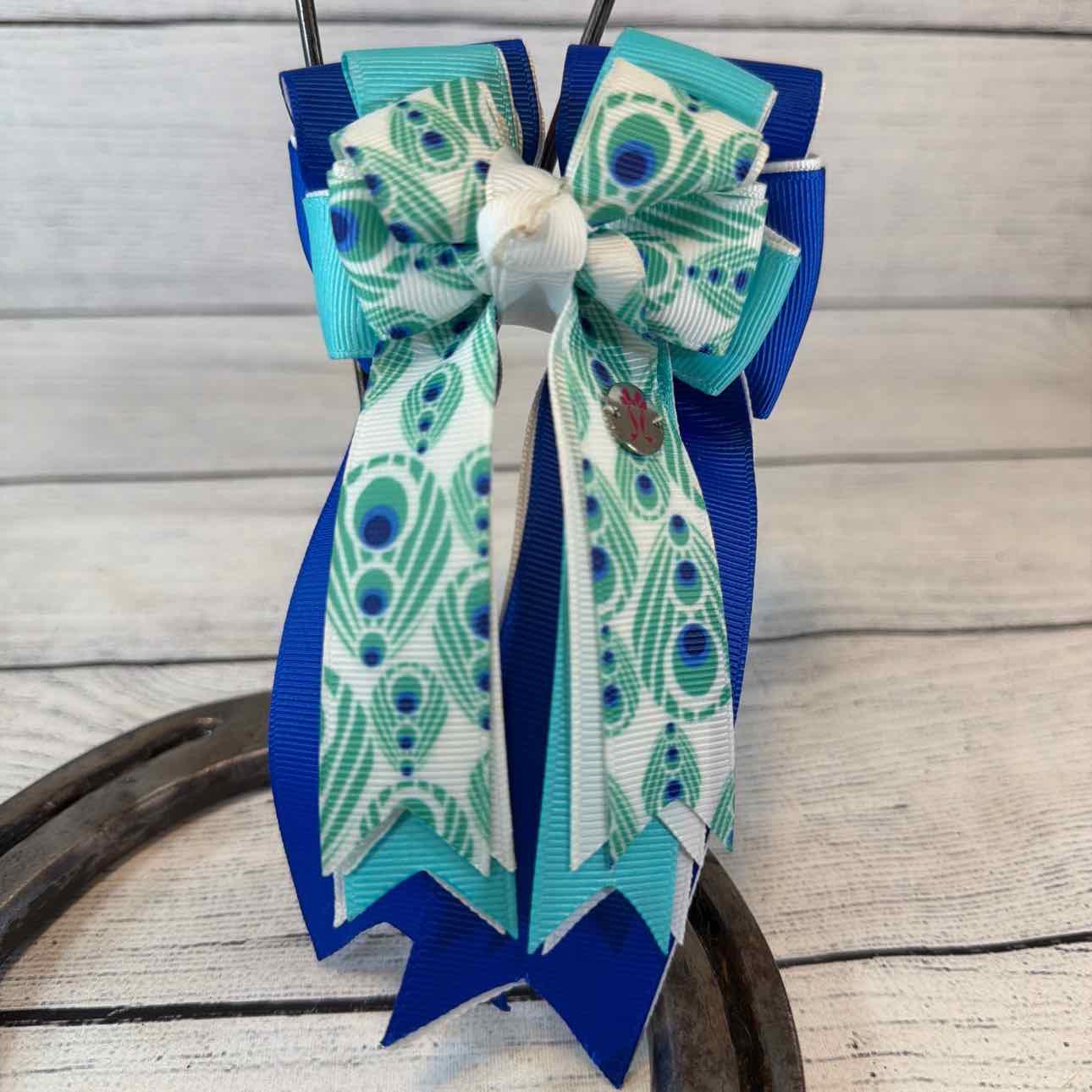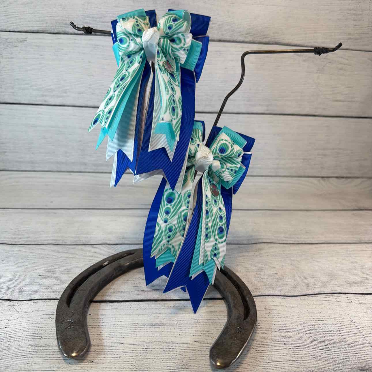 Triple-Layer Show Bows. PAIR. Royal Blue, Turquoise and White with Peacock Pattern. Attached to a Sturdy French Barrette. Perfect for Shows or Fun for Everyday Wear. Like New Condition.