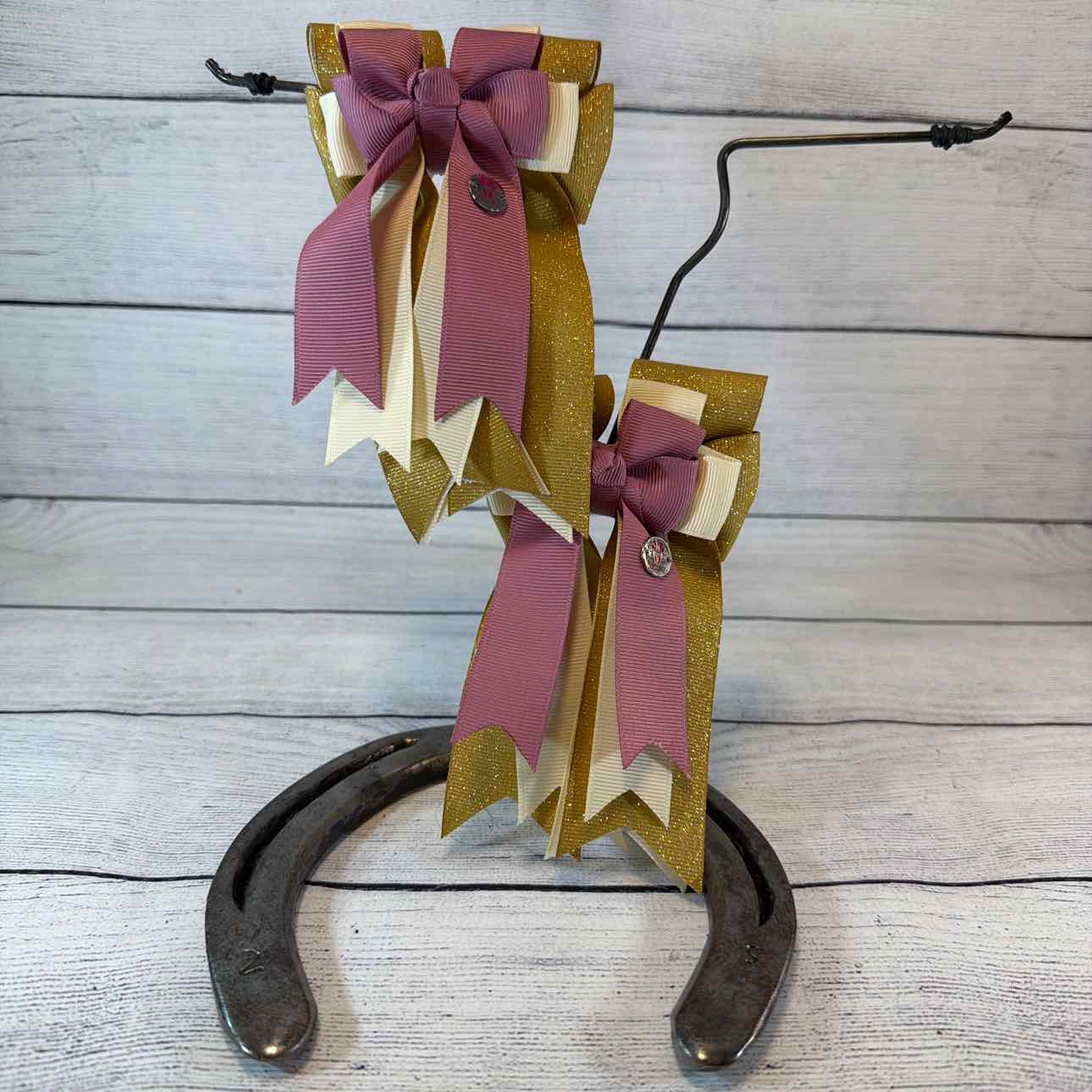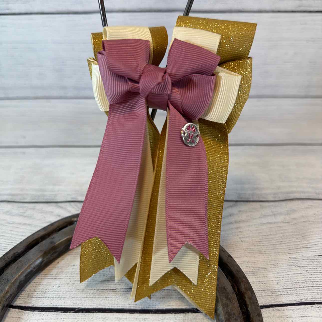 Triple-Layer Show Bows. PAIR. Gold Glitter, Beige and Mauve. Attached to a Sturdy French Barrette. Perfect for Shows or Fun for Everyday Wear. Like New Condition.