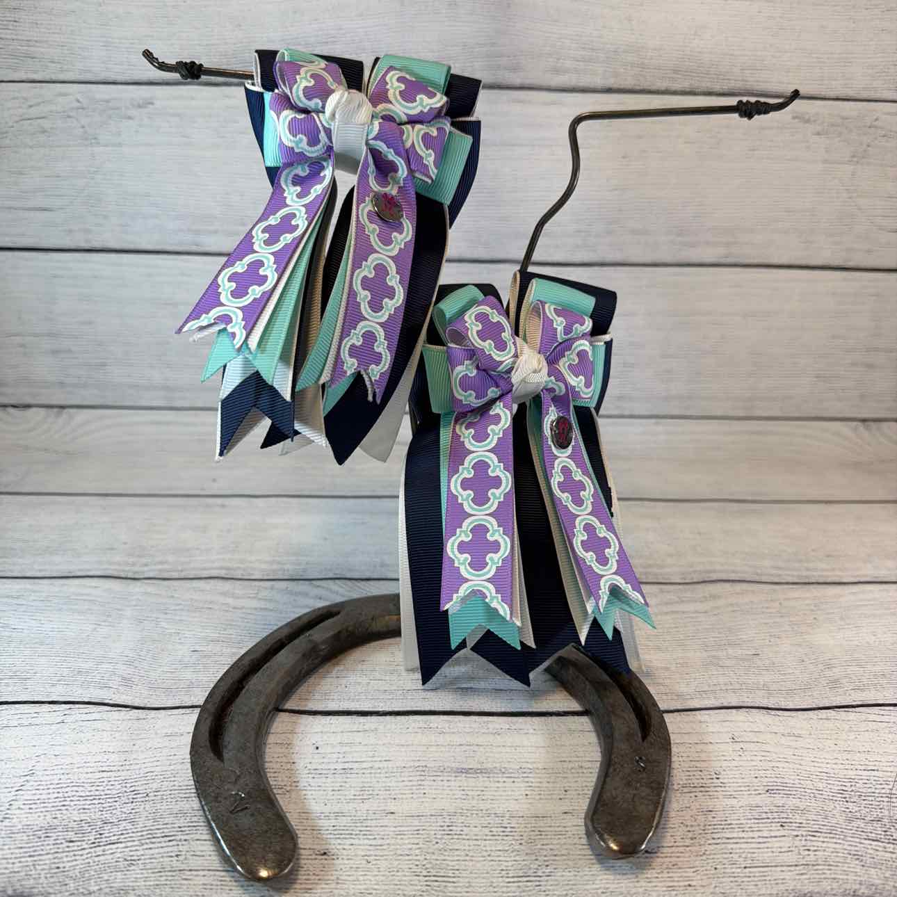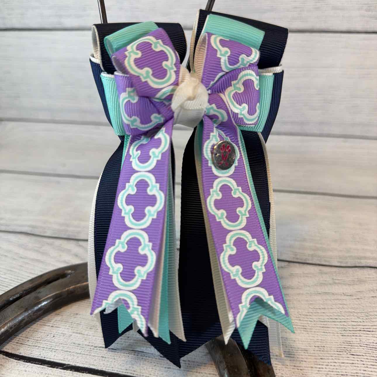 Triple-Layer Show Bows. PAIR. Navy, Turquoise and Lavender with Turquoise/White Pattern. Attached to a Sturdy French Barrette. Perfect for Shows or Fun for Everyday Wear. Like New Condition.