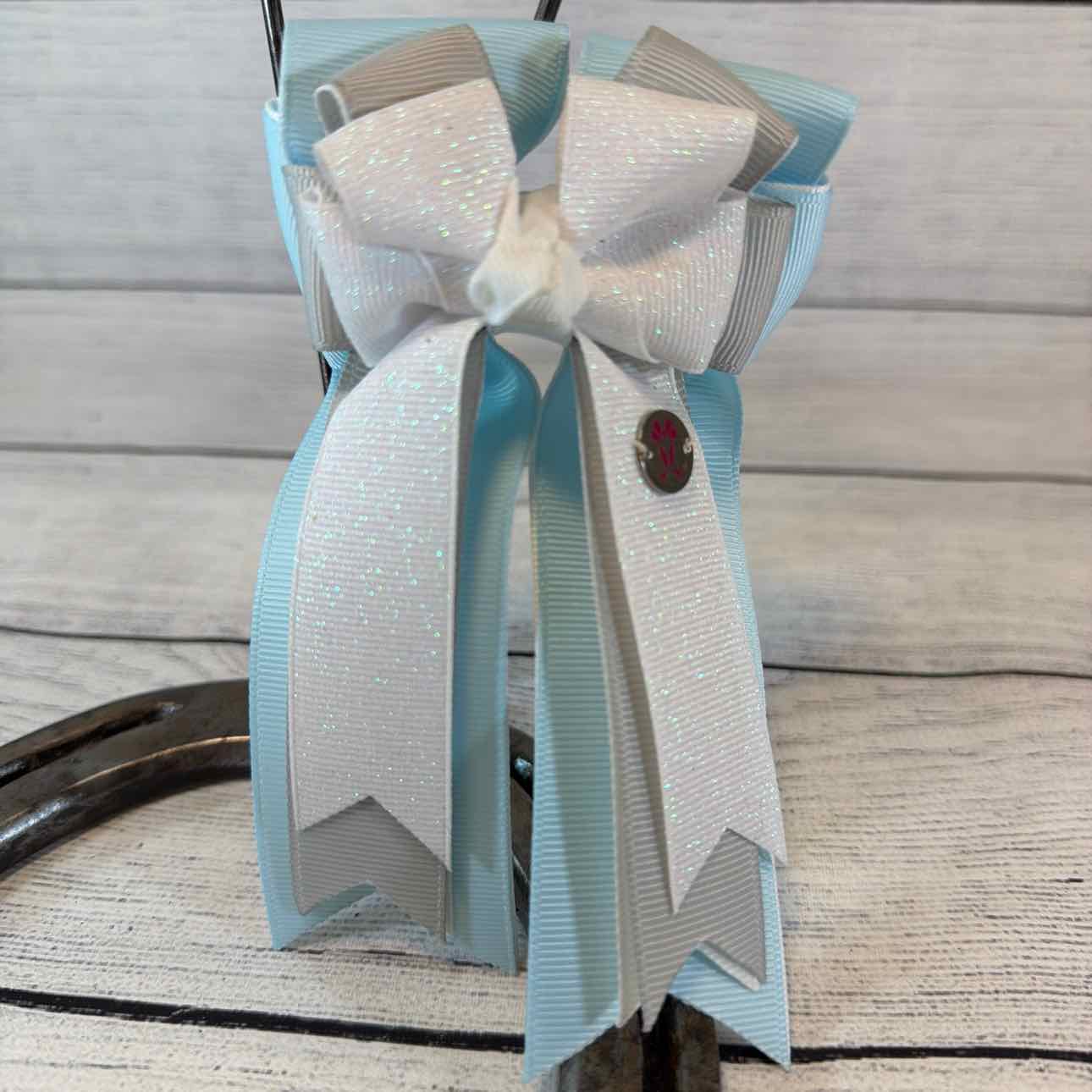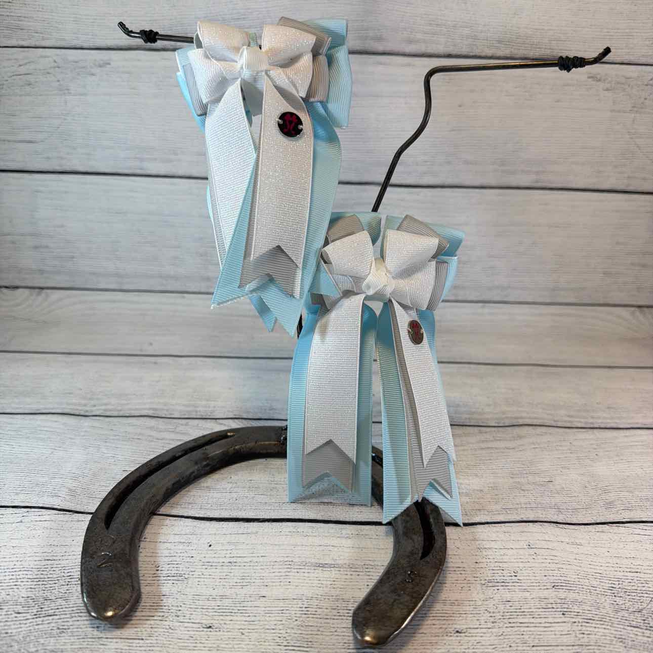 Triple-Layer Show Bows. PAIR. Light Blue, Grey and Glitter White. Attached to a Sturdy French Barrette. Perfect for Shows or Fun for Everyday Wear. Like New Condition.