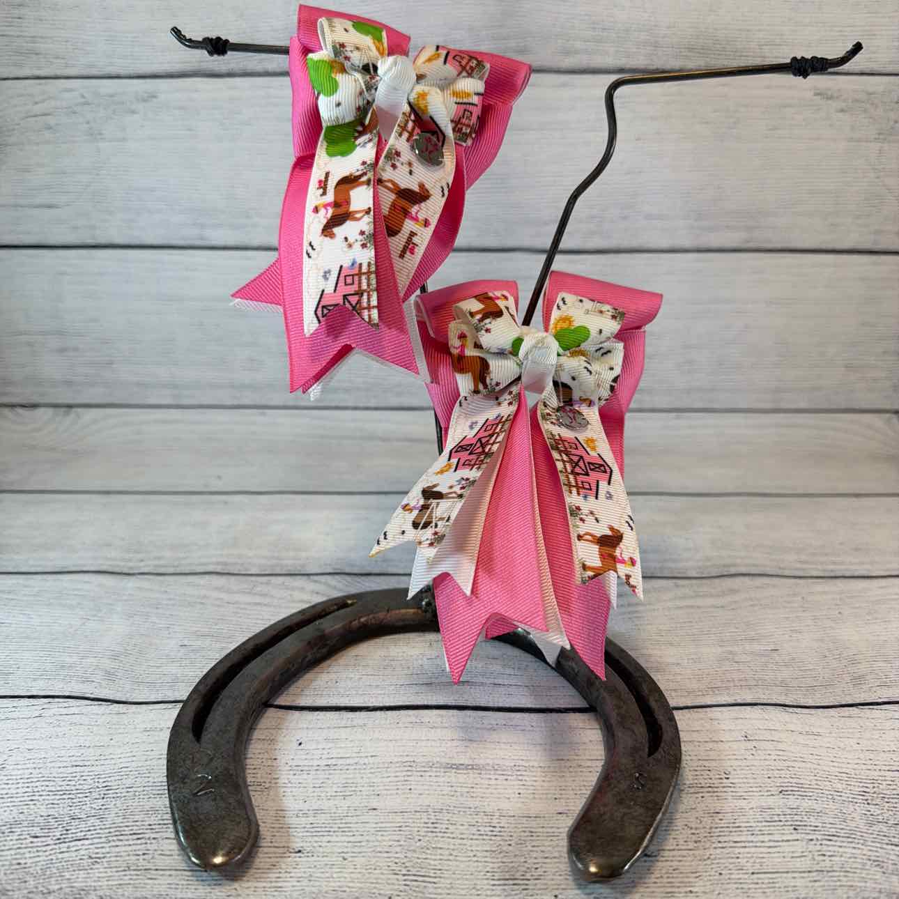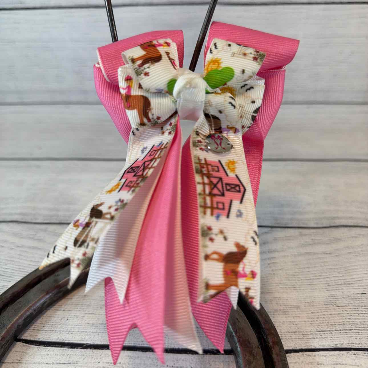 Triple-Layer Show Bows. PAIR. Dark Pink and Horse on Farm Pattern. Attached to a Sturdy French Barrette. Perfect for Shows or Fun for Everyday Wear. Like New Condition.