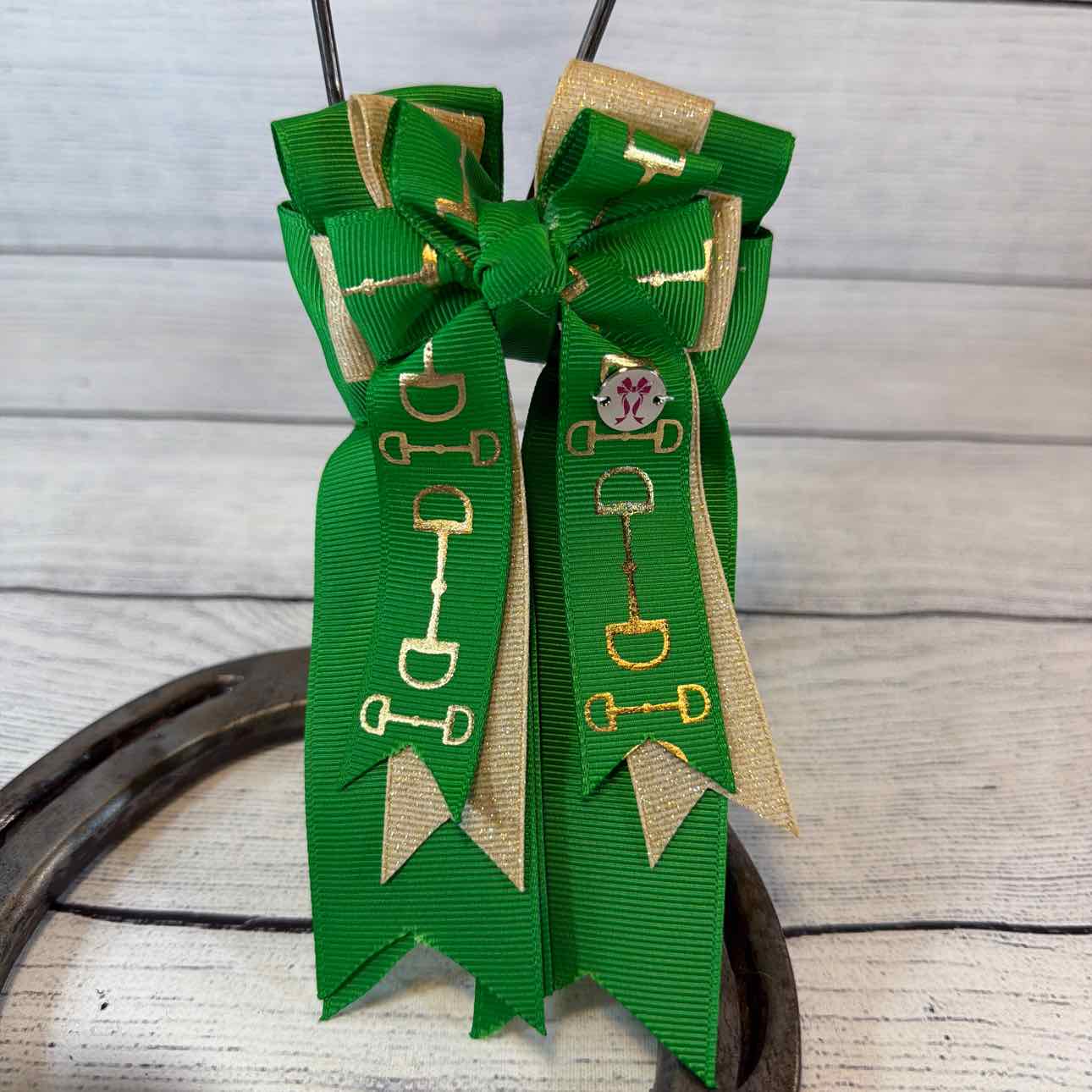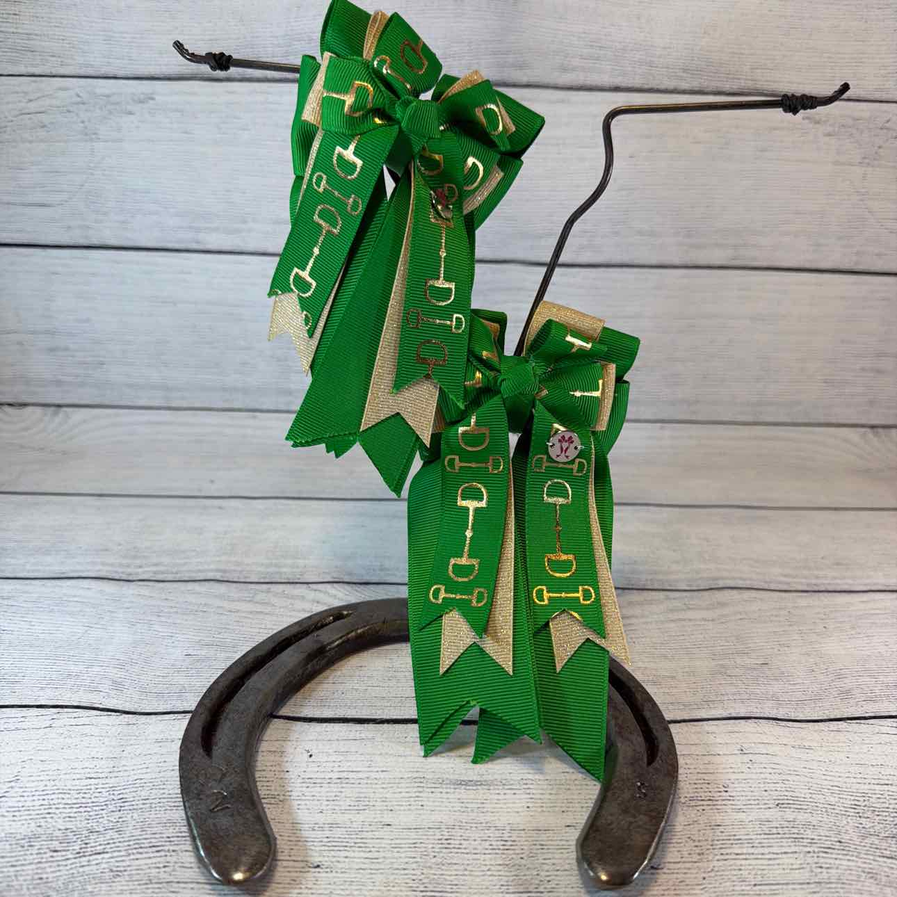 Triple-Layer Show Bows. PAIR. Green, Gold Glitter and Green with Gold Snaffle Bit Pattern. Attached to a Sturdy French Barrette. Perfect for Shows or Fun for Everyday Wear. Like New Condition.