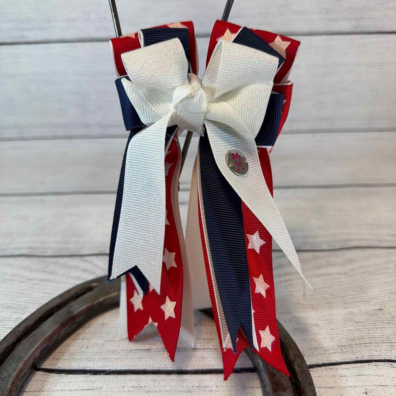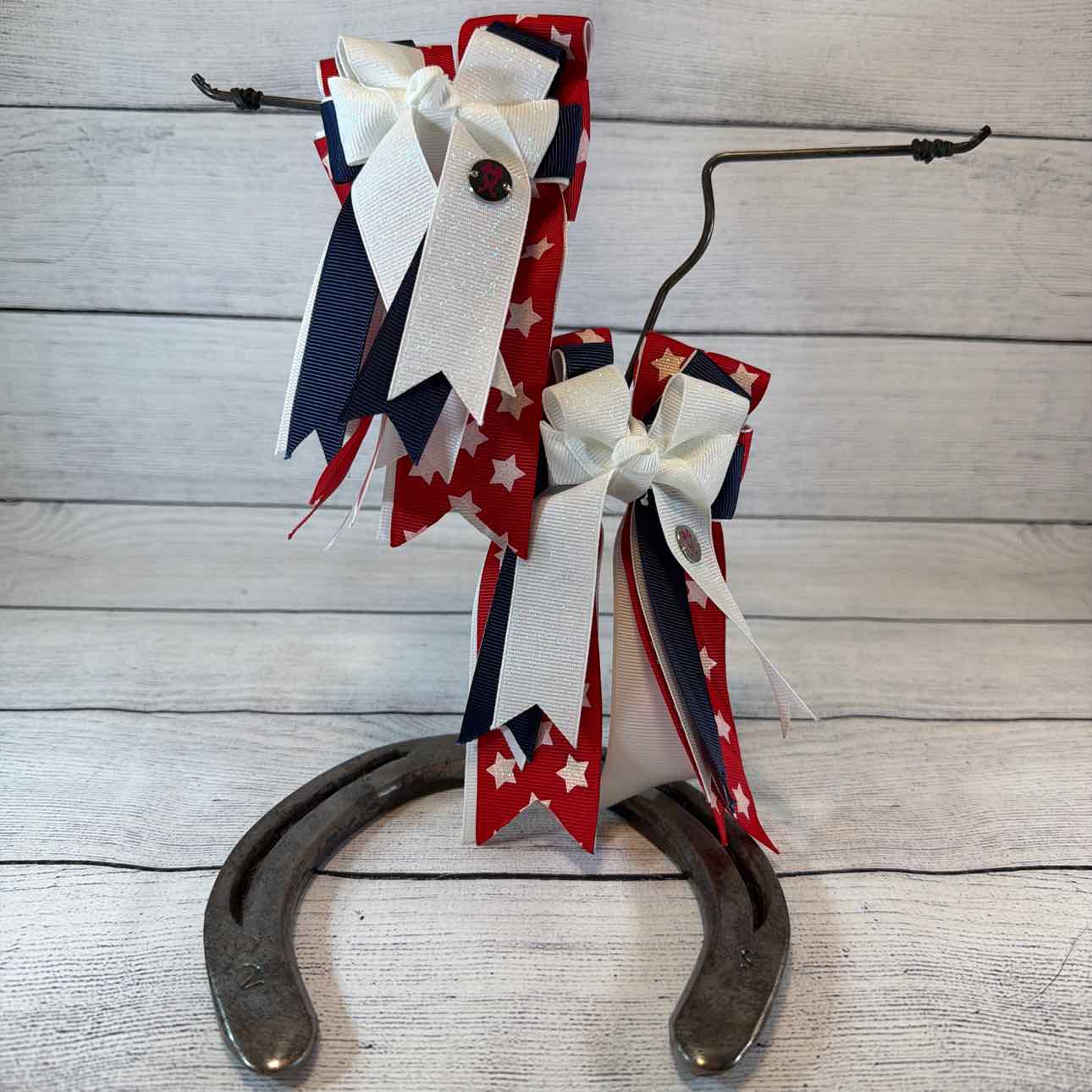 Triple-Layer Show Bows. PAIR. White, Blue and Red with Stars Pattern. Attached to a Sturdy French Barrette. Perfect for Shows or Fun for Everyday Wear. Like New Condition.