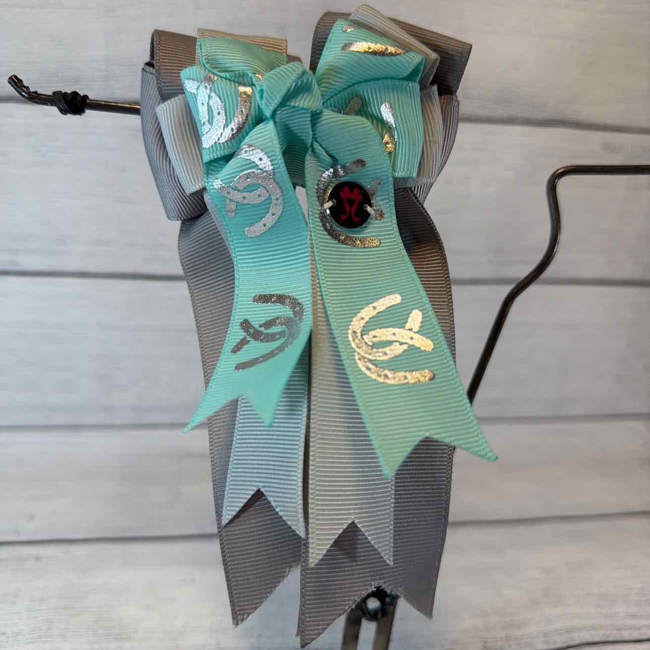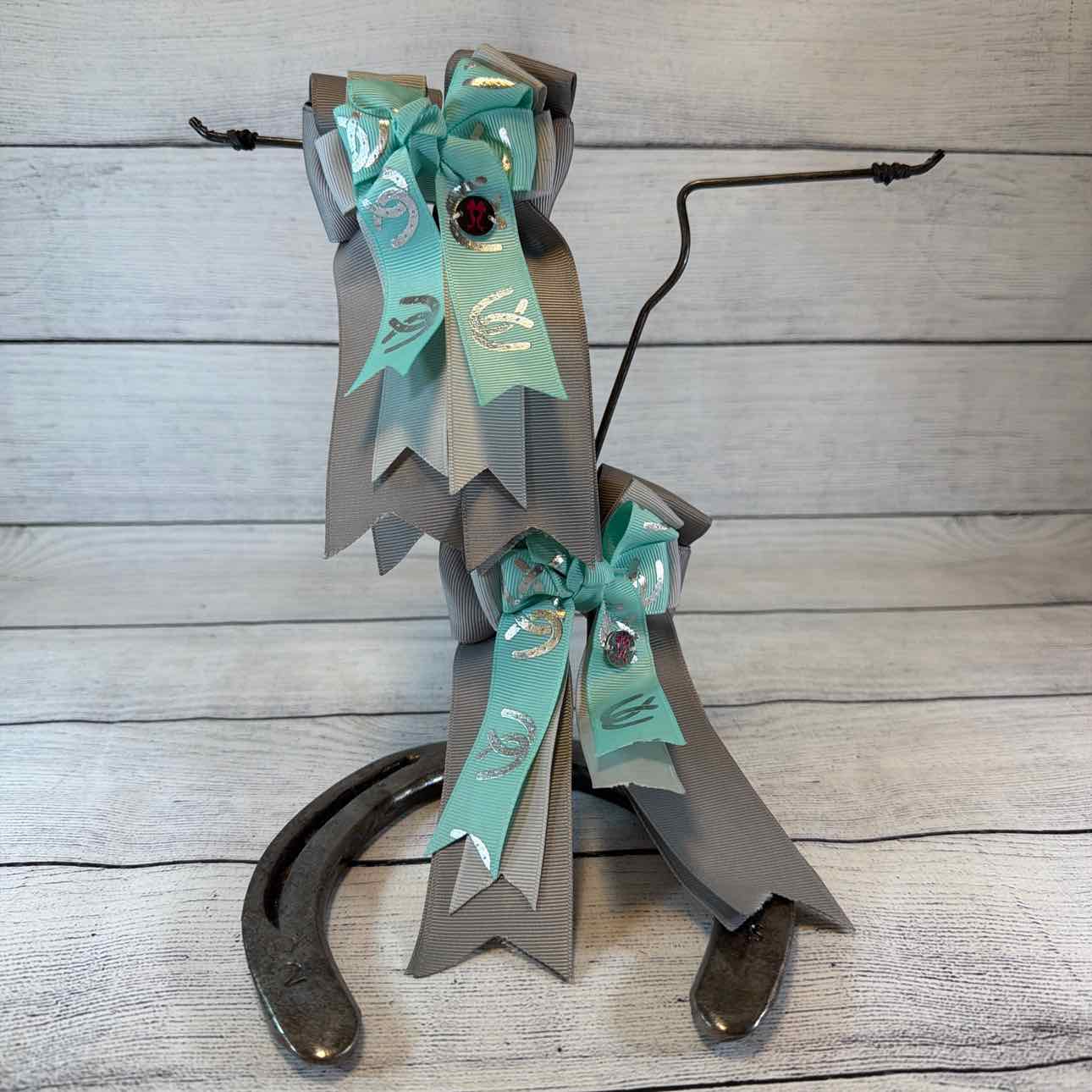 Triple-Layer Show Bows. PAIR. Dark Grey, Light Grey, Turquoise with Silver Horseshoe Pattern. Attached to a Sturdy French Barrette. Perfect for Shows or Fun for Everyday Wear. Like New Condition.