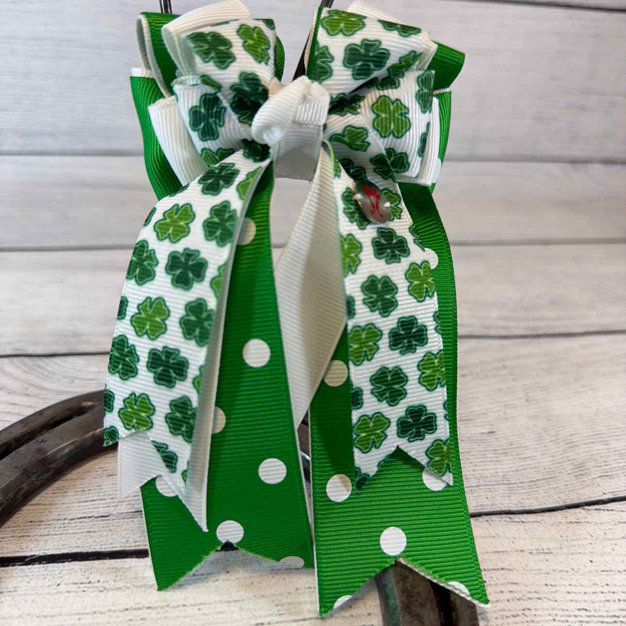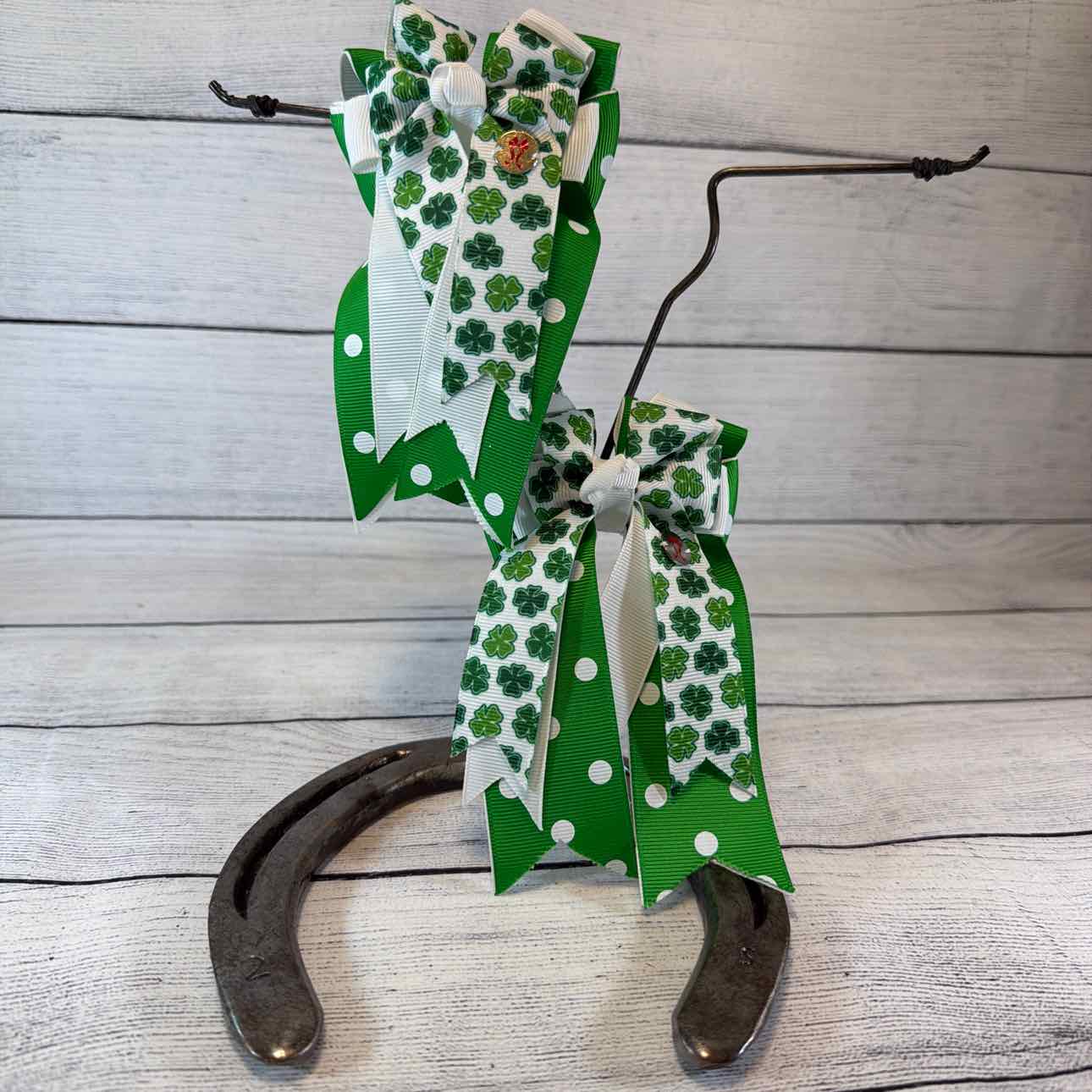 Triple-Layer Show Bows. PAIR. Green Polka Dot, White, Green Shamrock Pattern. Attached to a Sturdy French Barrette. Perfect for Shows or Fun for Everyday Wear. Like New Condition.