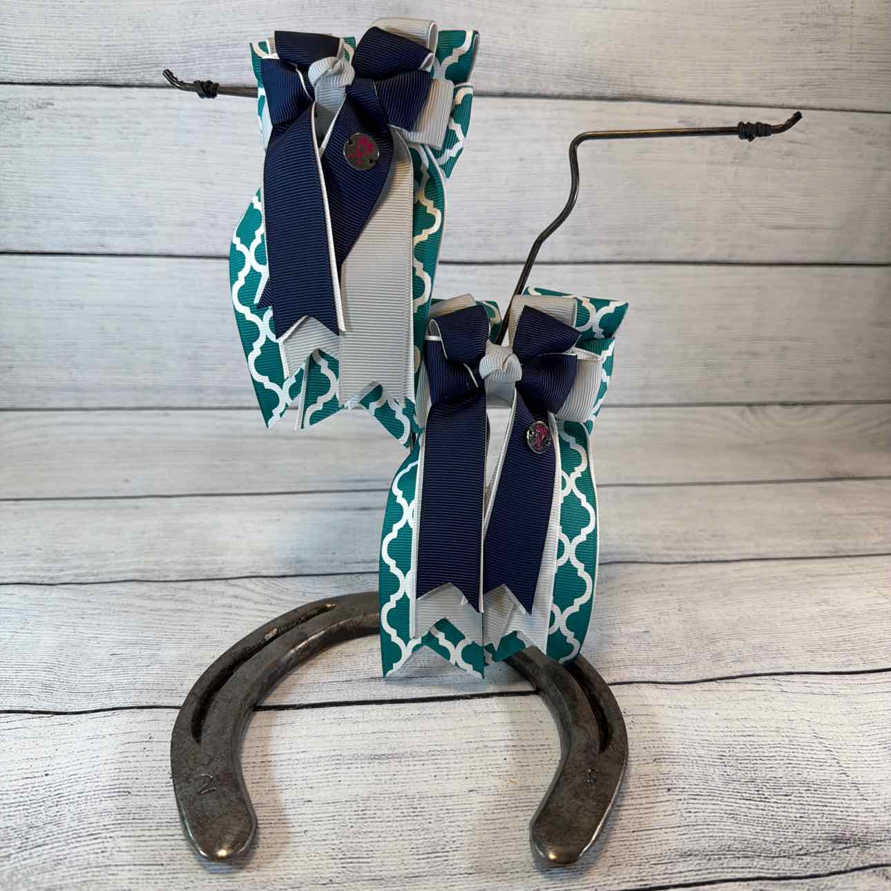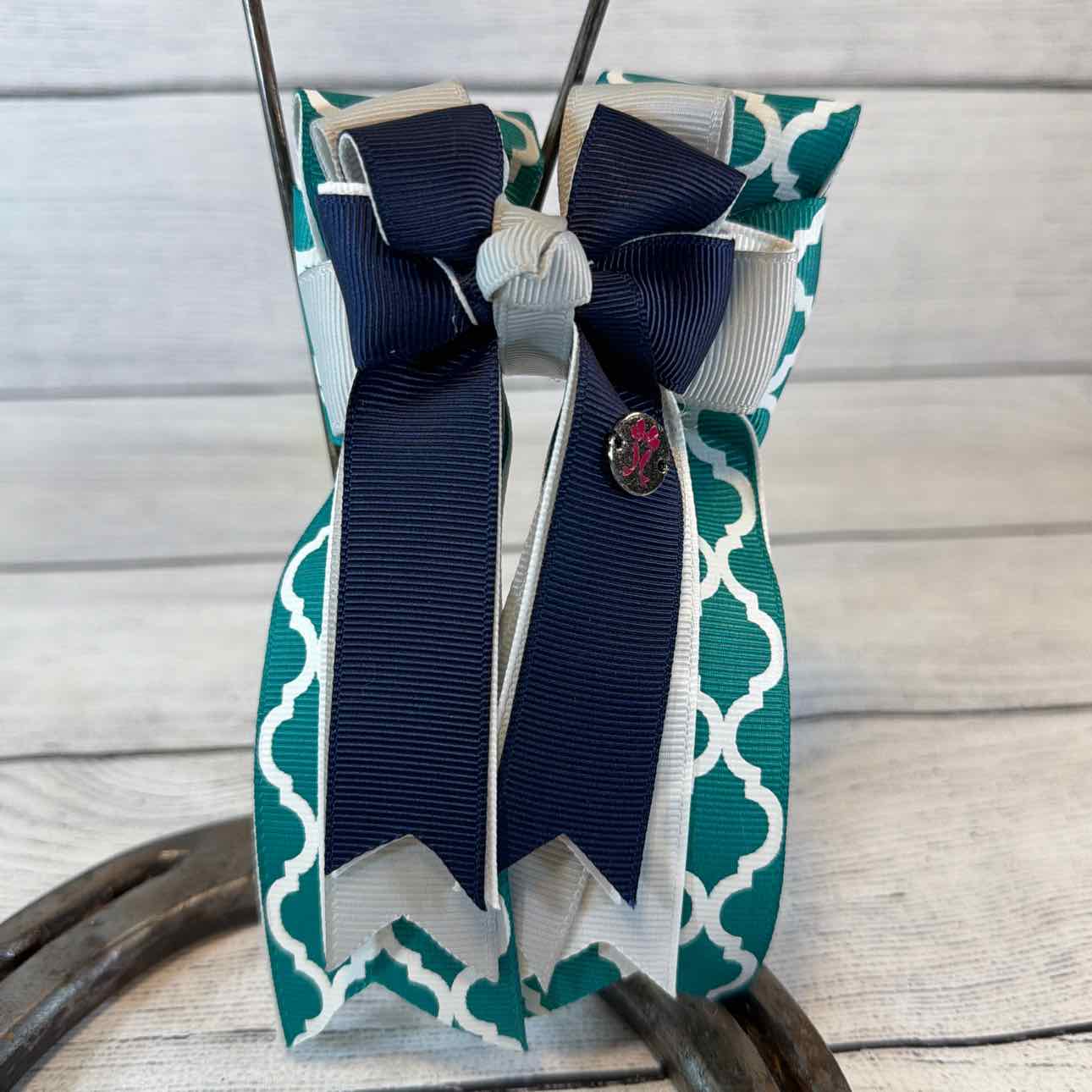 Triple-Layer Show Bows. PAIR. Teal/White Geometric Pattern, Light Grey, Navy. Attached to a Sturdy French Barrette. Perfect for Shows or Fun for Everyday Wear. Like New Condition.