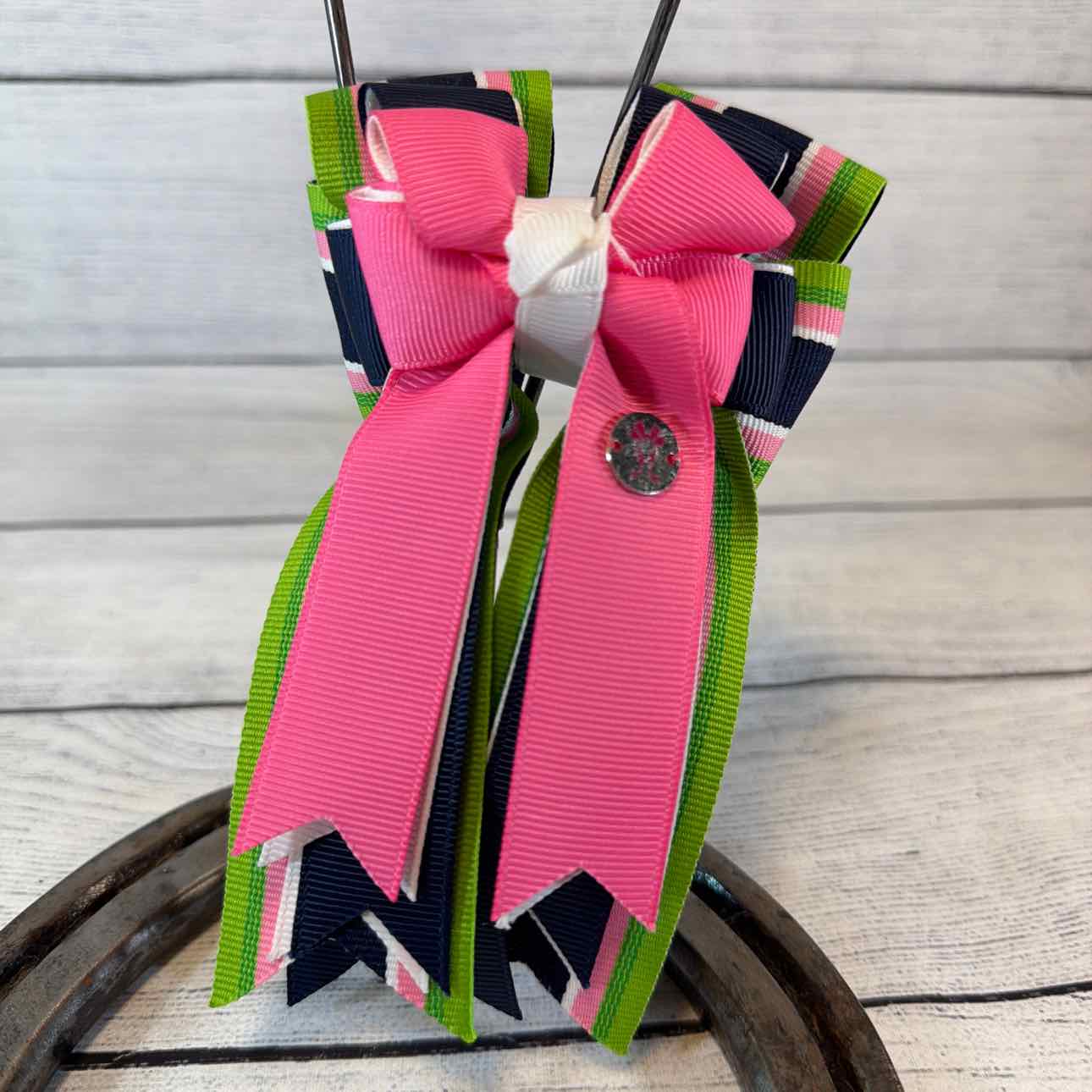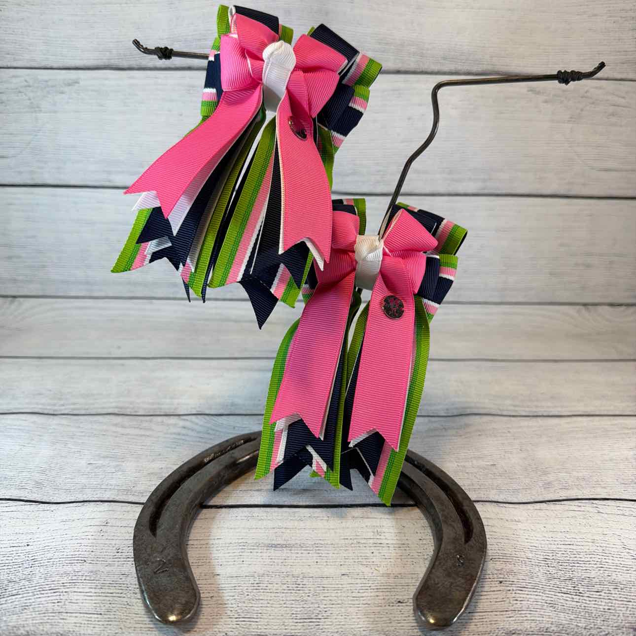 Triple-Layer Show Bows. PAIR. Green/Pink/White/Navy Stripe, Navy and Dark Pink. Attached to a Sturdy French Barrette. Perfect for Shows or Fun for Everyday Wear. Like New Condition.