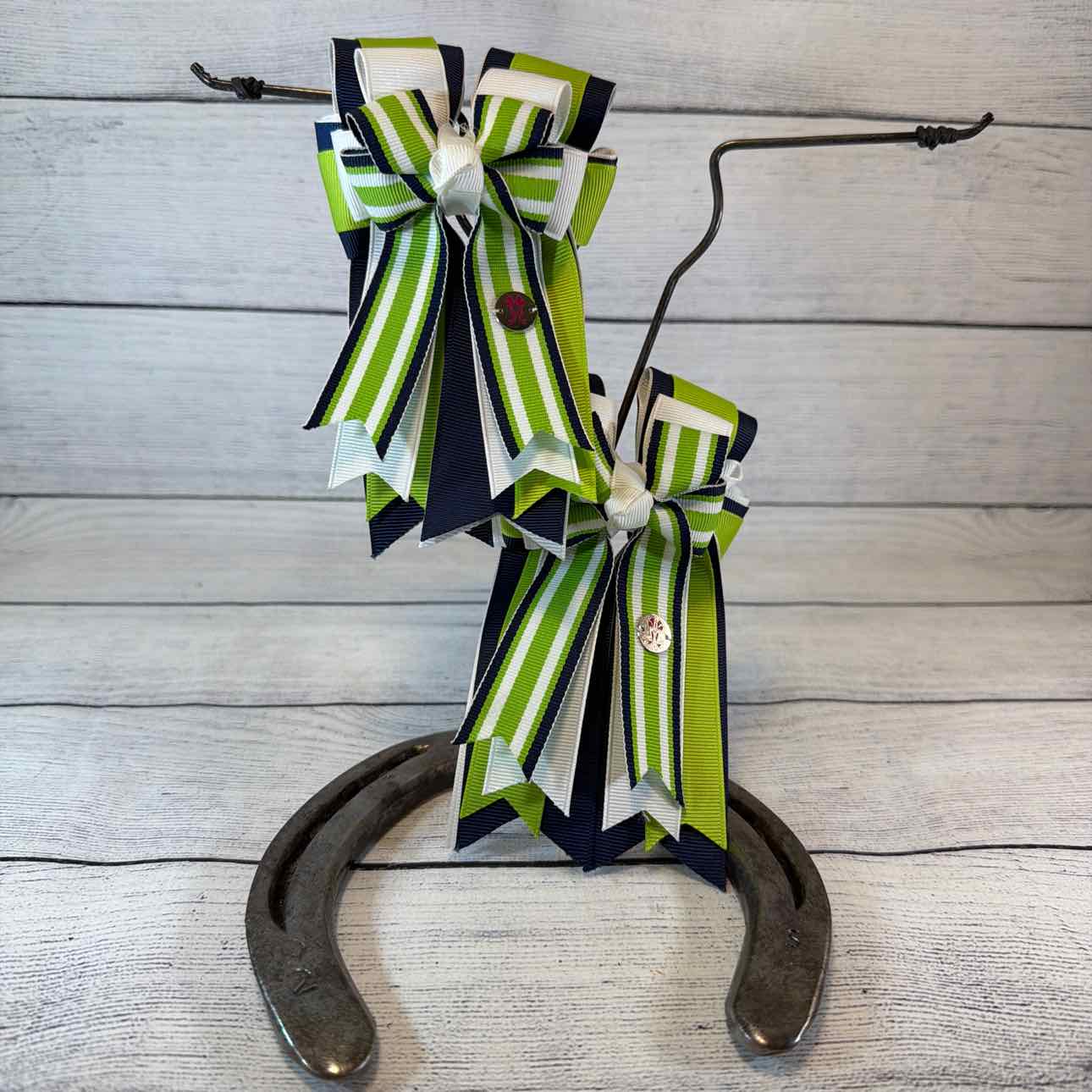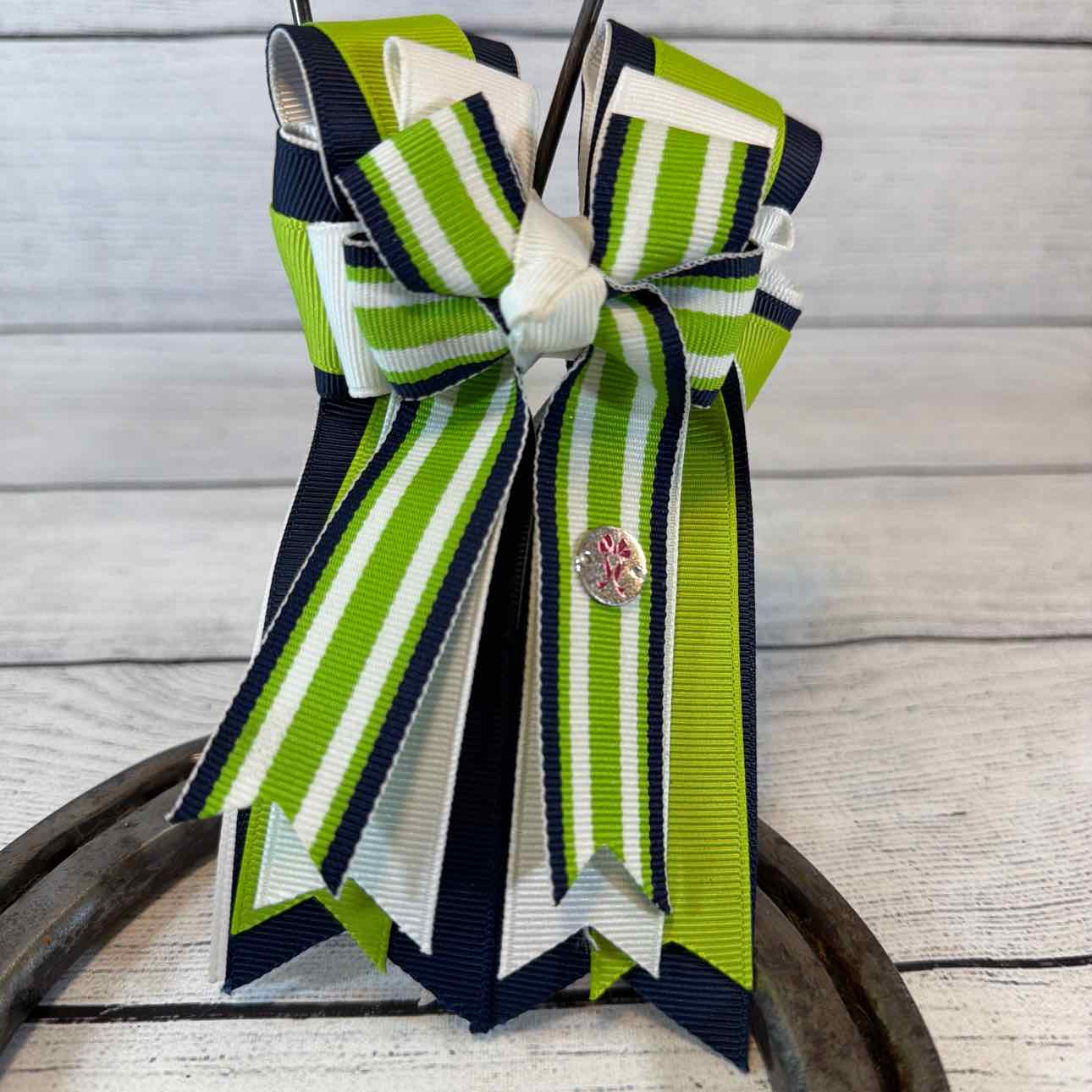 Triple-Layer Show Bows. PAIR. Green/Navy, White, Green/White/Navy Stripe. Attached to a Sturdy French Barrette. Perfect for Shows or Fun for Everyday Wear. Like New Condition.