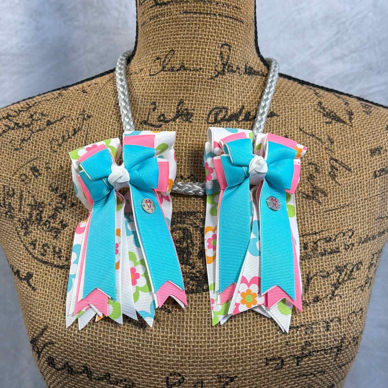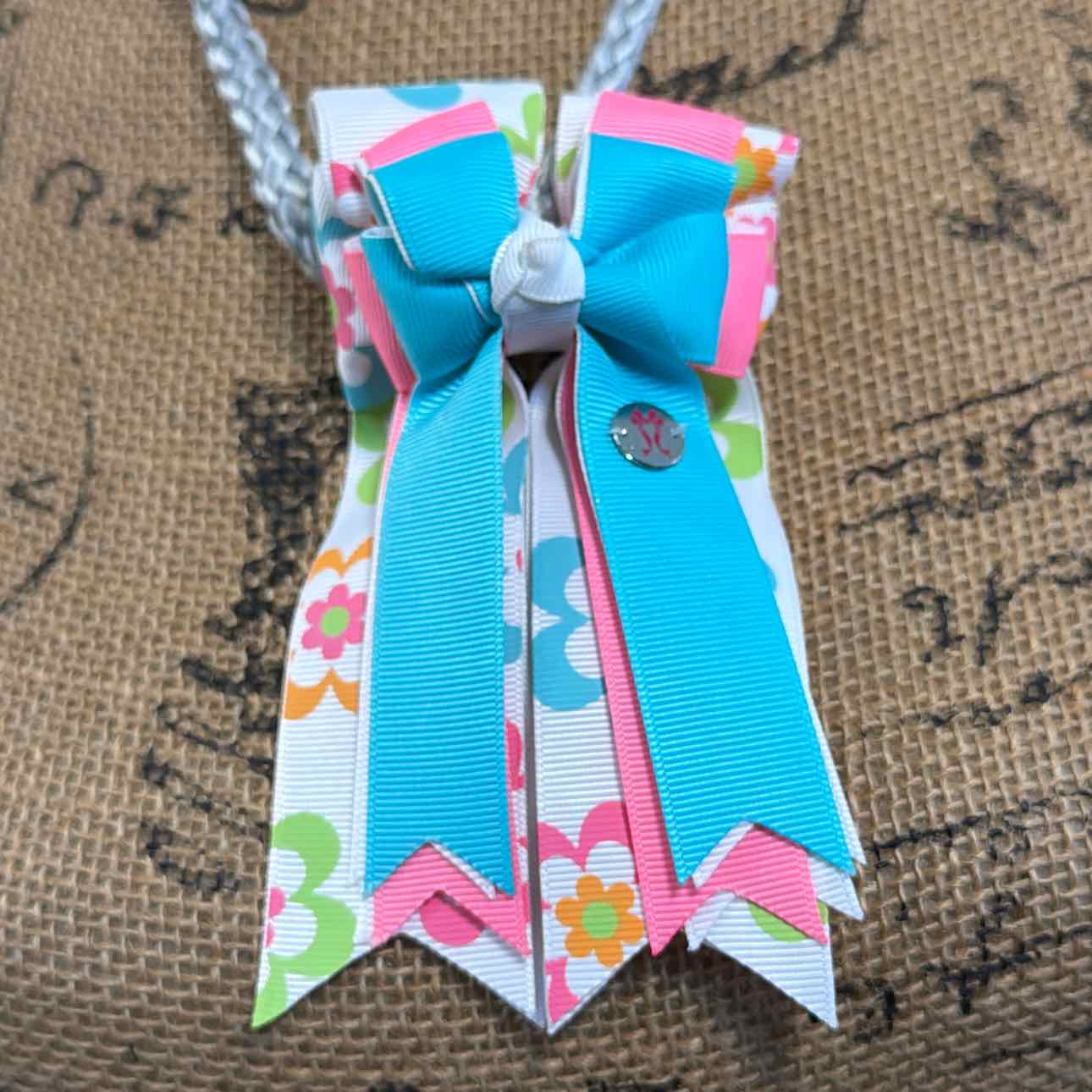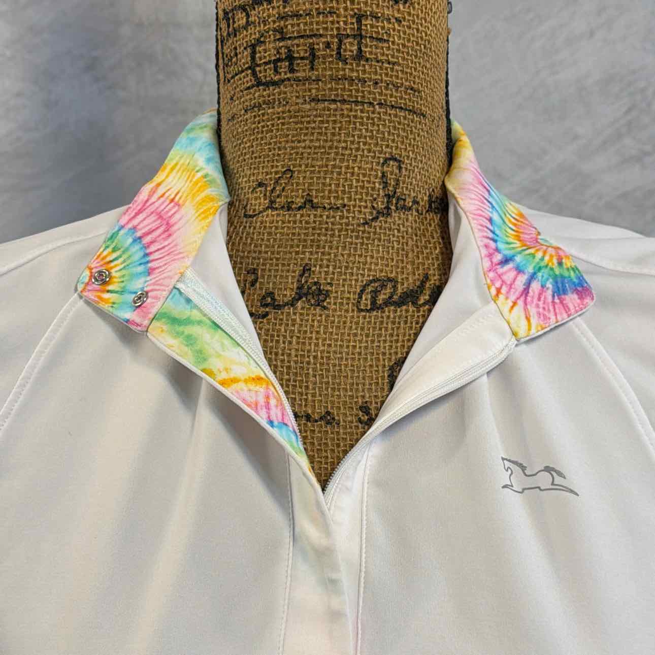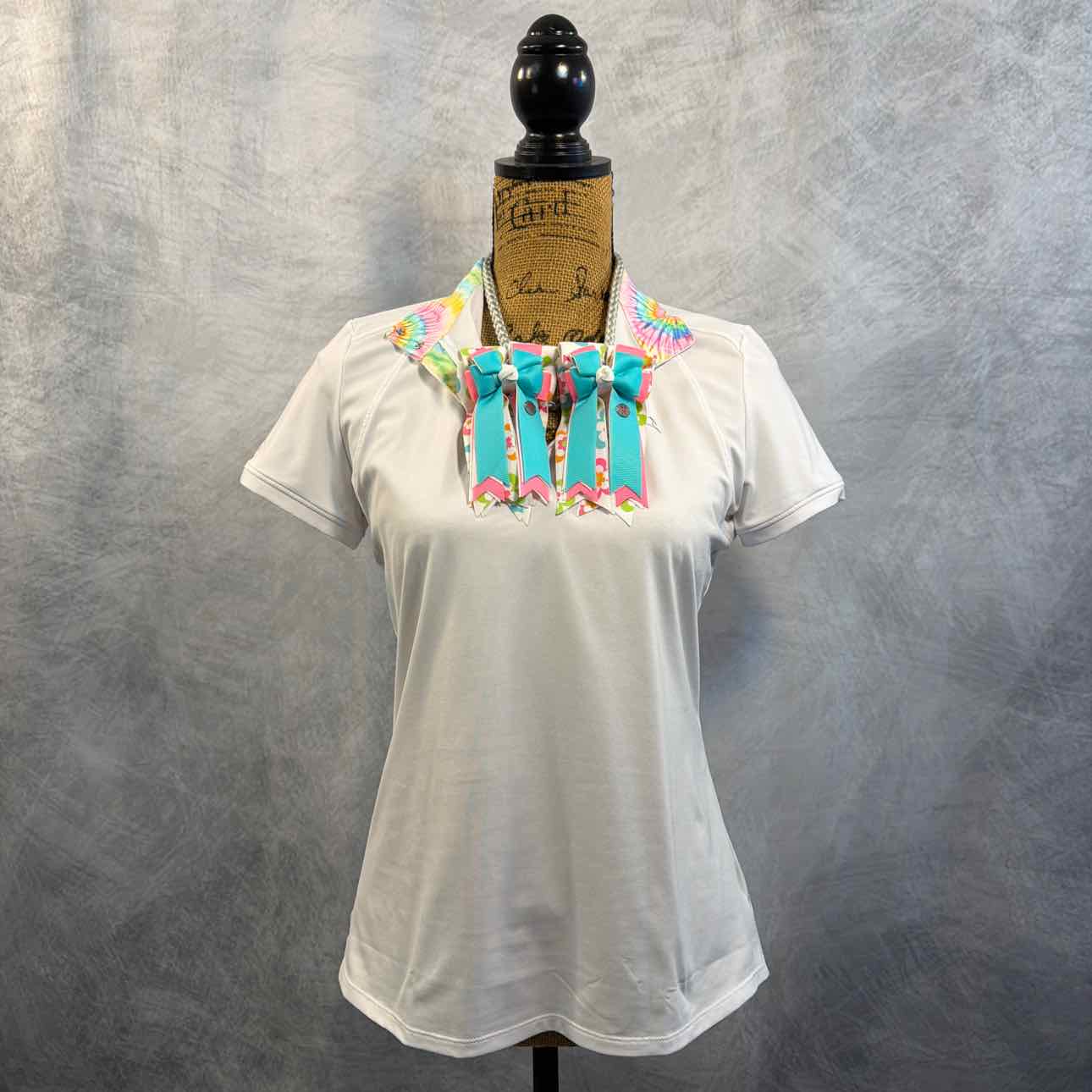 Short Sleeve Show Shirt and PonyTail Bows Set. Shirt has Pastel Tie Dye Pattern on Collar. Bows are White w/ Pink/Blue/Green/Orange Floral Pattern, Pastel Pink, Pastel Blue. Very Good Condition. Shirt is Woman's Size, not Youth.