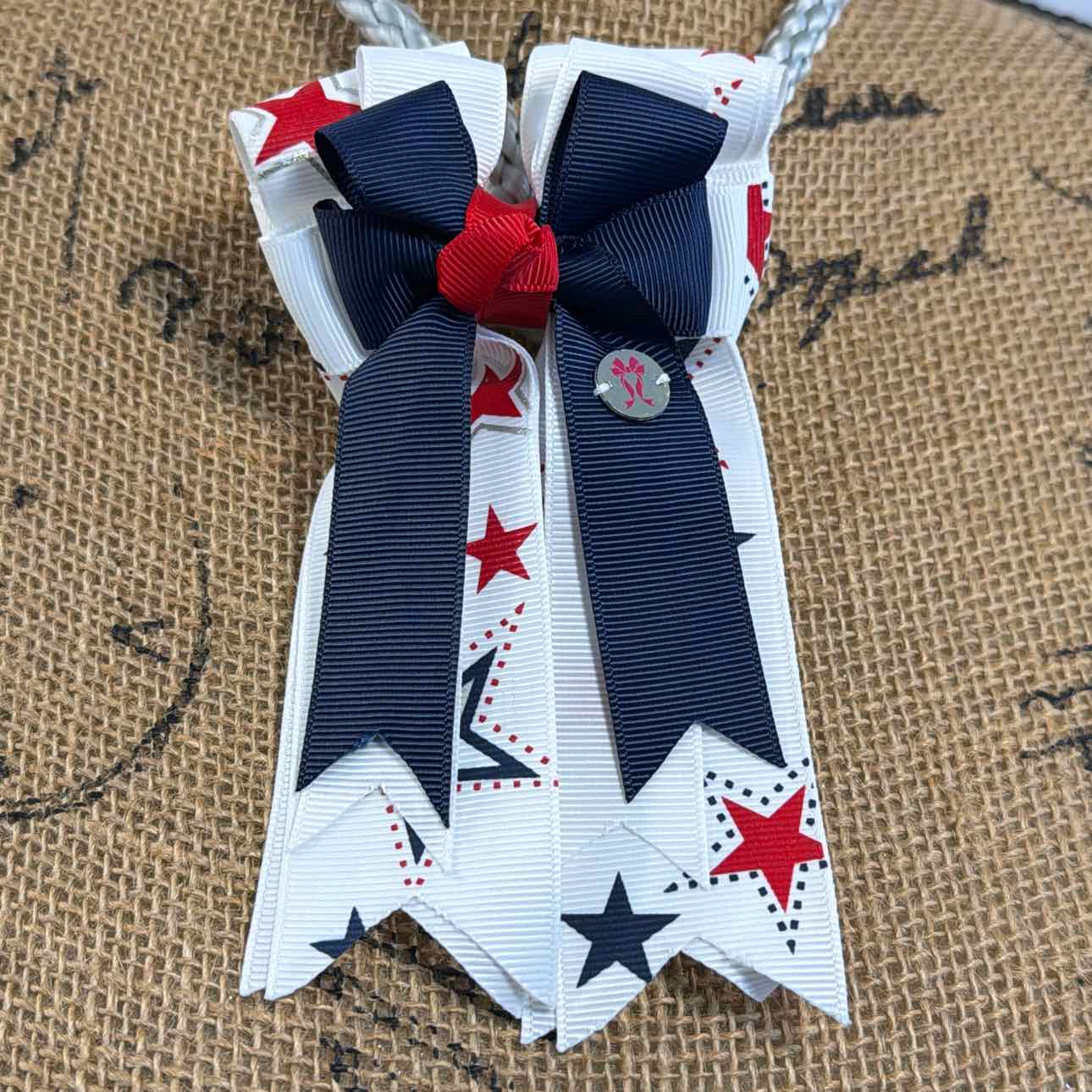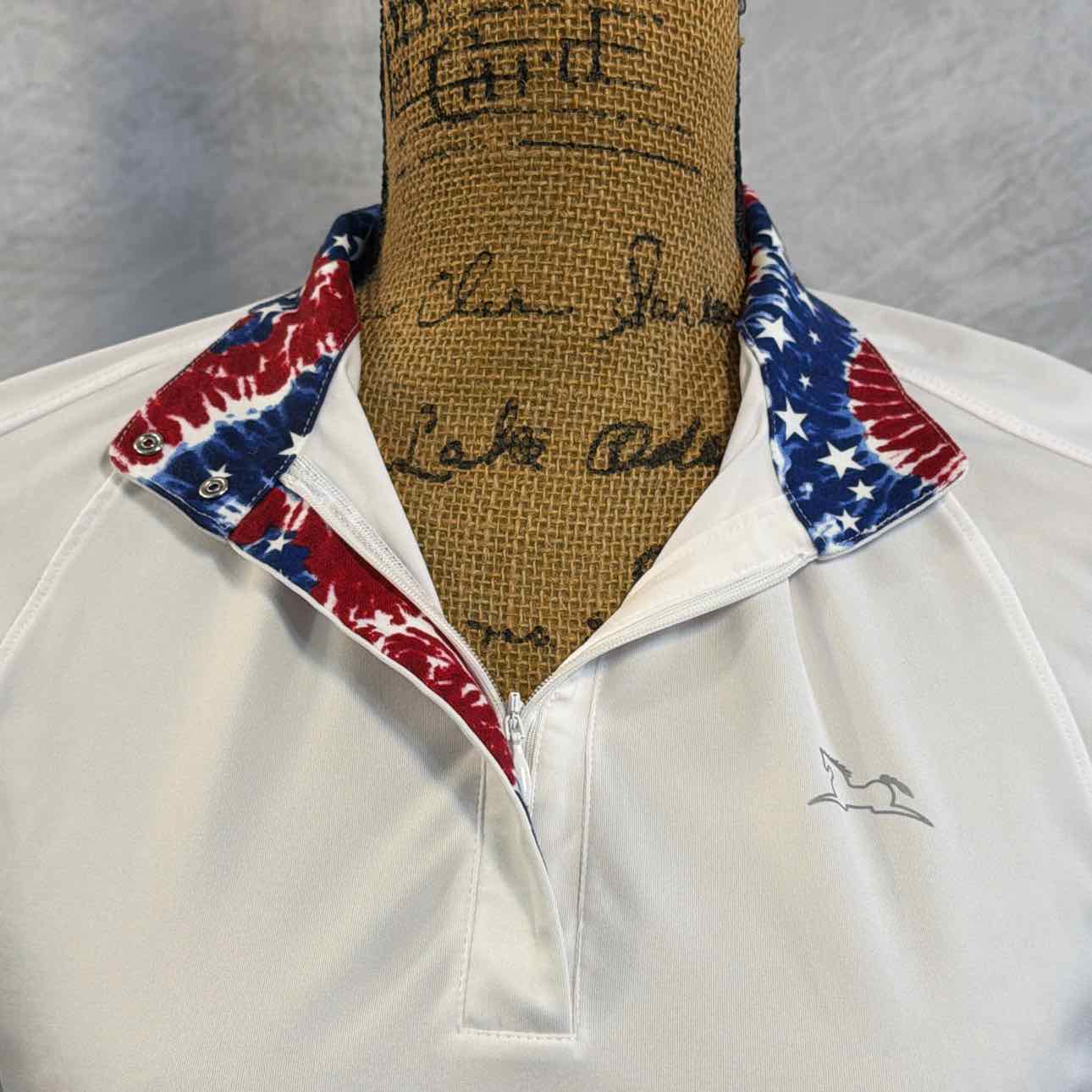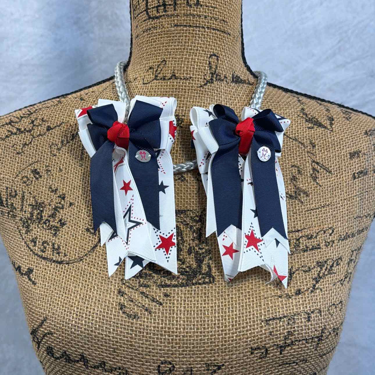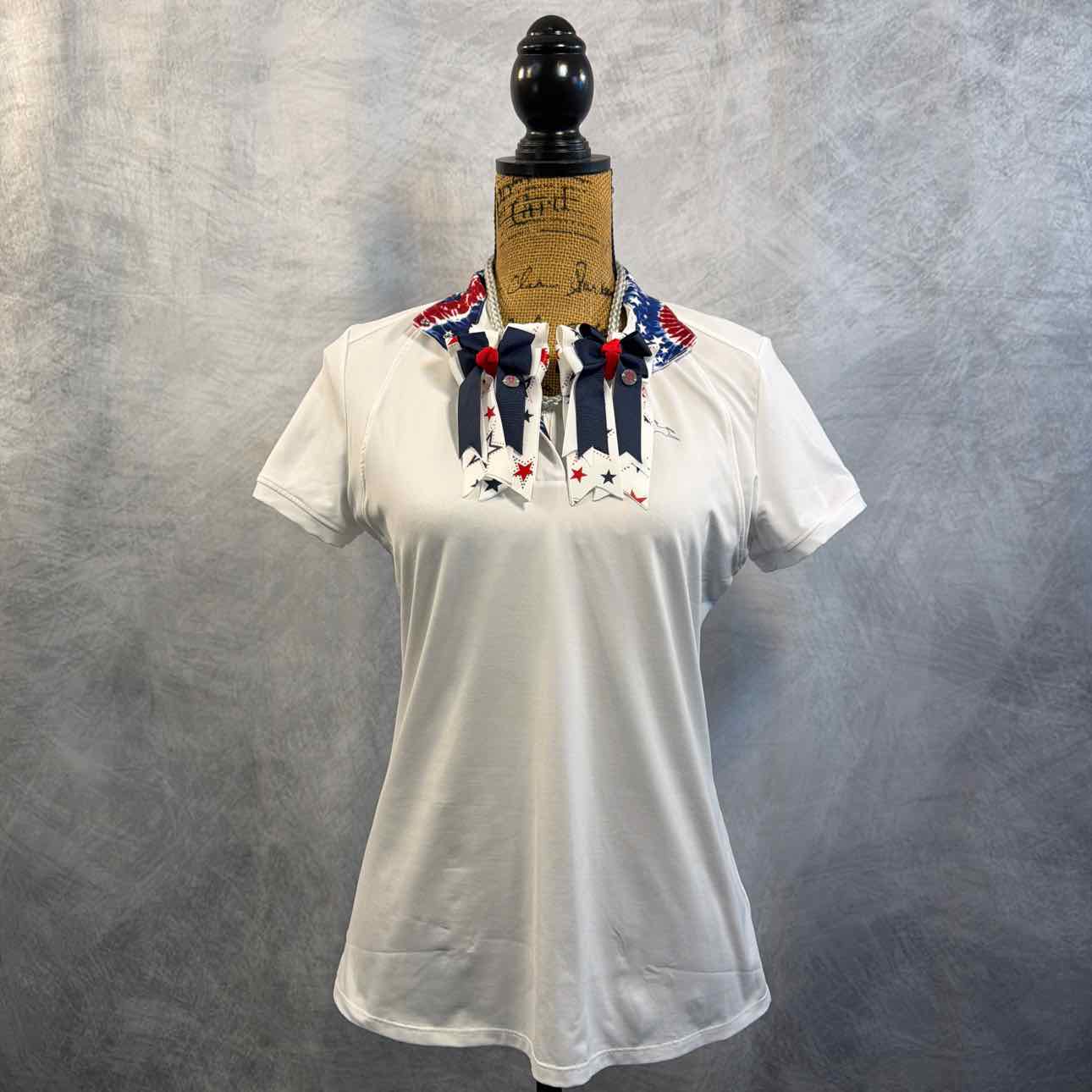 Short Sleeve Show Shirt and PonyTail Bows Set. Shirt has Patriotic Tie Dye Pattern on Collar. Bows are White with Red/Blue Stars, White, Navy. Very Good Condition. Shirt is Woman's Size, not Youth.