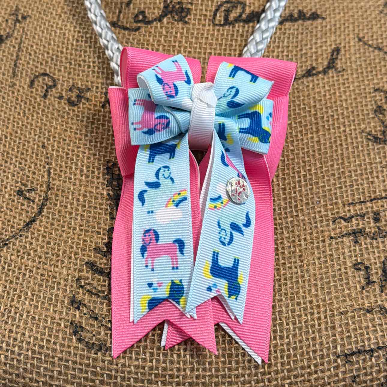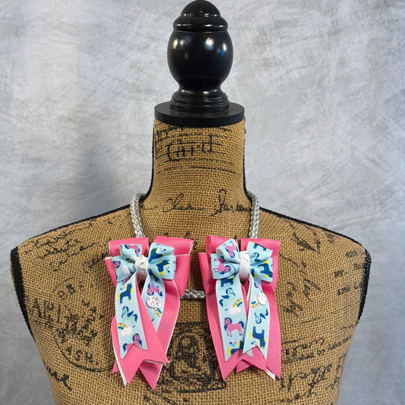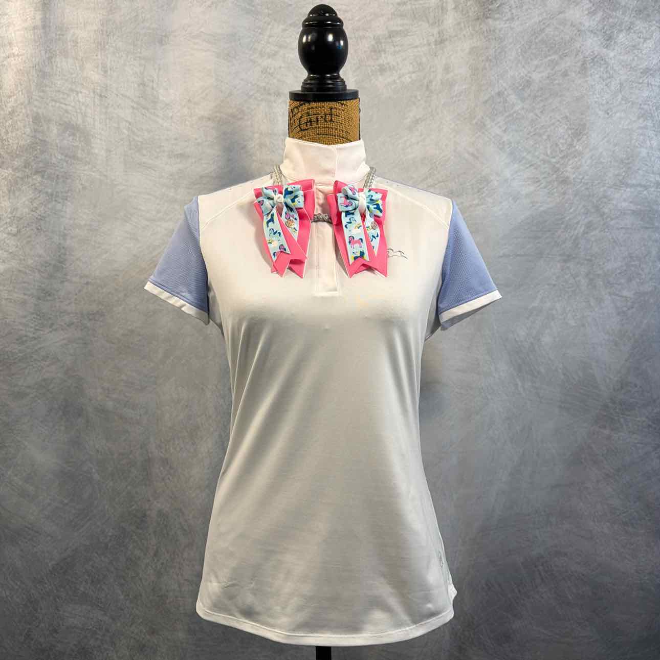 Short Sleeve Show Shirt and PonyTail Bows Set. Shirt has Light Blue Mesh on Shoulders and Sleeves. Bows are Pink, Light blue with Rainbow Horse Pattern. Very Good Condition. Shirt is Woman's Size, not Youth.