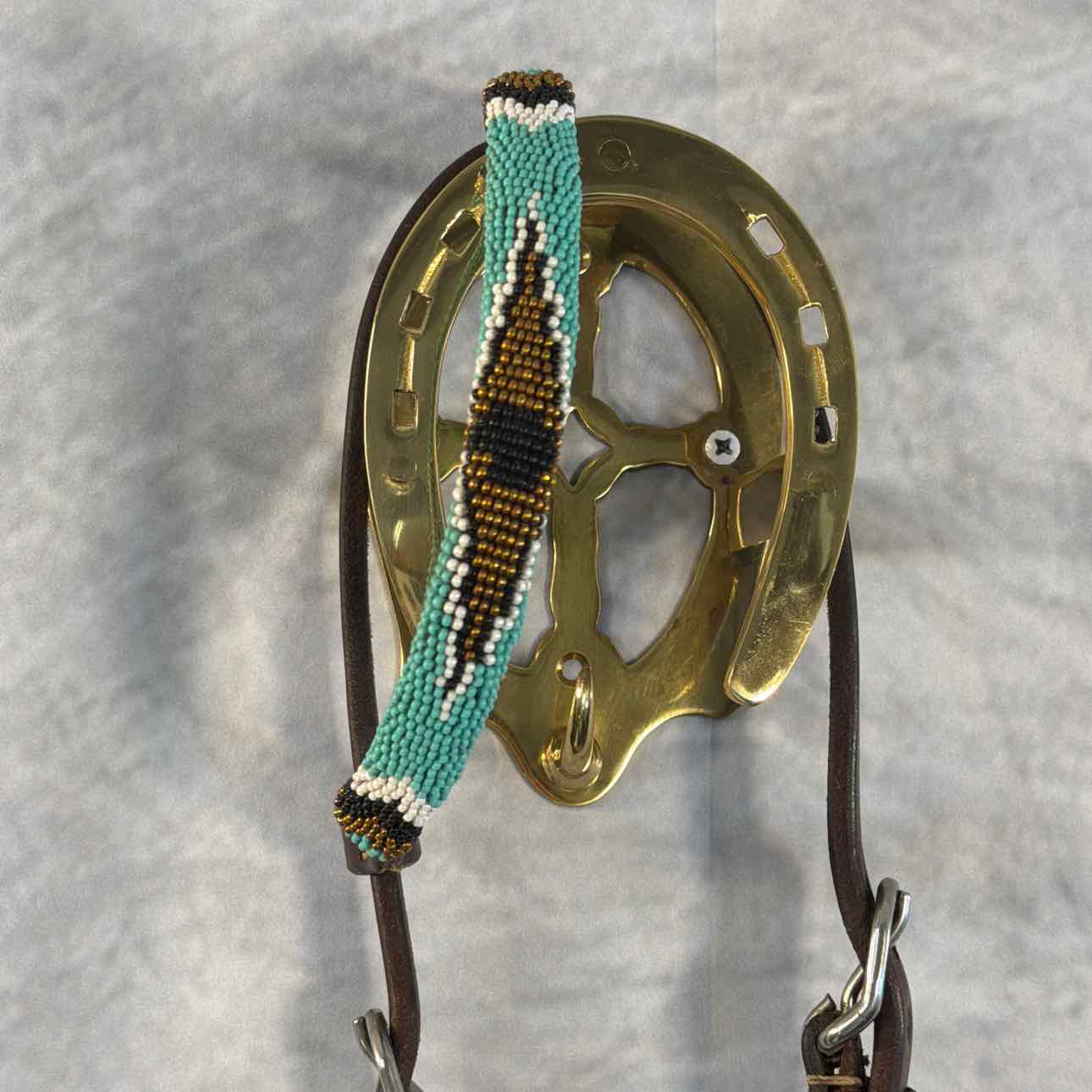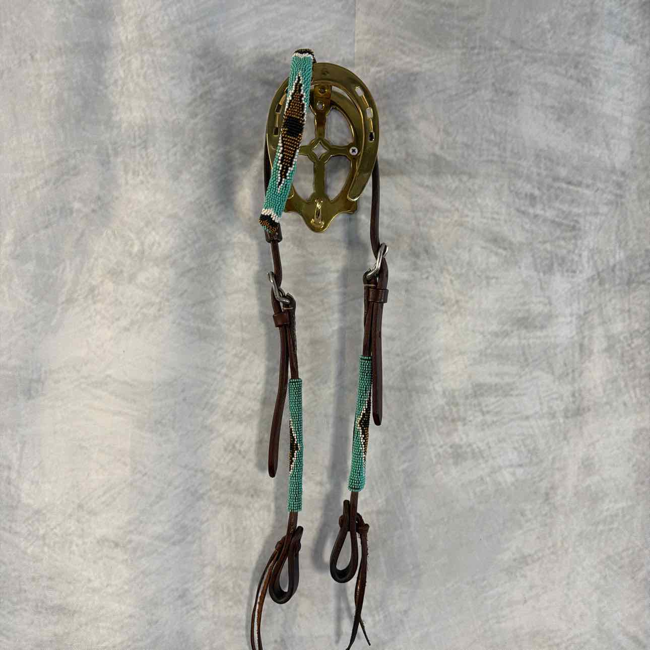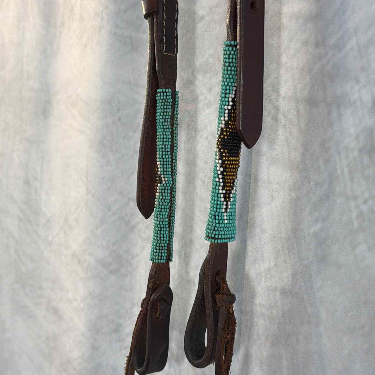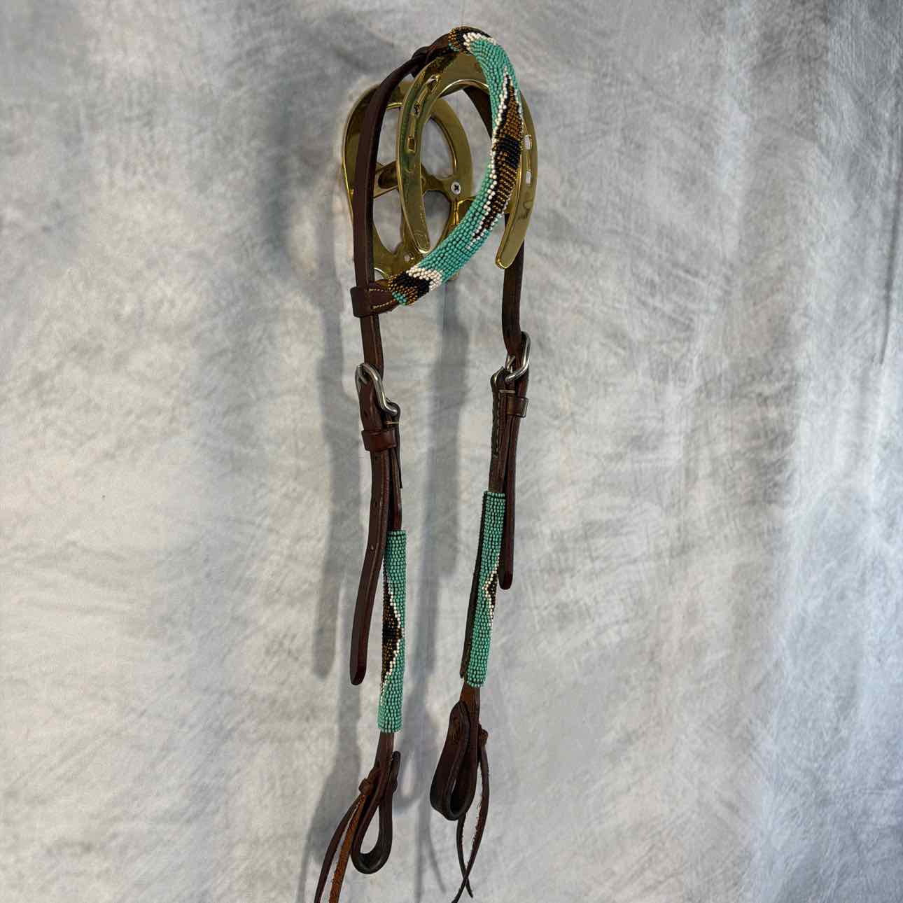 One Ear Beaded Western Headstall. Teal Sead Beads. Used. Stainless Steel Hardware. Tie End Bit Hanger Loops.