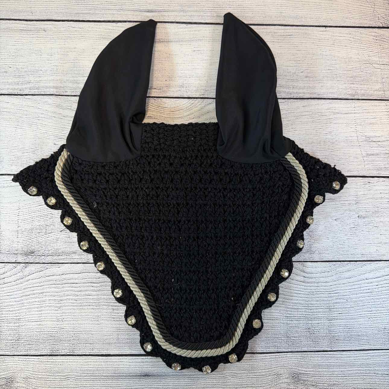 Crochet Ear Bonnet. Big Clear Crystals. Black and Grey Corded Trim. Very Good Condition.