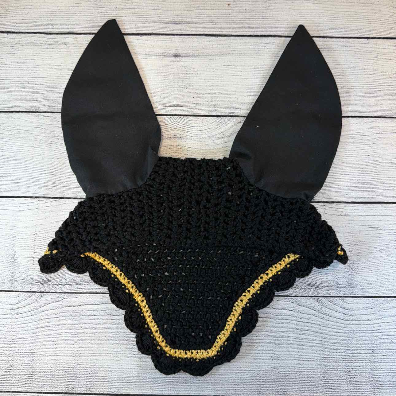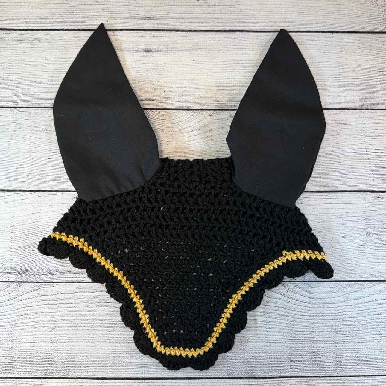 Crochet Ear Bonnet. Large Pony Size. Gold Accent Stitching.