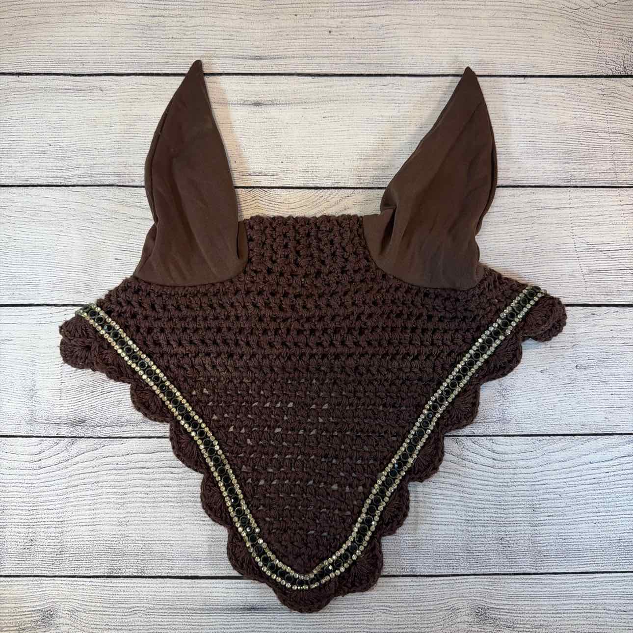 Crochet Ear Bonnet with Black & Clear Bling Trim. Some Clear Stones Missing. Velcro Tabs for Attaching to Bridle. Used.