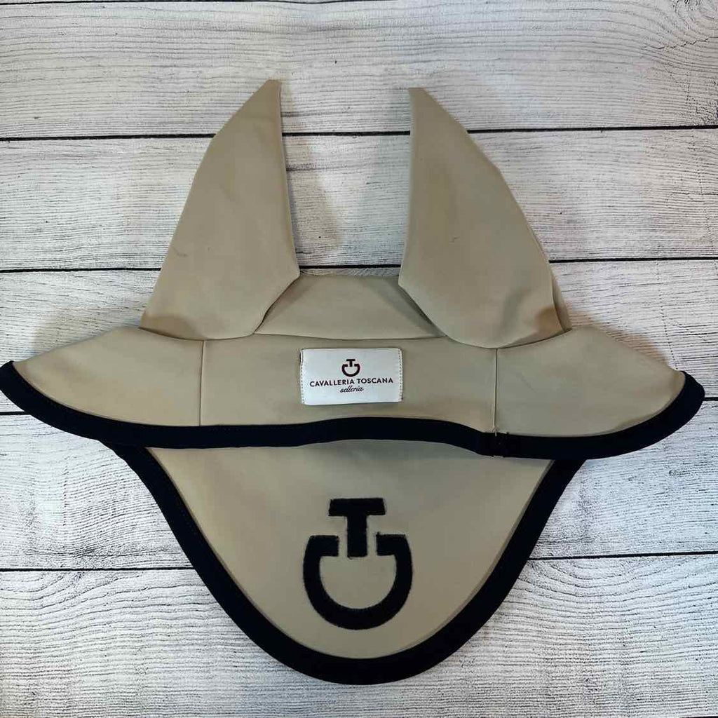 Light Jersey Ear Net Ear Bonnet. Tan and Navy with Navy Logo. Excellent Condition.