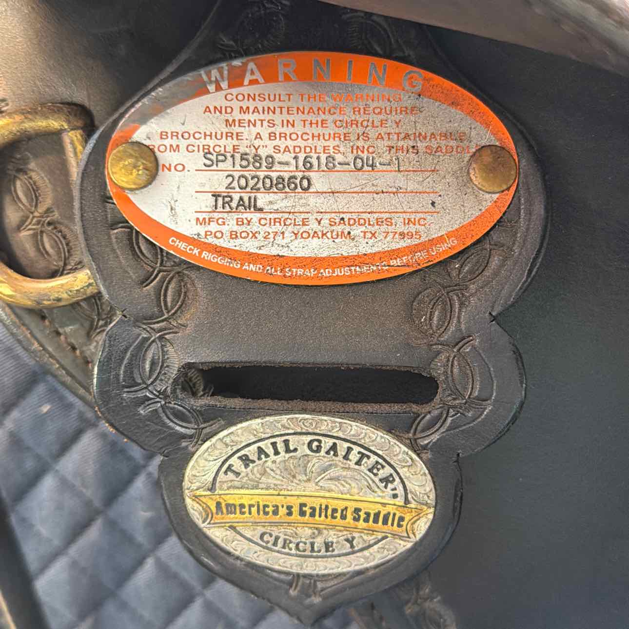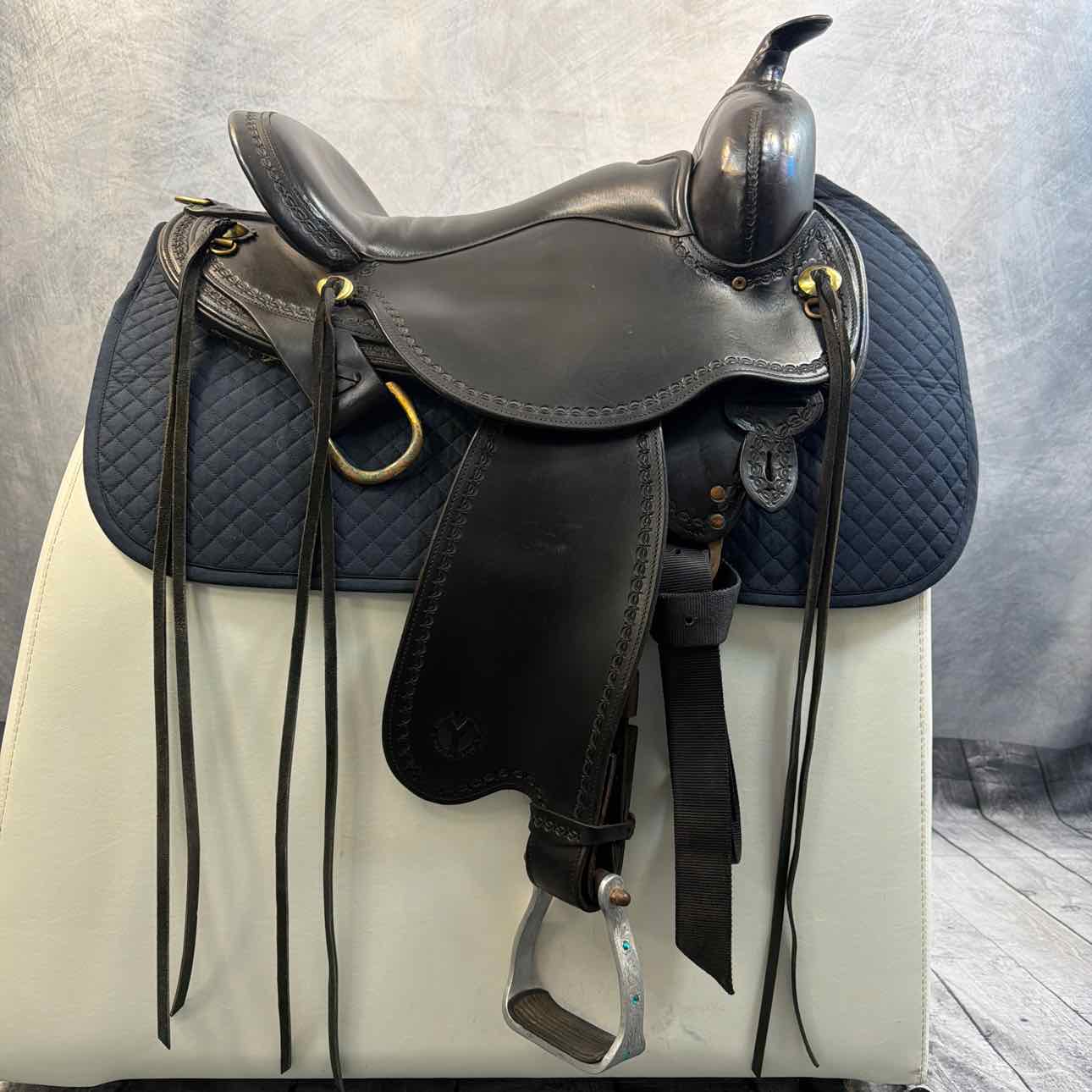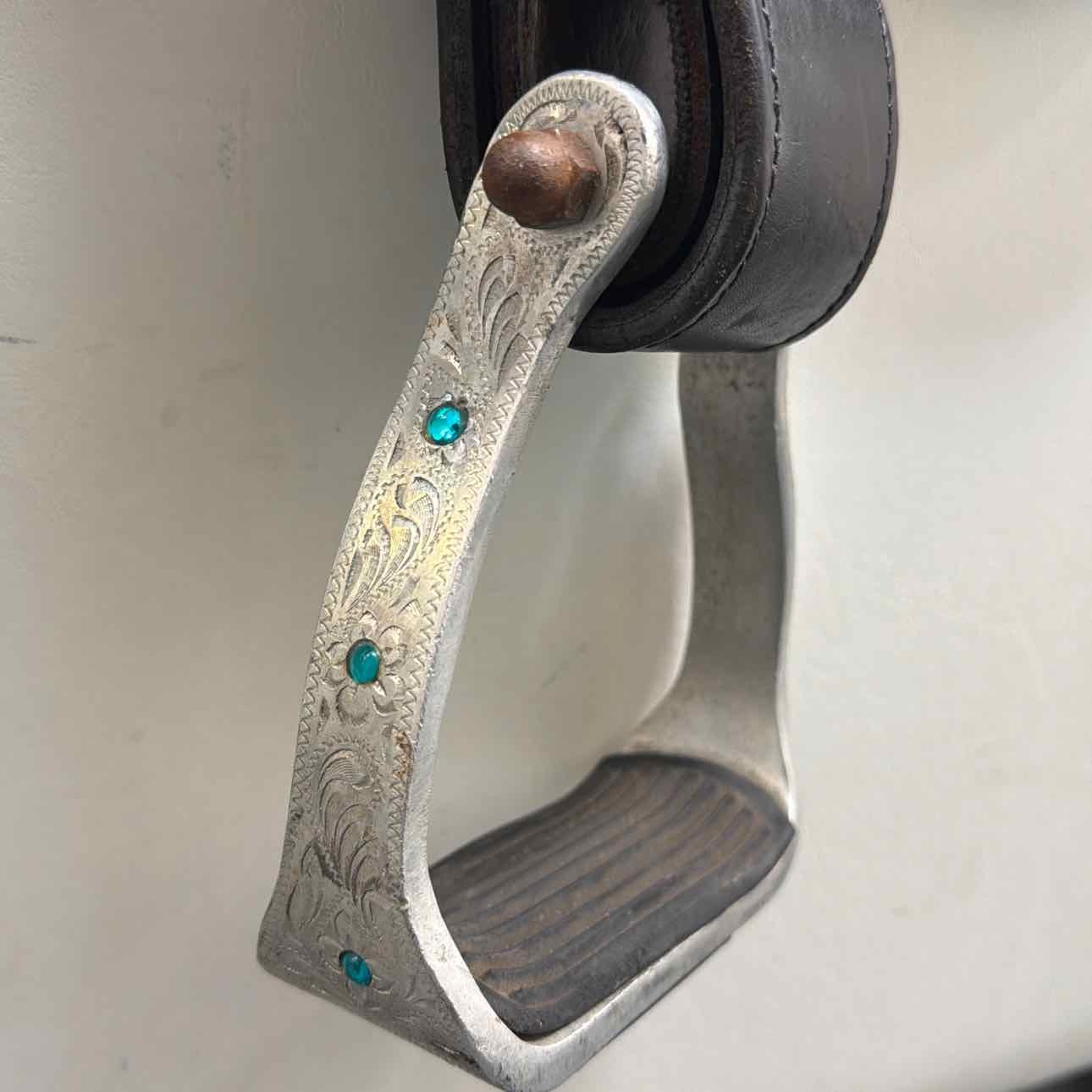 1589 Missouri Trail Gaiter Trail Saddle. Brass Hardware. Aluminum Stirrups with Gems. 2020. 3-Way Adjustable In-Skirt Rigging. Nylon Latigos on Both Sides. Softee Padded Seat.