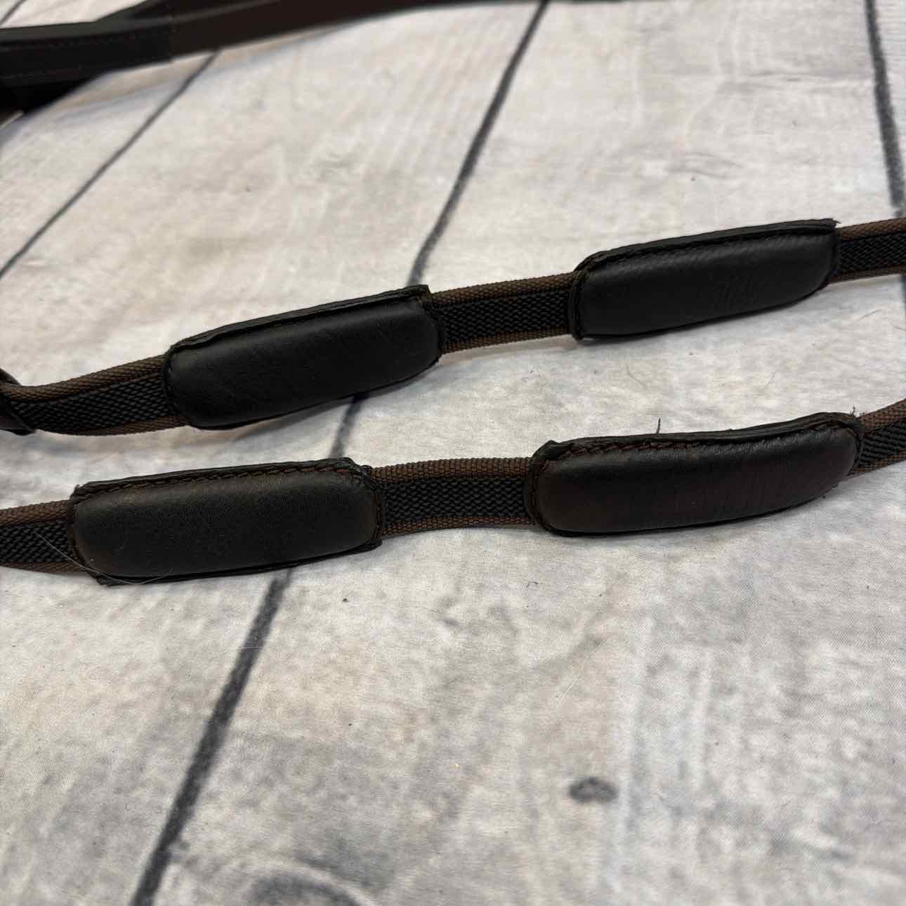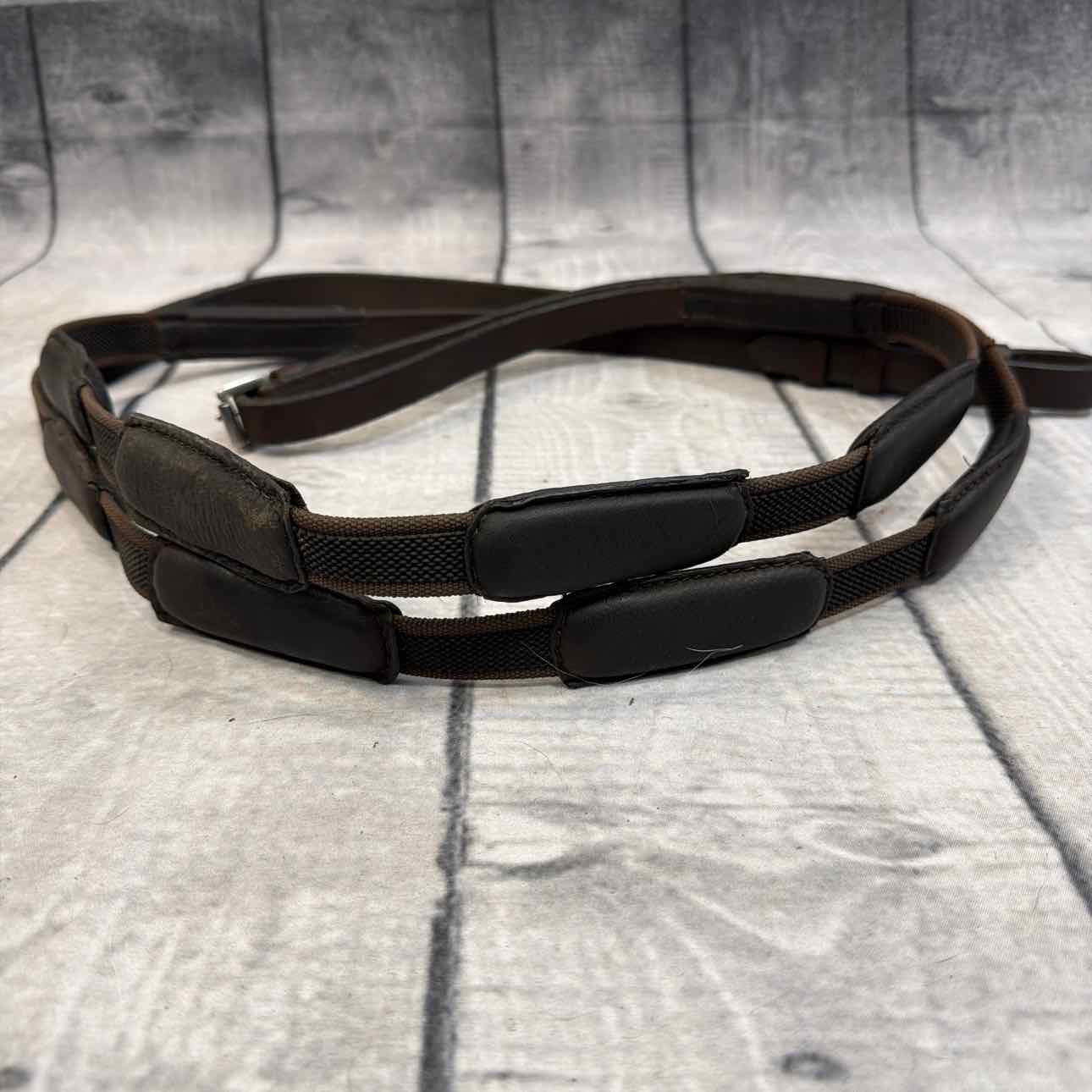 Comfort Connect Rein. Intermittent Padding for Equal Rein Length and Hand Support. Buckle Ends. Stainless Steel Hardware.
