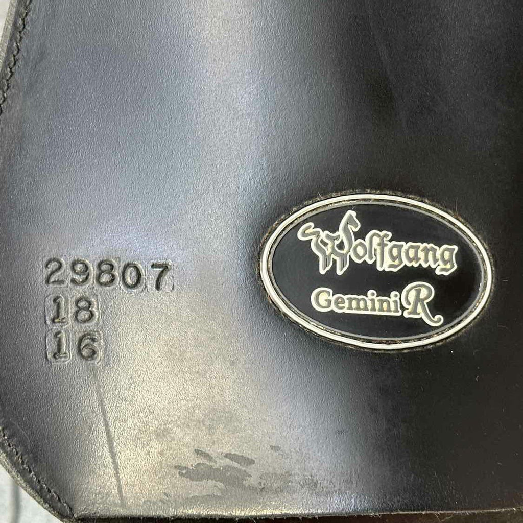 Wolfgang Gemini R Monoflap Dressage Saddle. Stamped 18", but Seat Measures 17.5". M/MW (measures 5") 16" Flap. No Cover. Very Good Condition.
