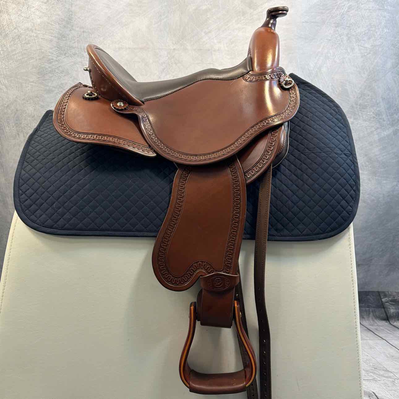 1016 Quantum Western WDS Short & Light with Square Skirt. Short Fenders. Wooden Visalia Stirrups. BT23 Tooling. Nappa Brown Seat. 2025. English-Style Rigging. Fully Adjustable with Key. Includes Matching DP Size 2 Girth, Cover & Key. Excellent Condition.