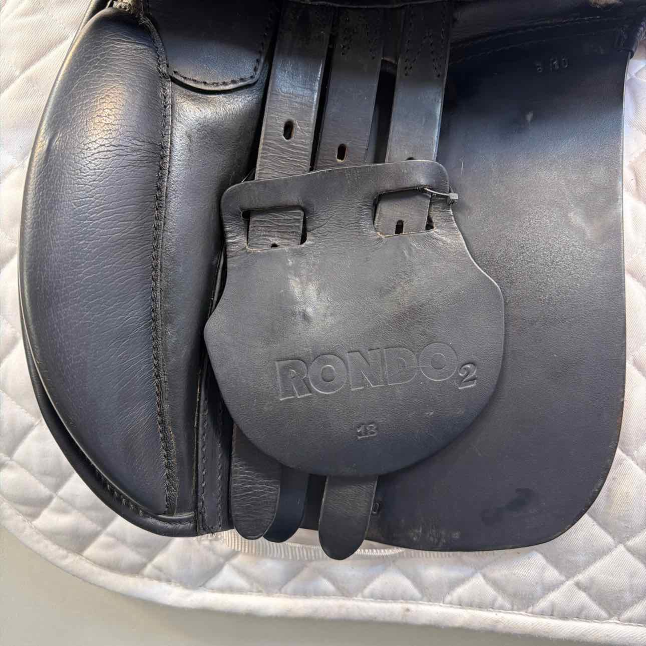 Rondo 2 All Purpose Saddle. Hoop Tree. XW (measures 6.5"). Flap 13.5". No Cover. Older Saddle, but Great Starter Saddle for Wide Pony/Horse. Left Button Missing Color.