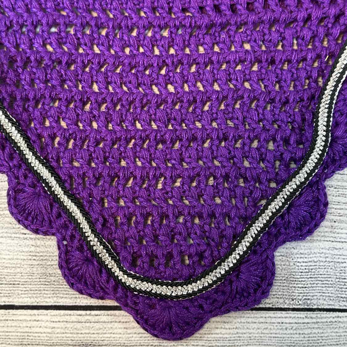 Crochet Ear Bonnet with Silver and Black Trim. Has Throat Latch Cord and Loop. Knit Ears. Very Good Condition.