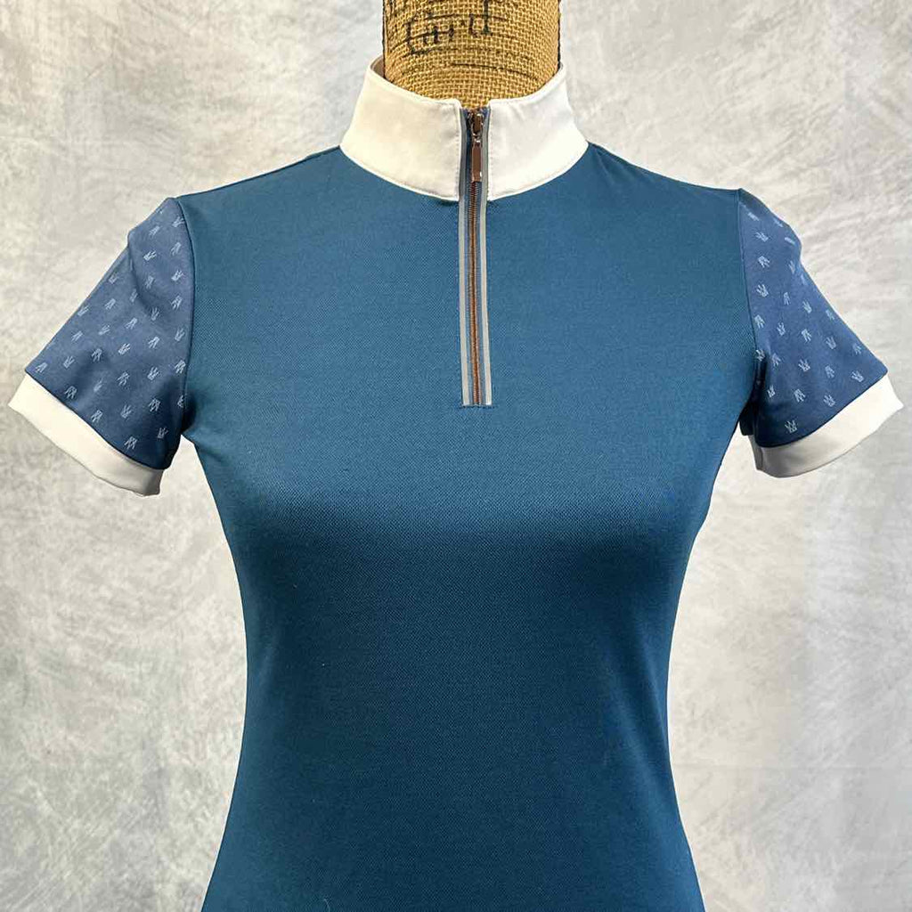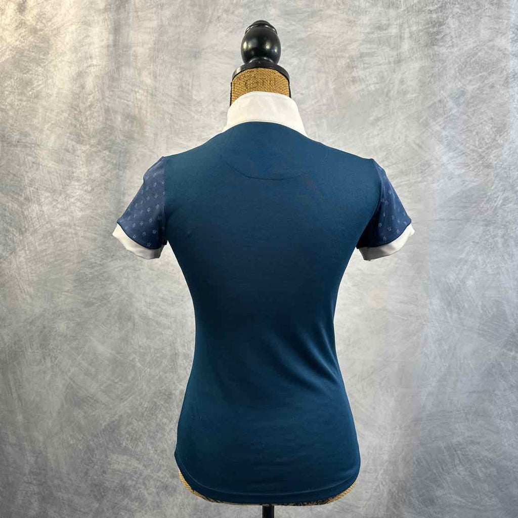 Short Sleeve Show Shirt with White Collar and Sleeve Caps. Dark Blue/Green Color. Very Good Condition.