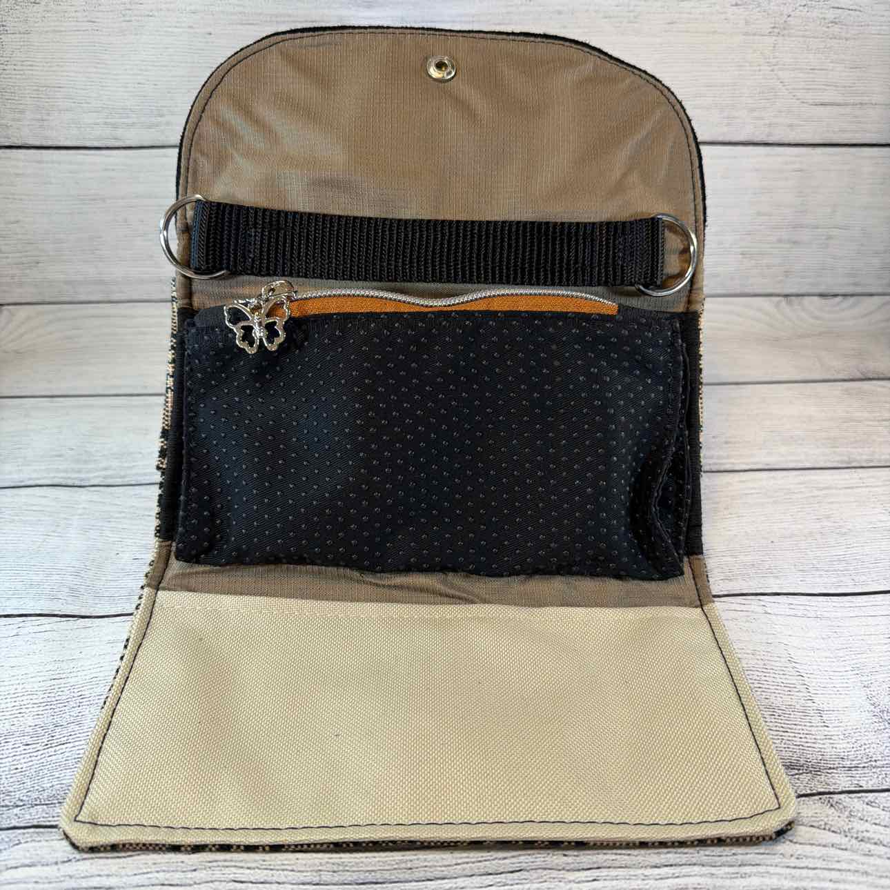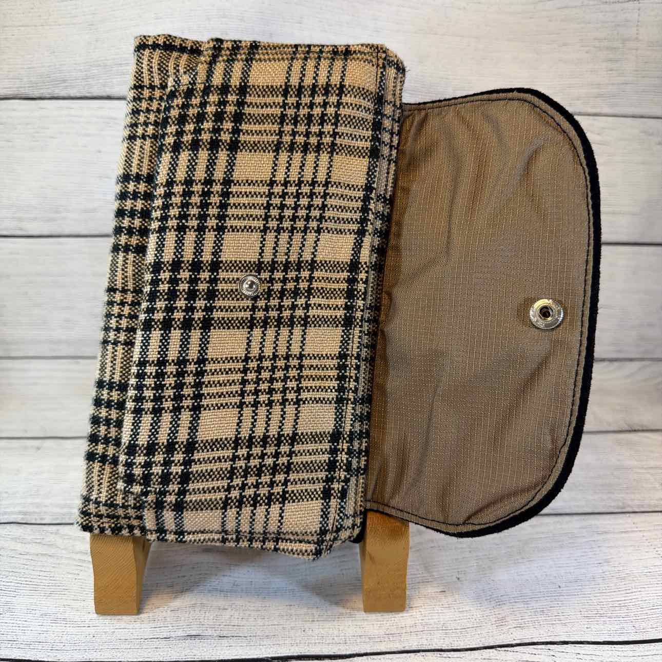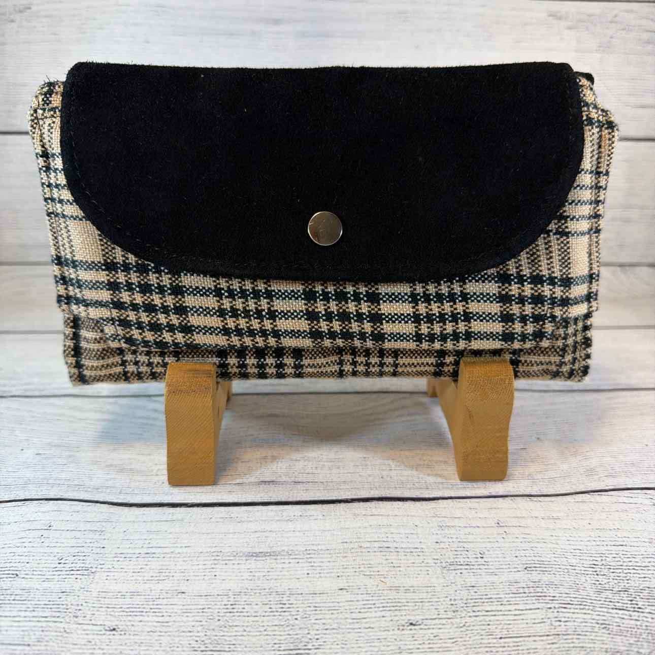 Custom Made Wallet/Shoulder Bag. Made from Baker Blankets, Suede and Faux Leather. Tan Baker Plaid with Black Suede Flap with Snaffle Bit & Dots. Inside Pouches are Black with Raised Dots with Silver Butterfly Zippers. Black Nylon Shoulder Strap.
