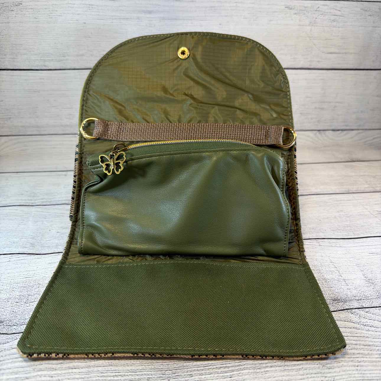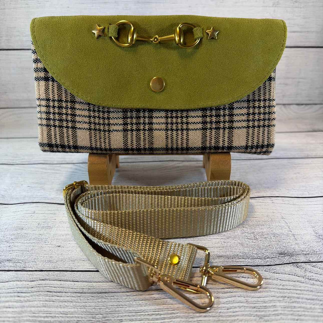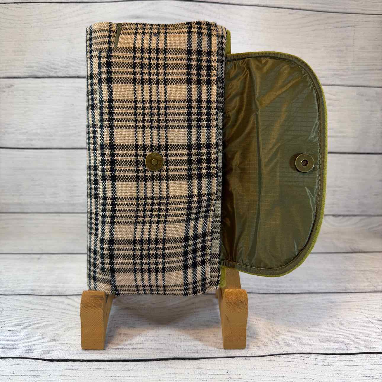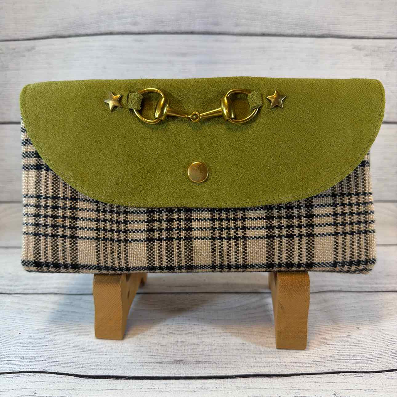 Custom Made Wallet/Shoulder Bag. Made from Baker Blankets, Suede and Faux Leather. Tan Baker Plaid with Black Suede Flap with Snaffle Bit & Stars. Inside Pouches are Green with Antique Bronze Butterfly Zippers. Tan Nylon Shoulder Strap.