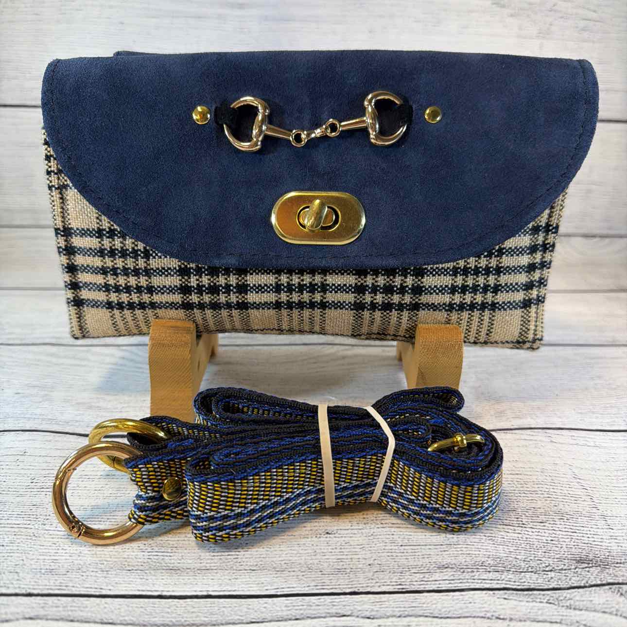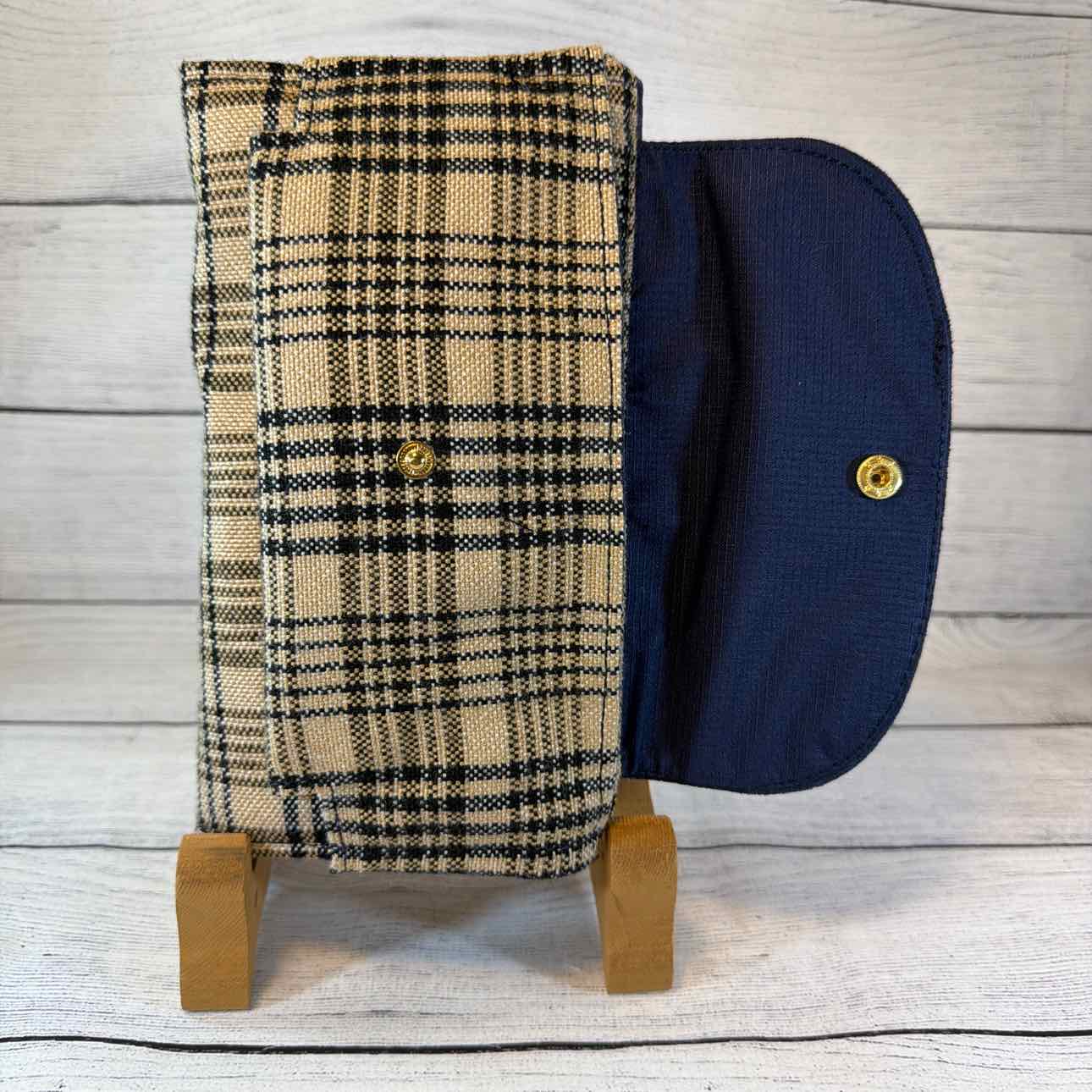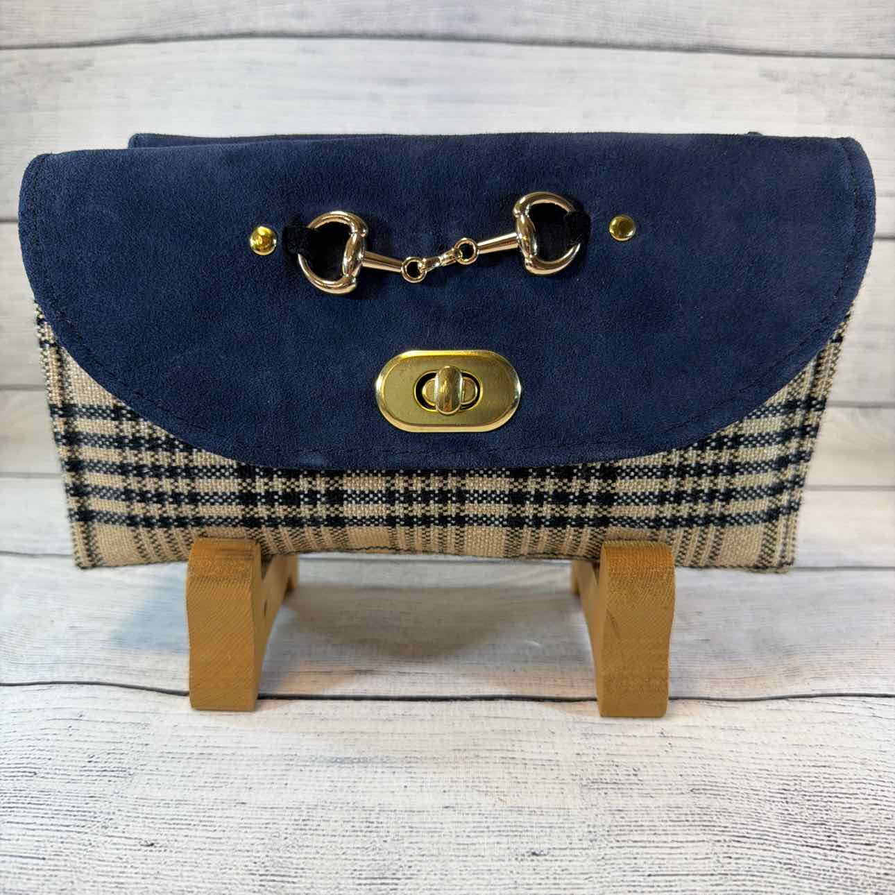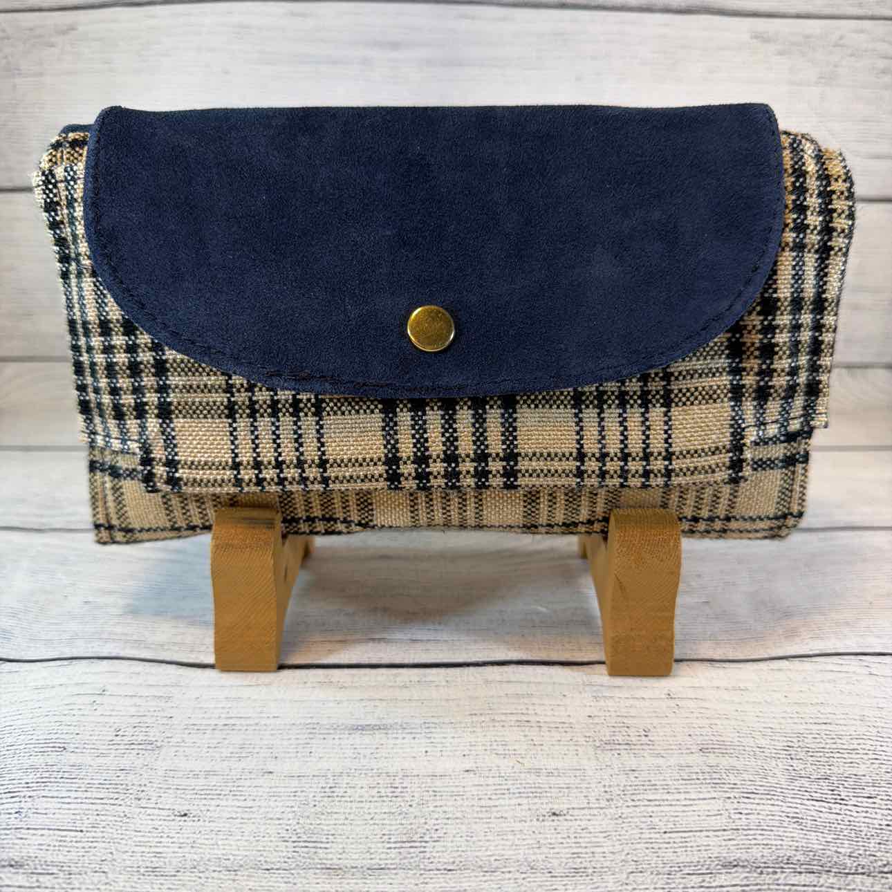Custom Made Wallet/Shoulder Bag. Made from Baker Blanket, Suede and Faux Leather. Tan Baker Plaid with Navy Suede Flap with Snaffle Bit & Dots. Inside Pouches are Light Yellow with Silver Butterfly Zippers. Baker Blanket Edging Shoulder Strap.