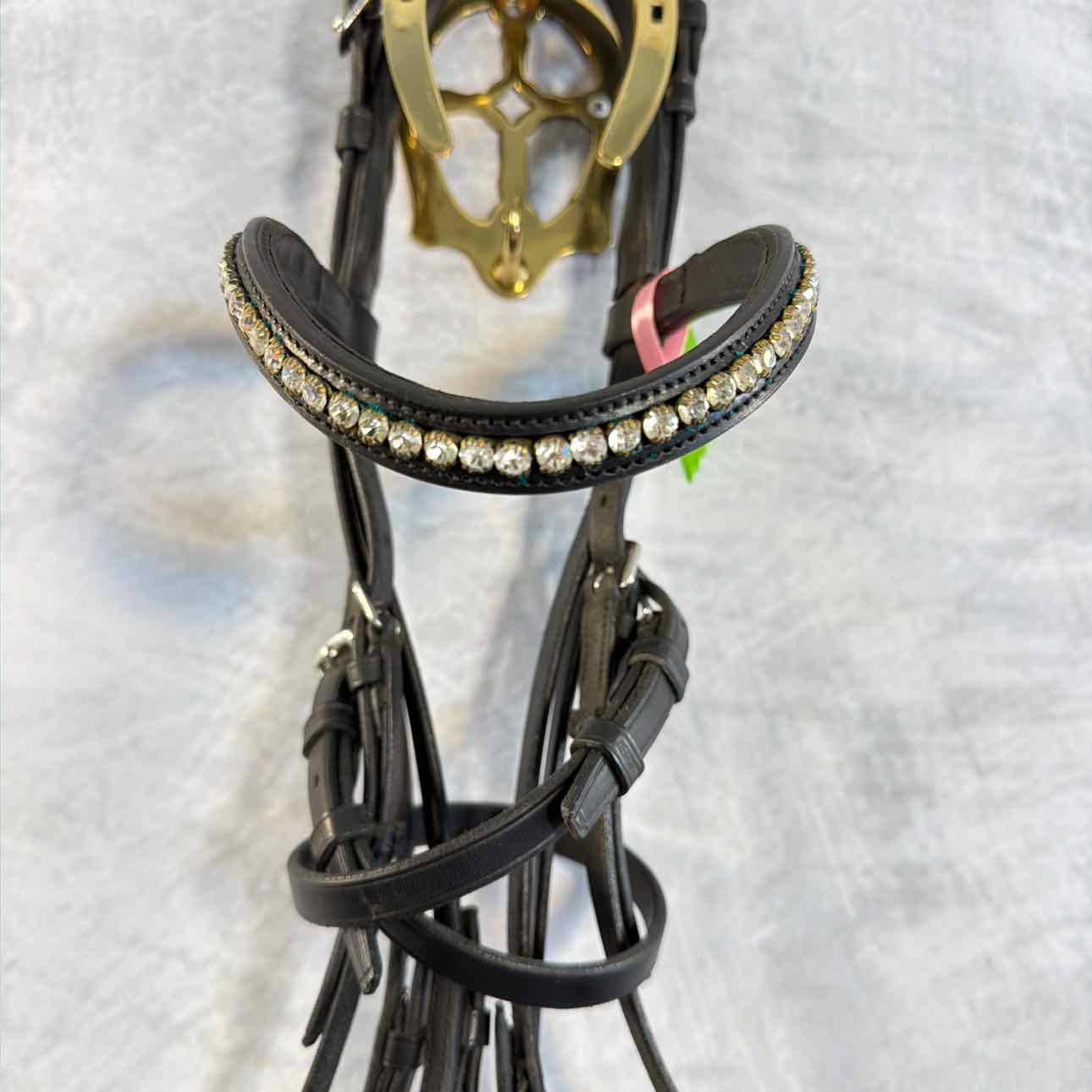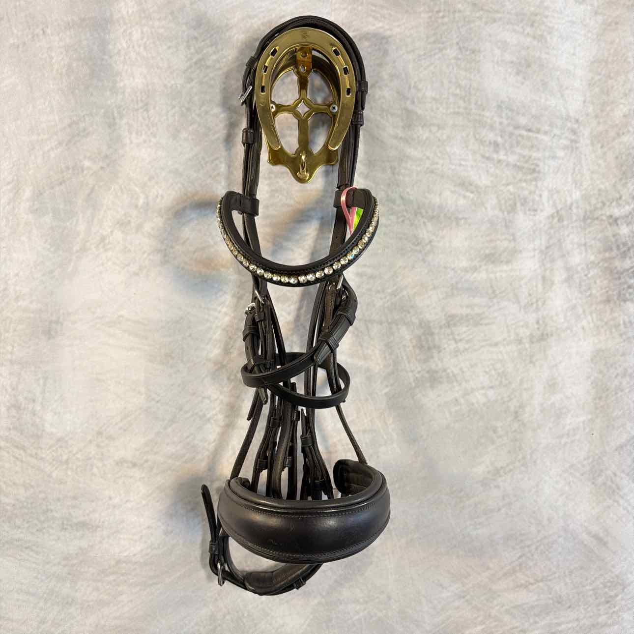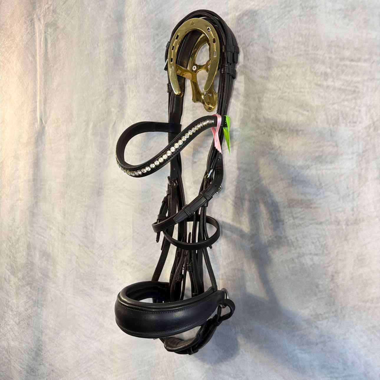 Raised Double Bridle with Padded Crank Noseband. Schockemohle Bling Browband. Used, but Great Condition. Bit Hangers have Hook Stud Ends.