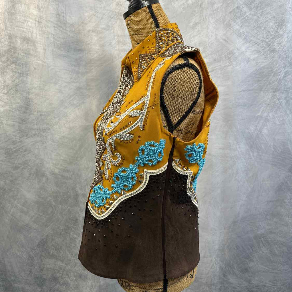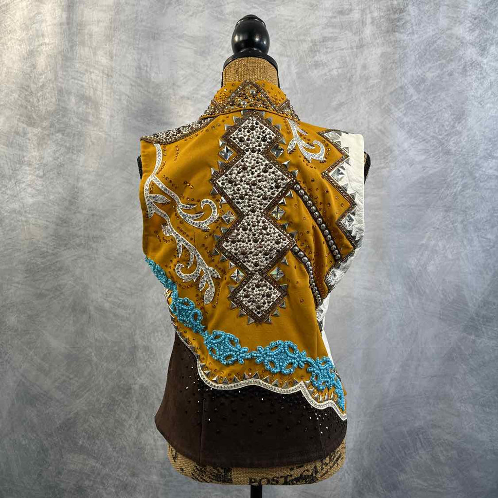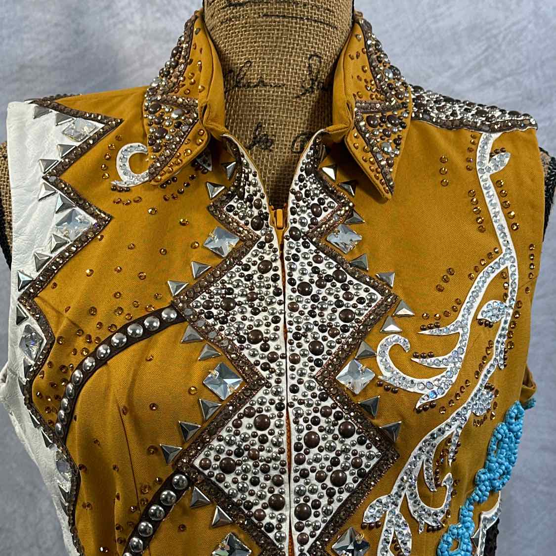 Custom Western Show Vest with Matching White Shirt. Mustard Yellow, Gold, Brown, Cream Vest with Turquoise Stones, Crystals & Geometric Bling. White Shirt has Gold & Silver Bling on Collar and Cuffs. Vest has Narrow Elastic Strip Down Both Sides. Minor Pull at Bottom of Side Seam on Left Side (see detail pic).