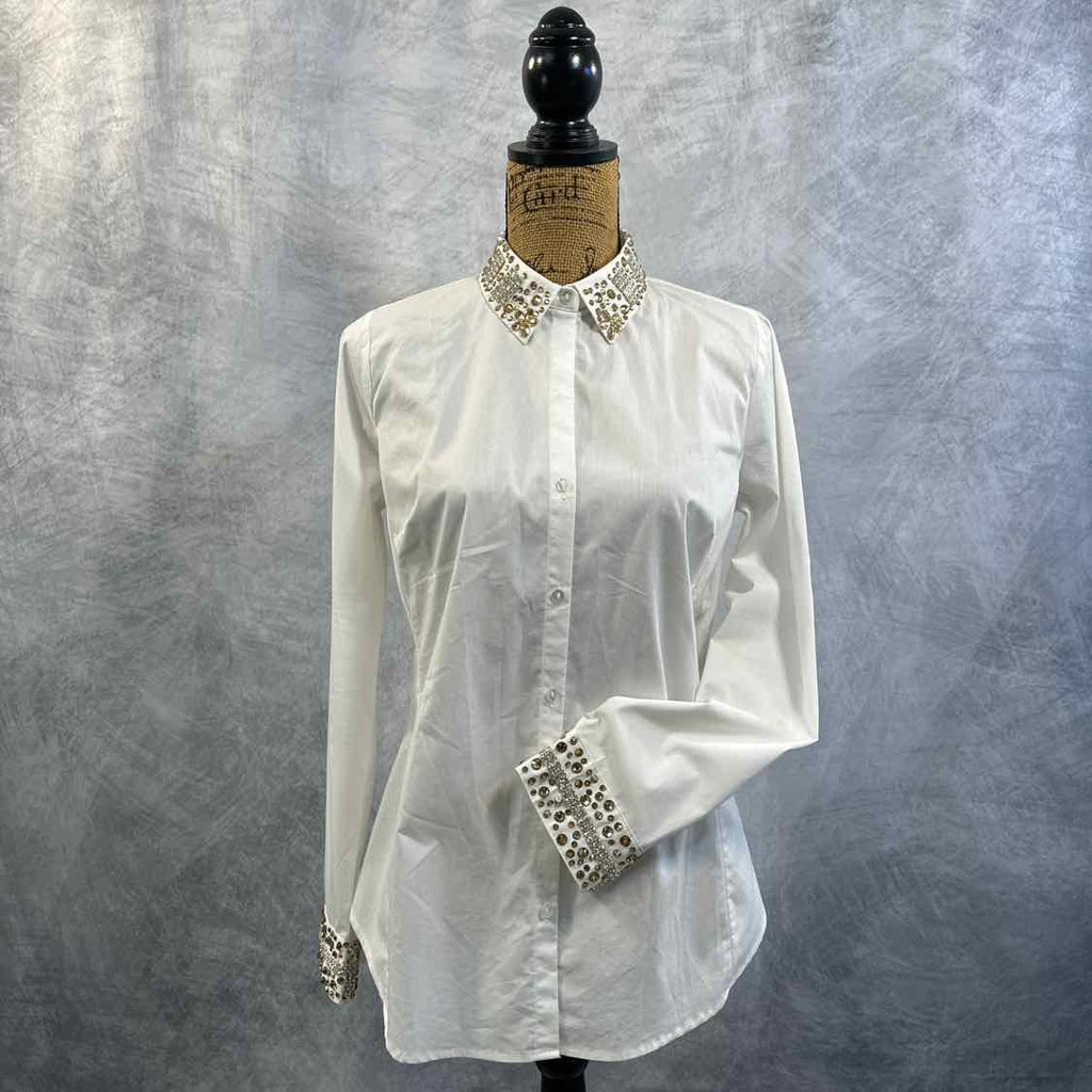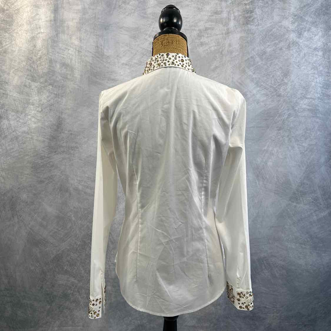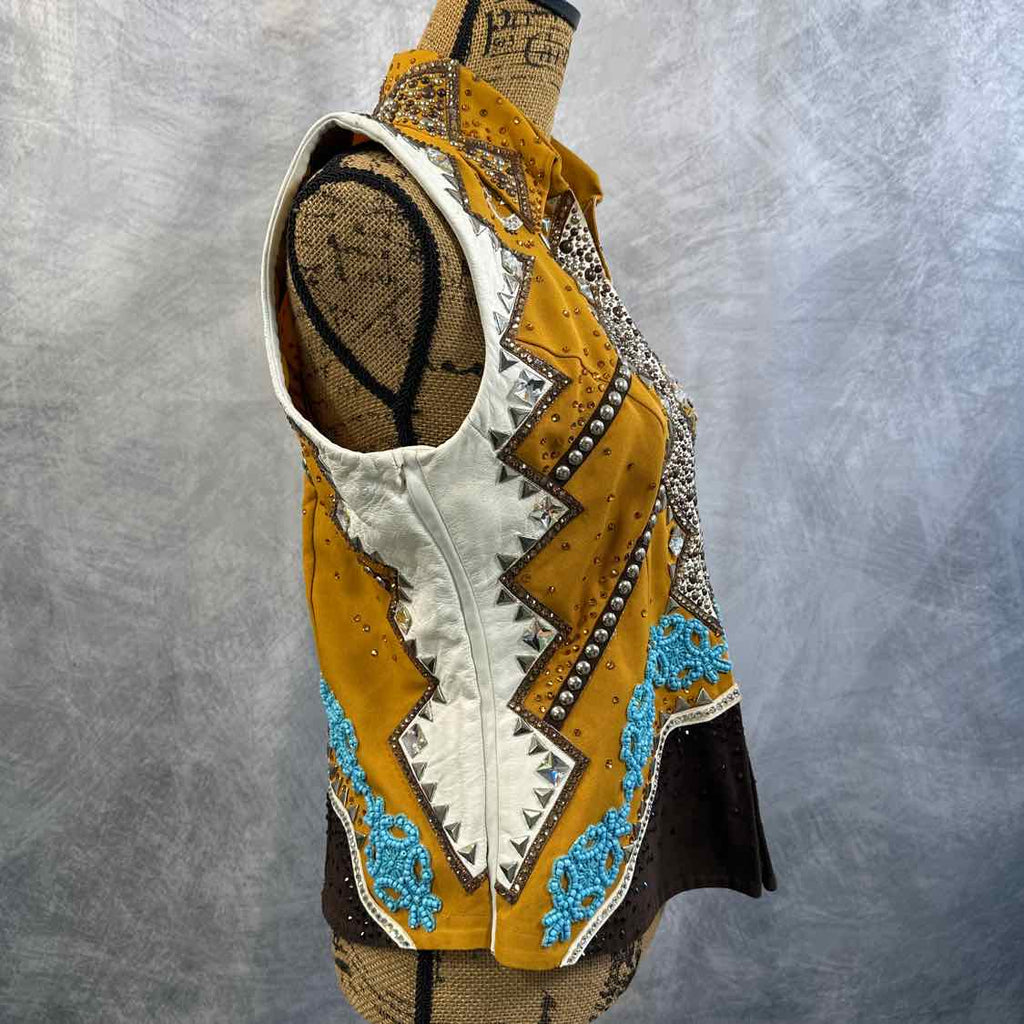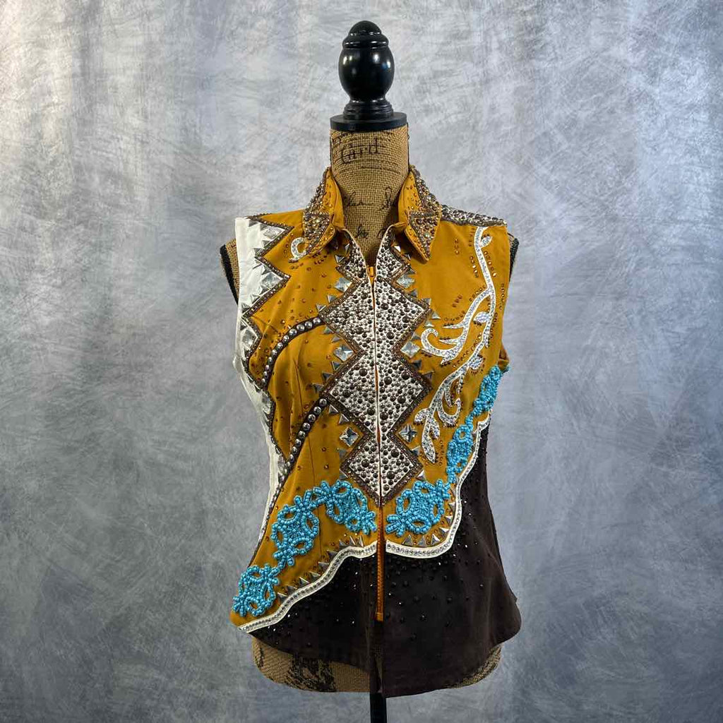 Custom Western Show Vest with Matching White Shirt. Mustard Yellow, Gold, Brown, Cream Vest with Turquoise Stones, Crystals & Geometric Bling. White Shirt has Gold & Silver Bling on Collar and Cuffs. Vest has Narrow Elastic Strip Down Both Sides. Minor Pull at Bottom of Side Seam on Left Side (see detail pic).